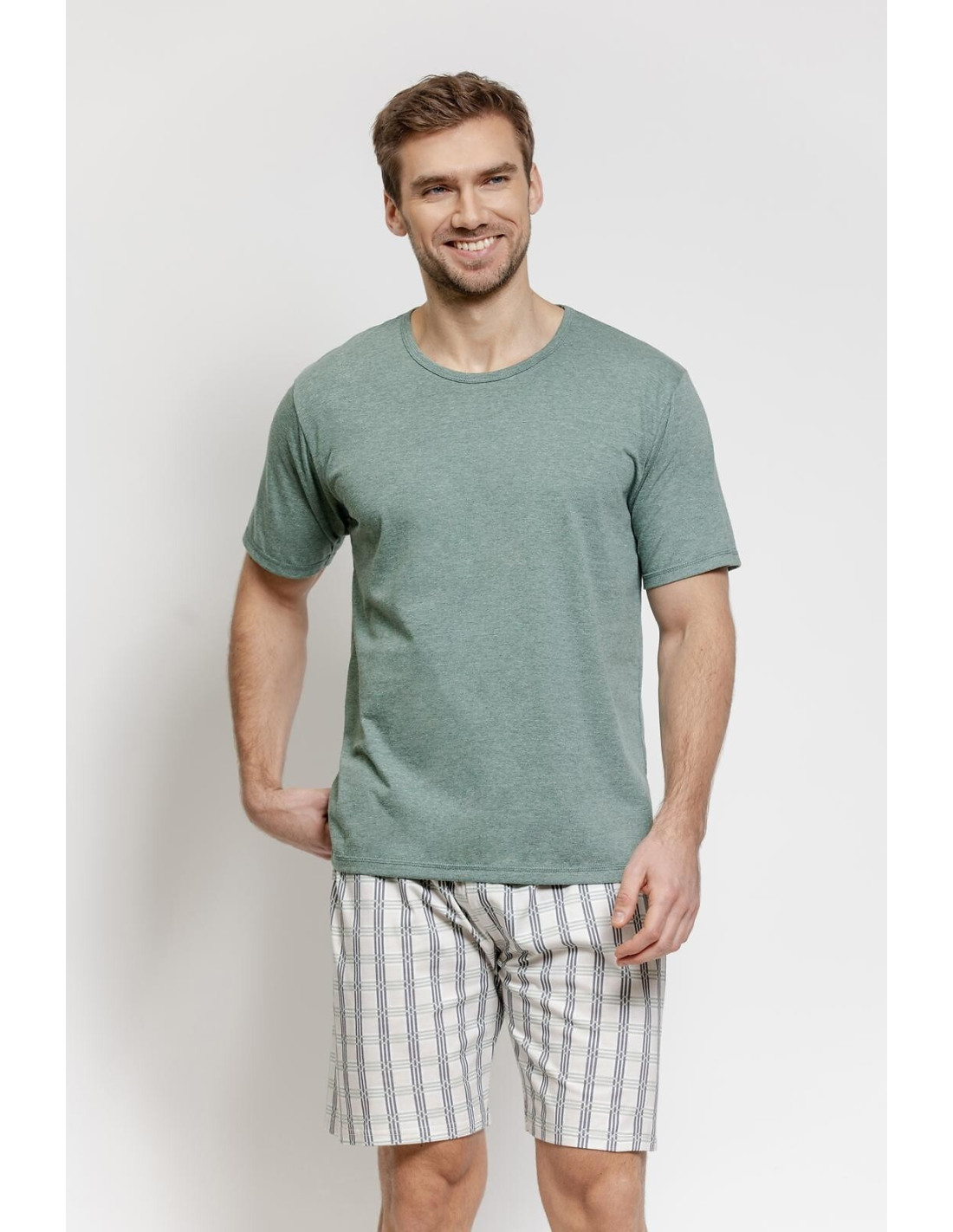 Bawełniana piżama męska - melanżowa koszulka z krótkim rękawem - półokrągły dekolt - krótkie, wzorzyste spodenki - w pasie gumka obszyta bawełną
