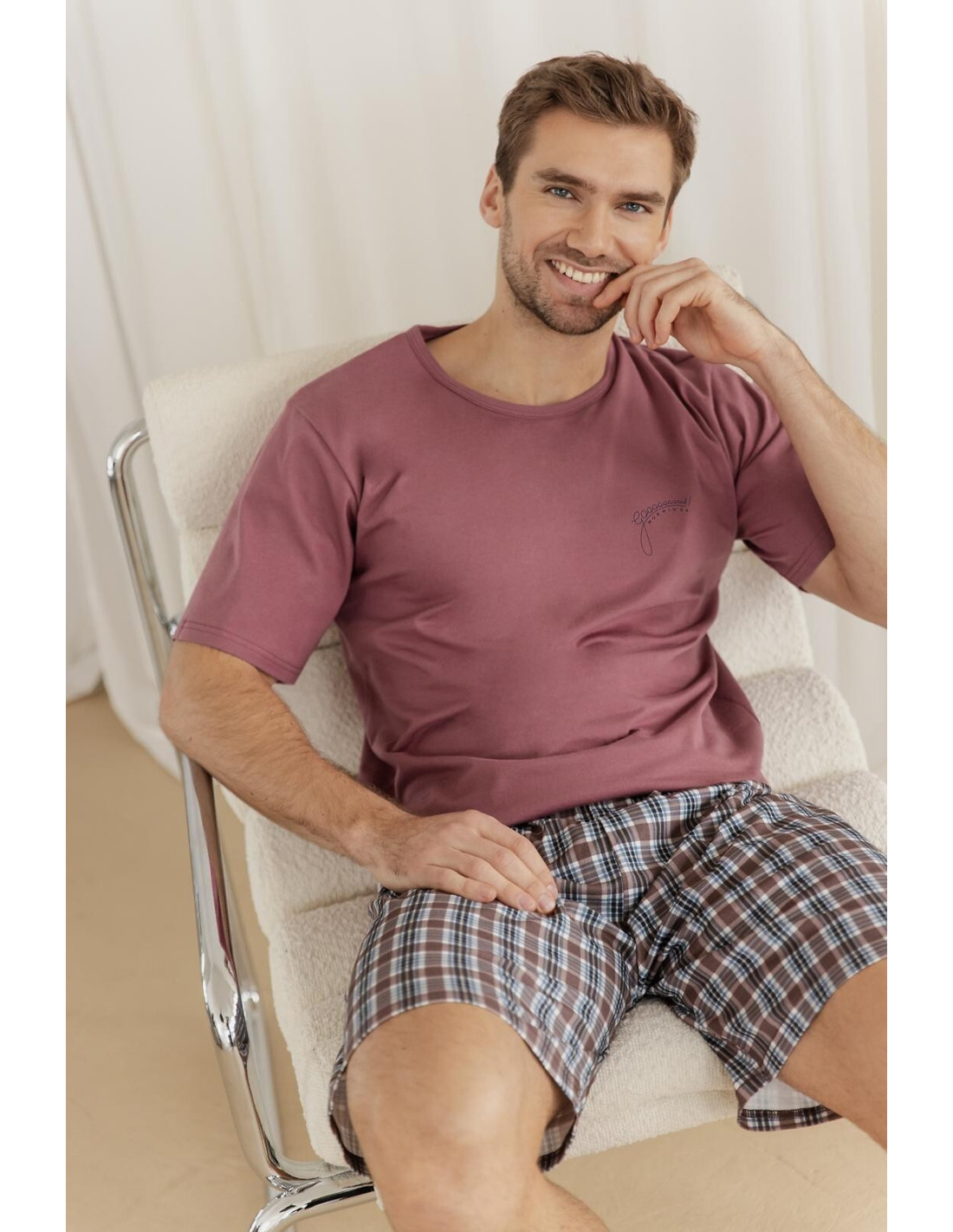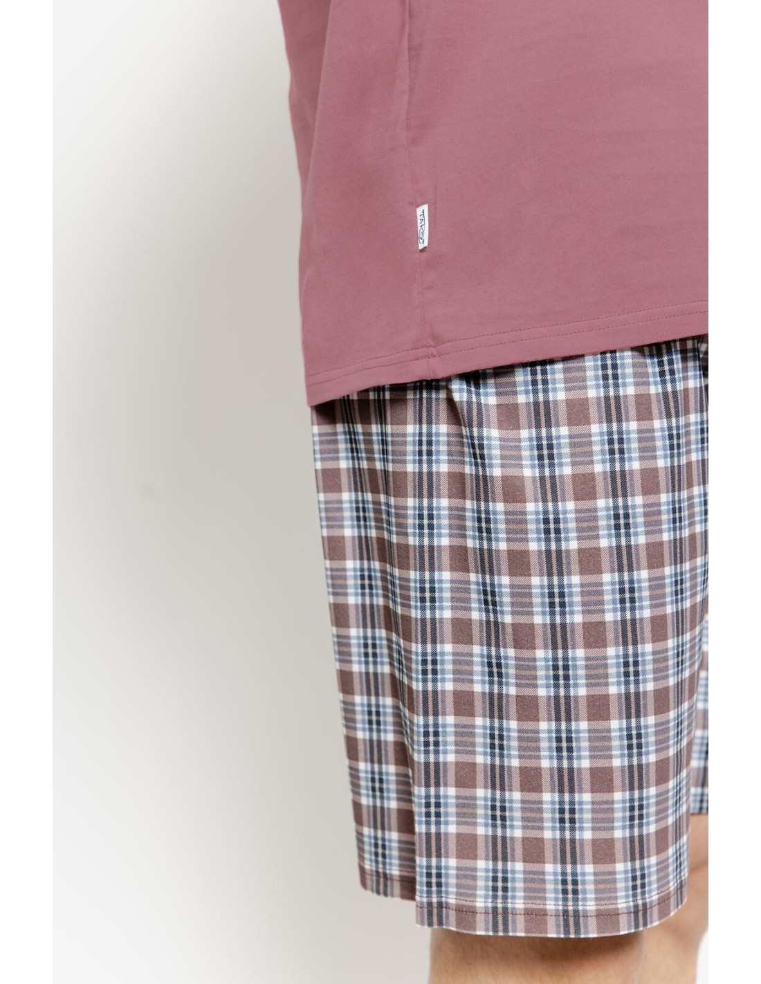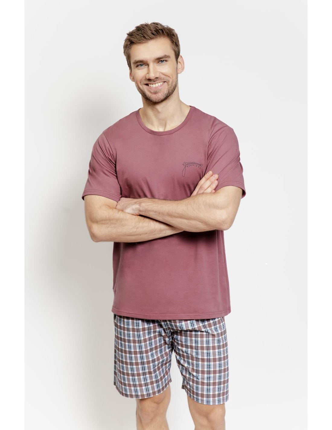 Bawełniana piżama męska - koszulka z krótkim rękawem - półokrągły dekolt - na piersi mały nadruk - krótkie spodenki w kratkę - w pasie wygodna gumka