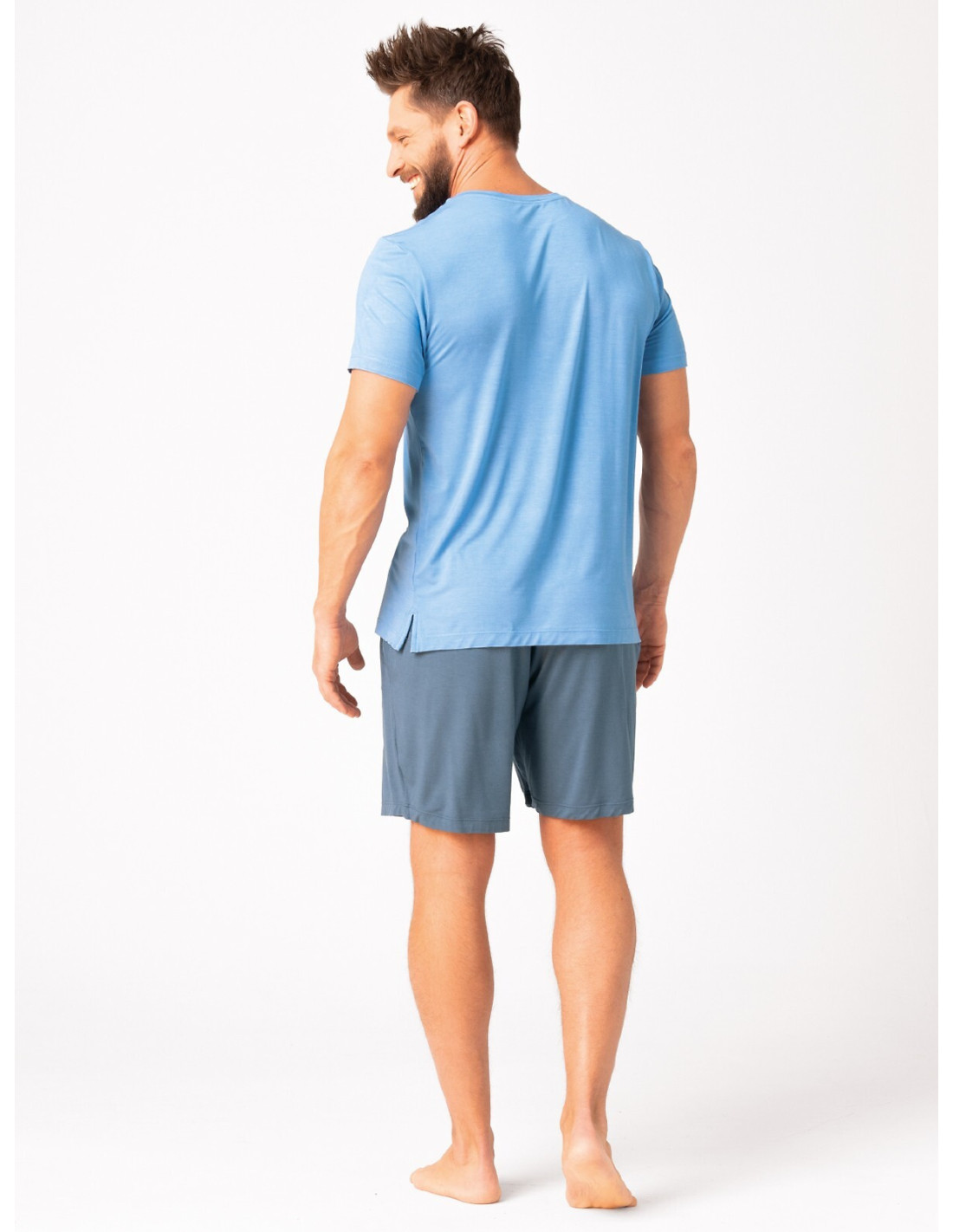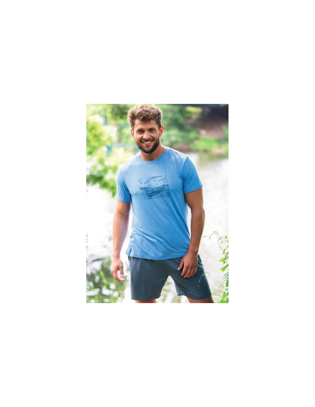 Piżama męska - aukštos kokybės włókno bambusowe - koszulka z krótkim rękawem - dekolt półokrągły - z przodu ozdobny nadruk - do kompletu krótkie spodenki - wygodne kieszenie po bokach