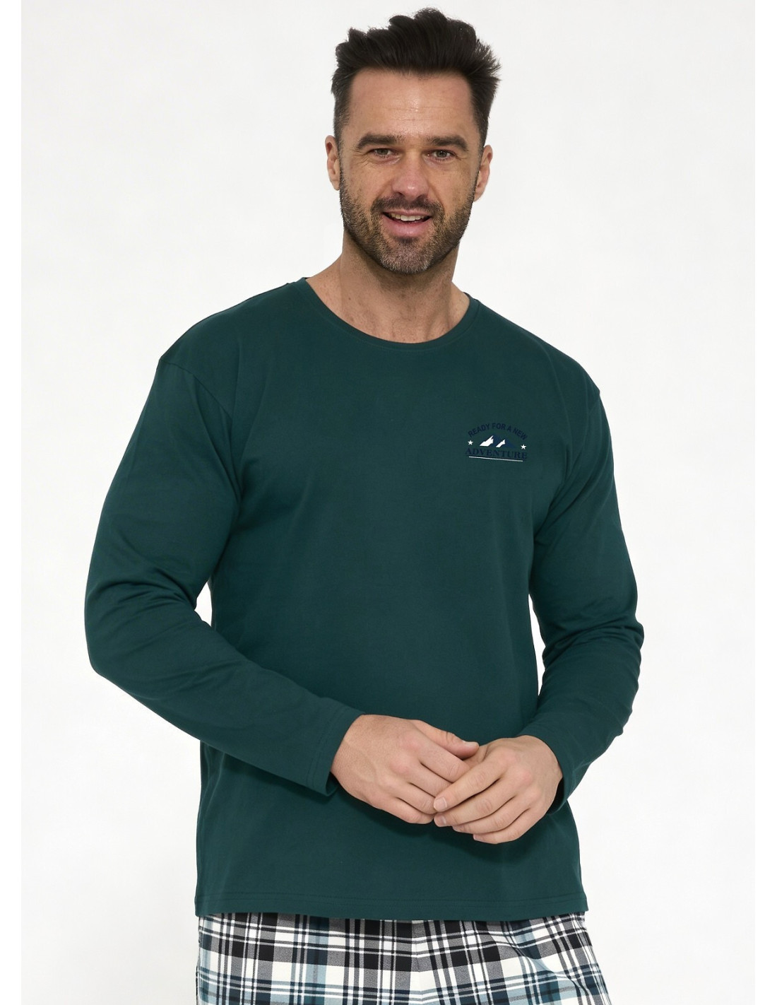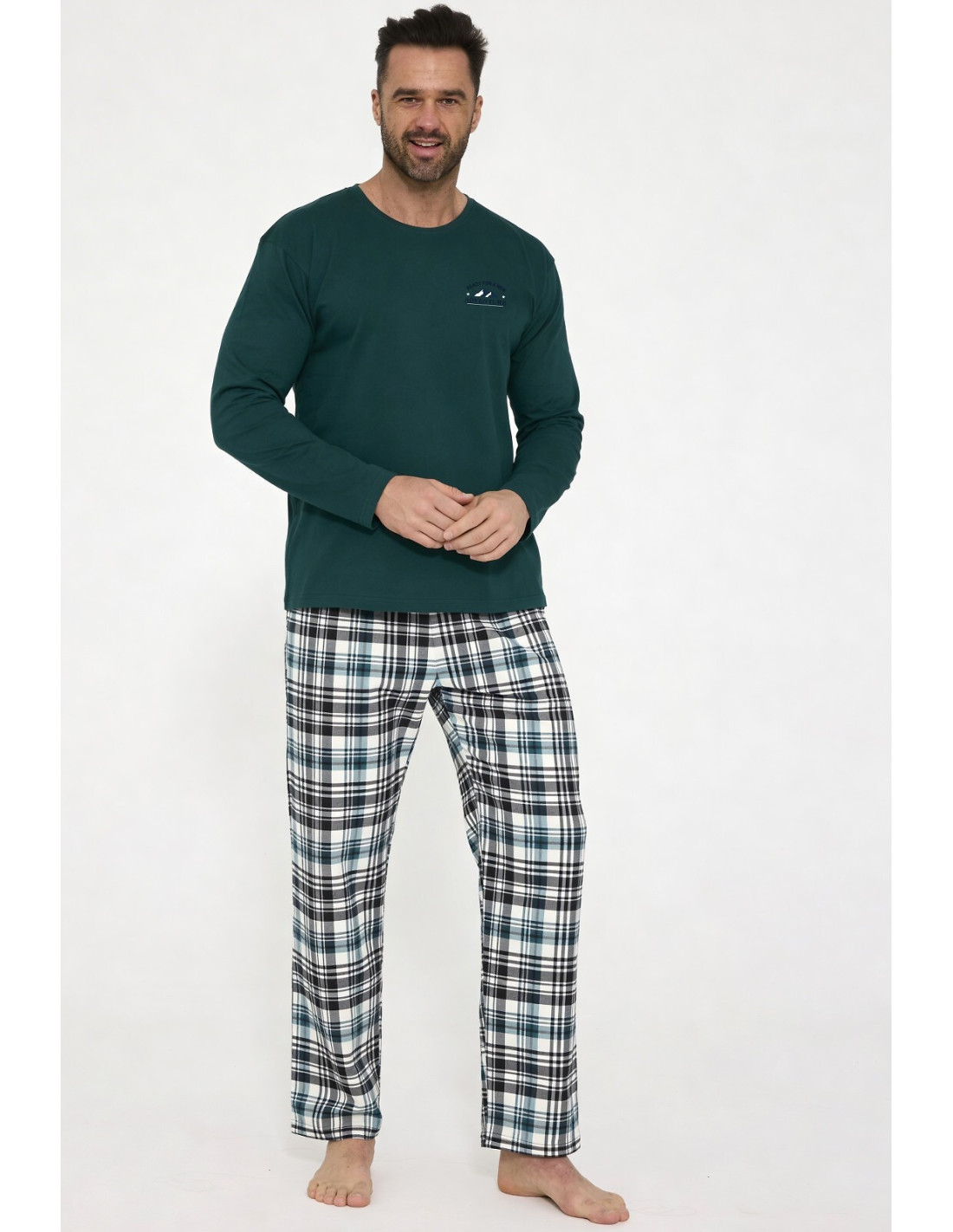 Bawełniana piżama męska - koszulka z długim rękawem - półokrągły dekolt - na piersi mały nadruk - długie spodnie w kratkę - w pasie gumka obszyta bawełną