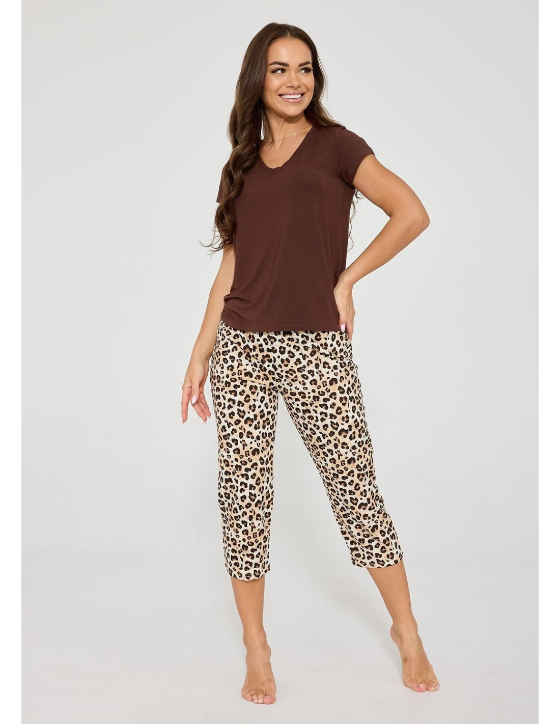 Piżama damska - koszulka jednolita, z miłego modalu - z krótkim rękawem - dekolt "V" - bawełniane spodnie o długości 7/8 - zwierzęcy print w panterkę - pakowana w pudełko