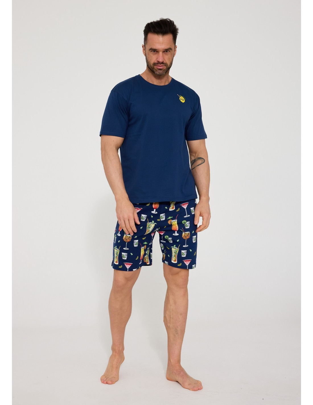 Bawełniana piżama męska - koszulka z krótkim rękawem - półokrągły dekolt - na piersi mały nadruk - krótkie, wzorzyste spodenki - w pasie gumka obszyta bawełną
