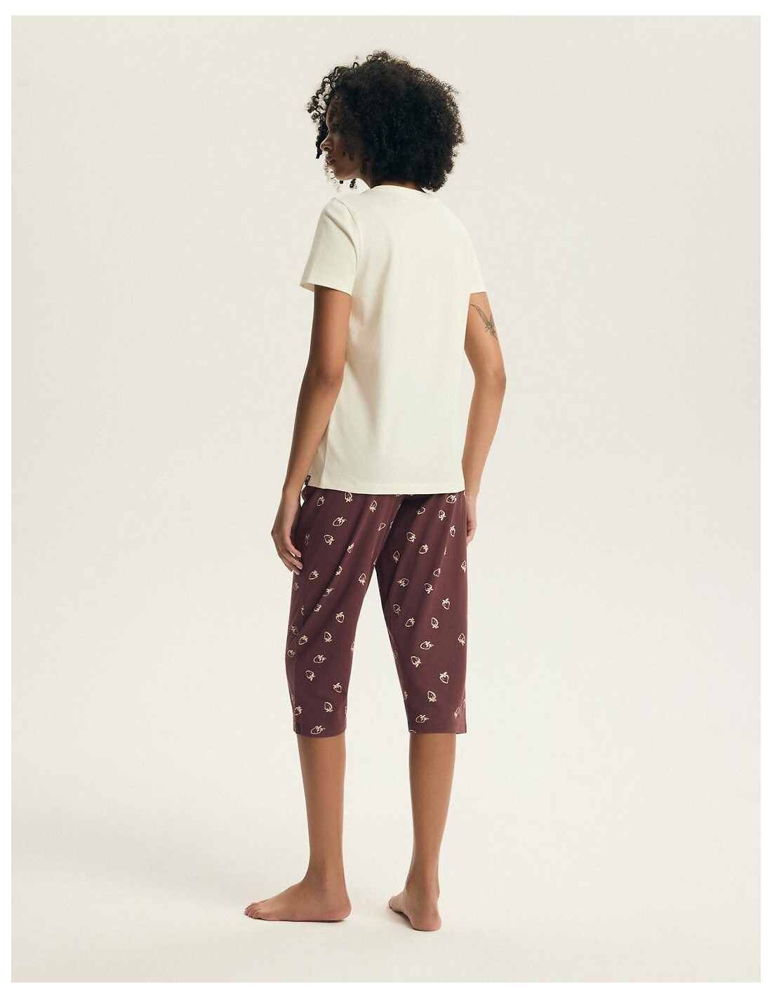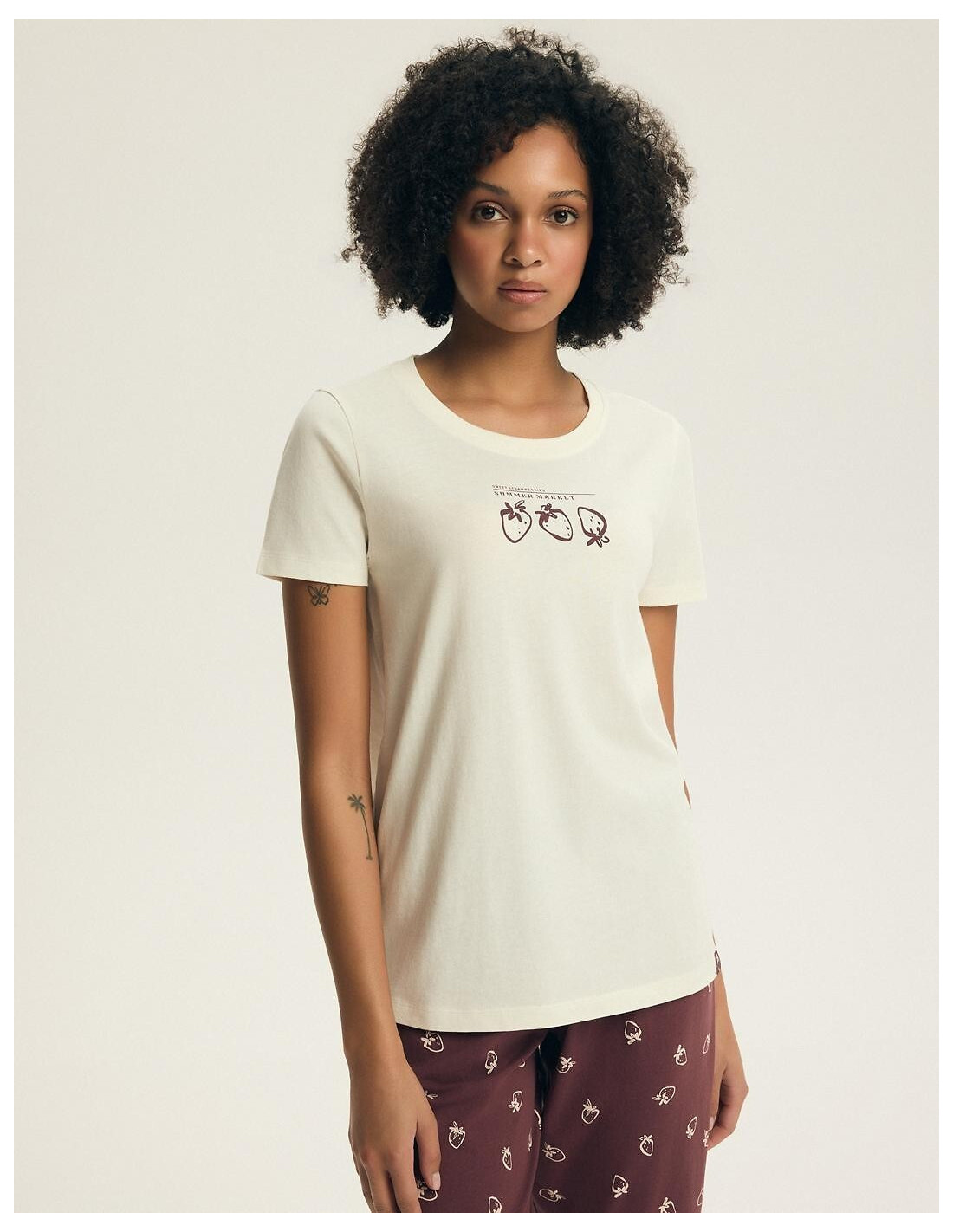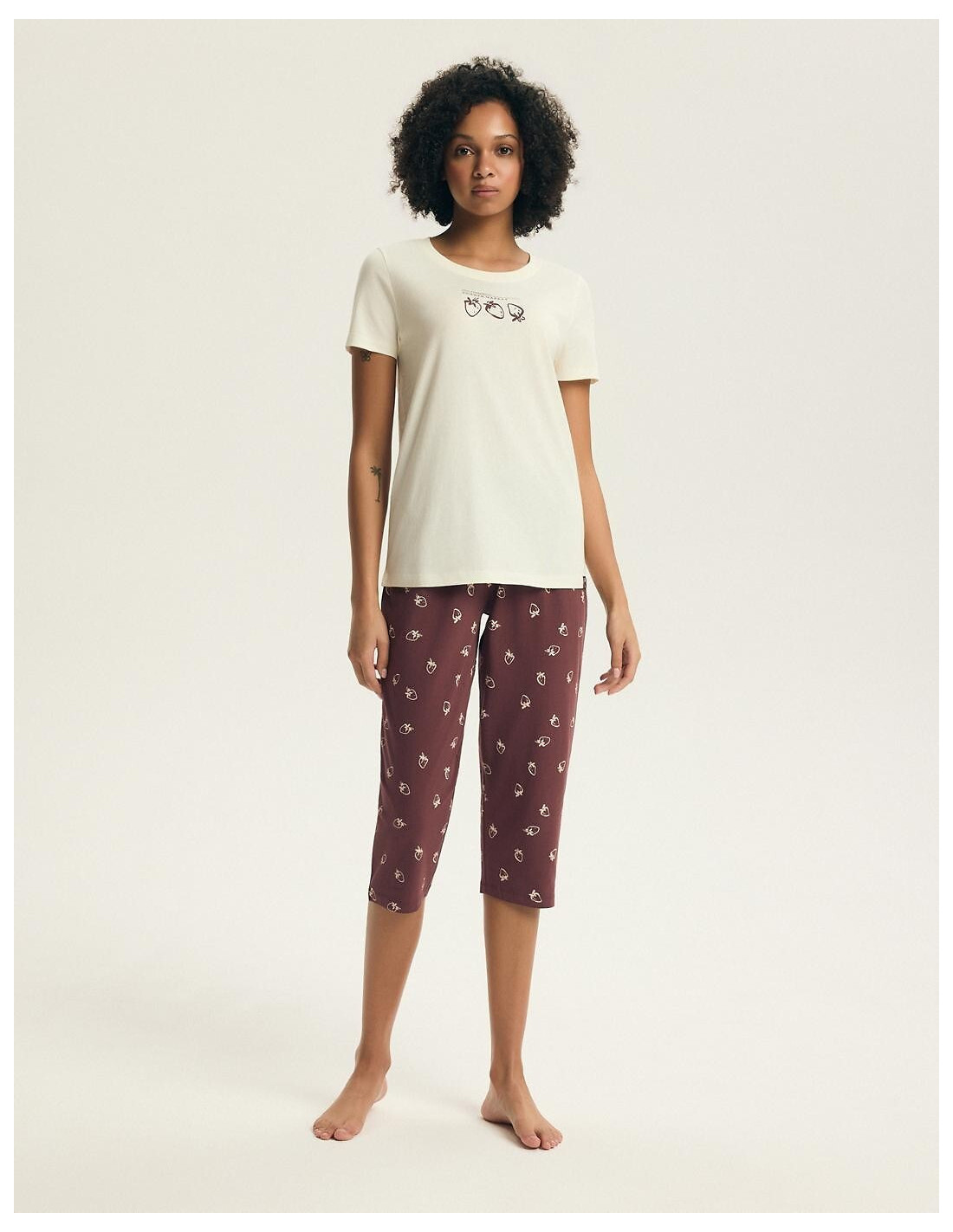 Piżama damska - aukštos kokybės bawełna - koszulka z krótkim rękawem - z przodu print w truskawki - dekolt okrągły - w komplecie wzorzyste spodnie, długość 3/4 - w pasie wygodna gumka - pakowana w foliowy worek