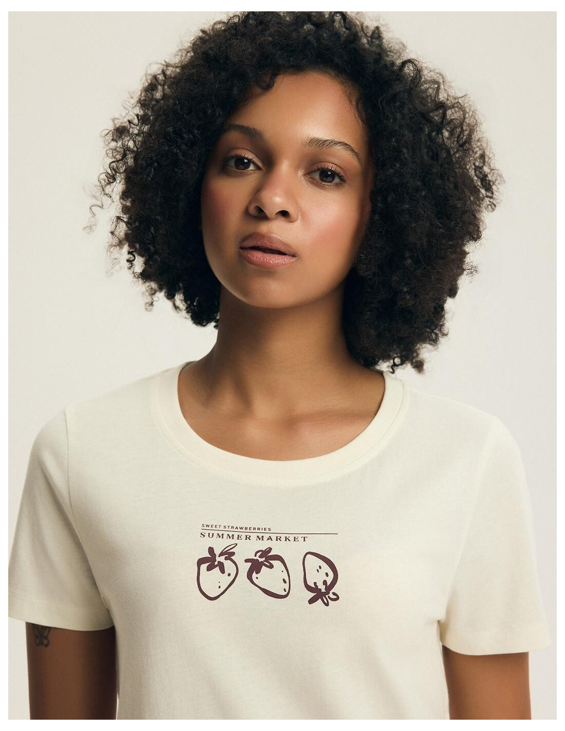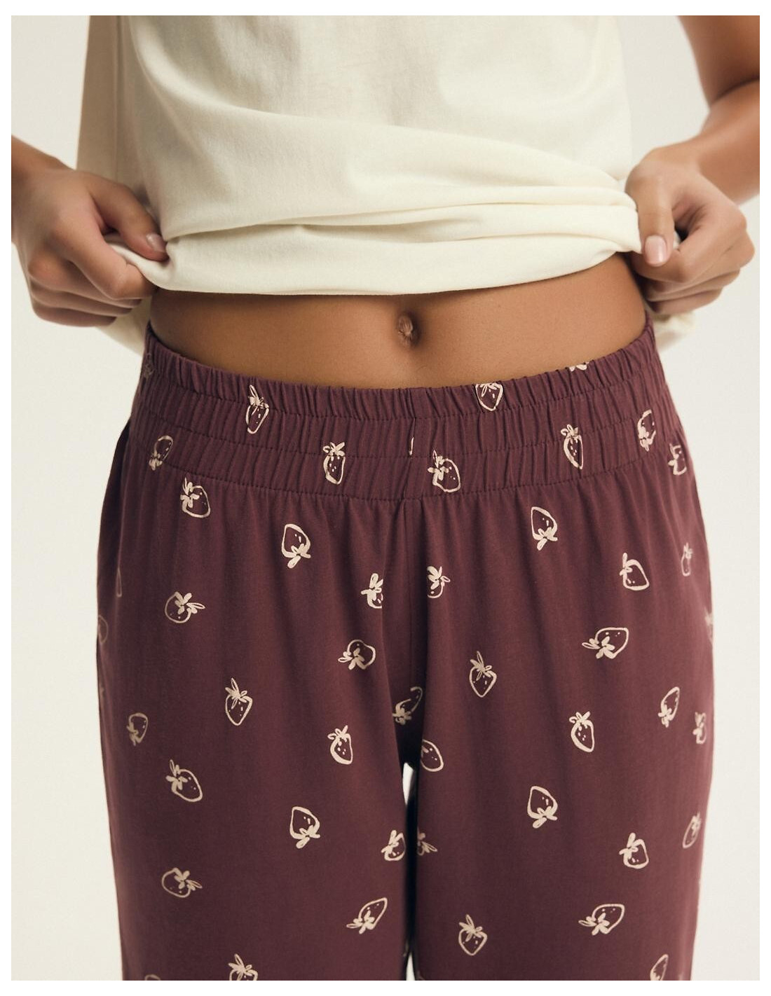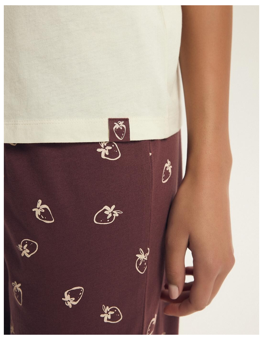 Piżama damska - aukštos kokybės bawełna - koszulka z krótkim rękawem - z przodu print w truskawki - dekolt okrągły - w komplecie wzorzyste spodnie, długość 3/4 - w pasie wygodna gumka - pakowana w foliowy worek
