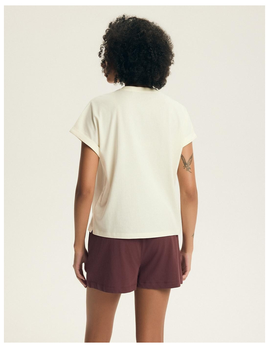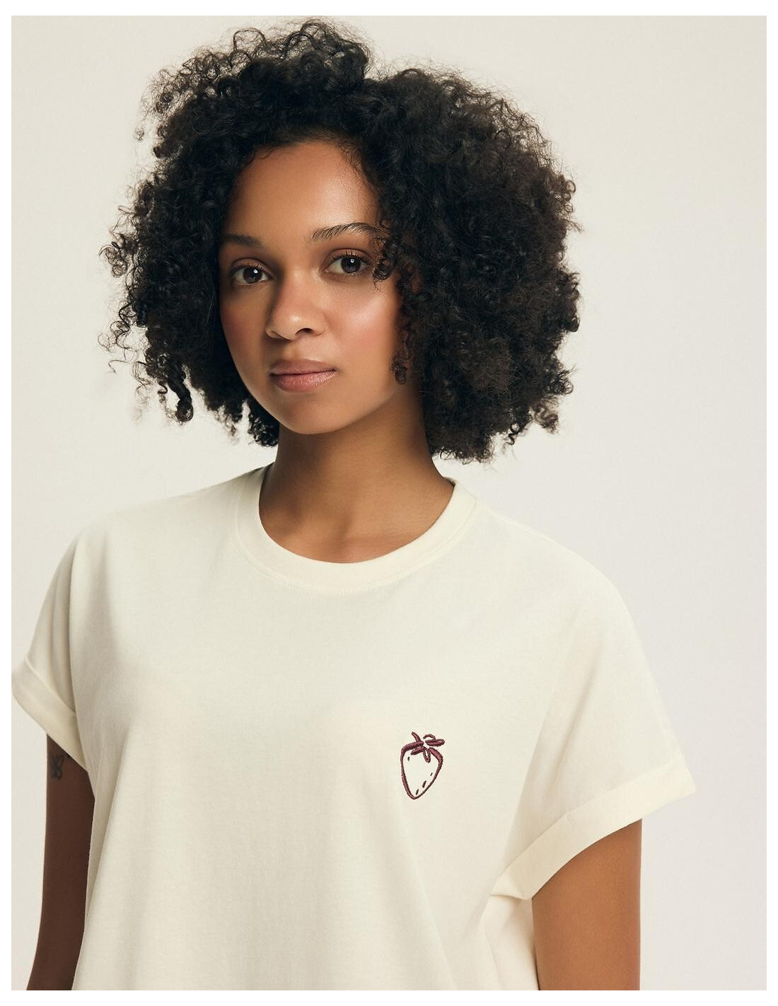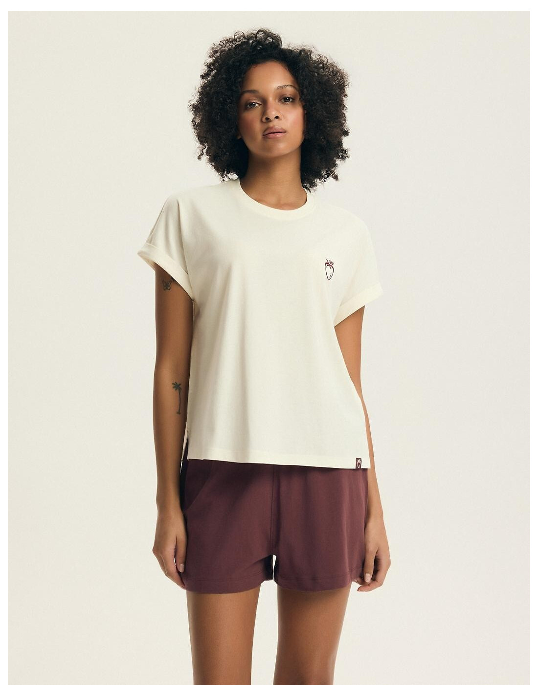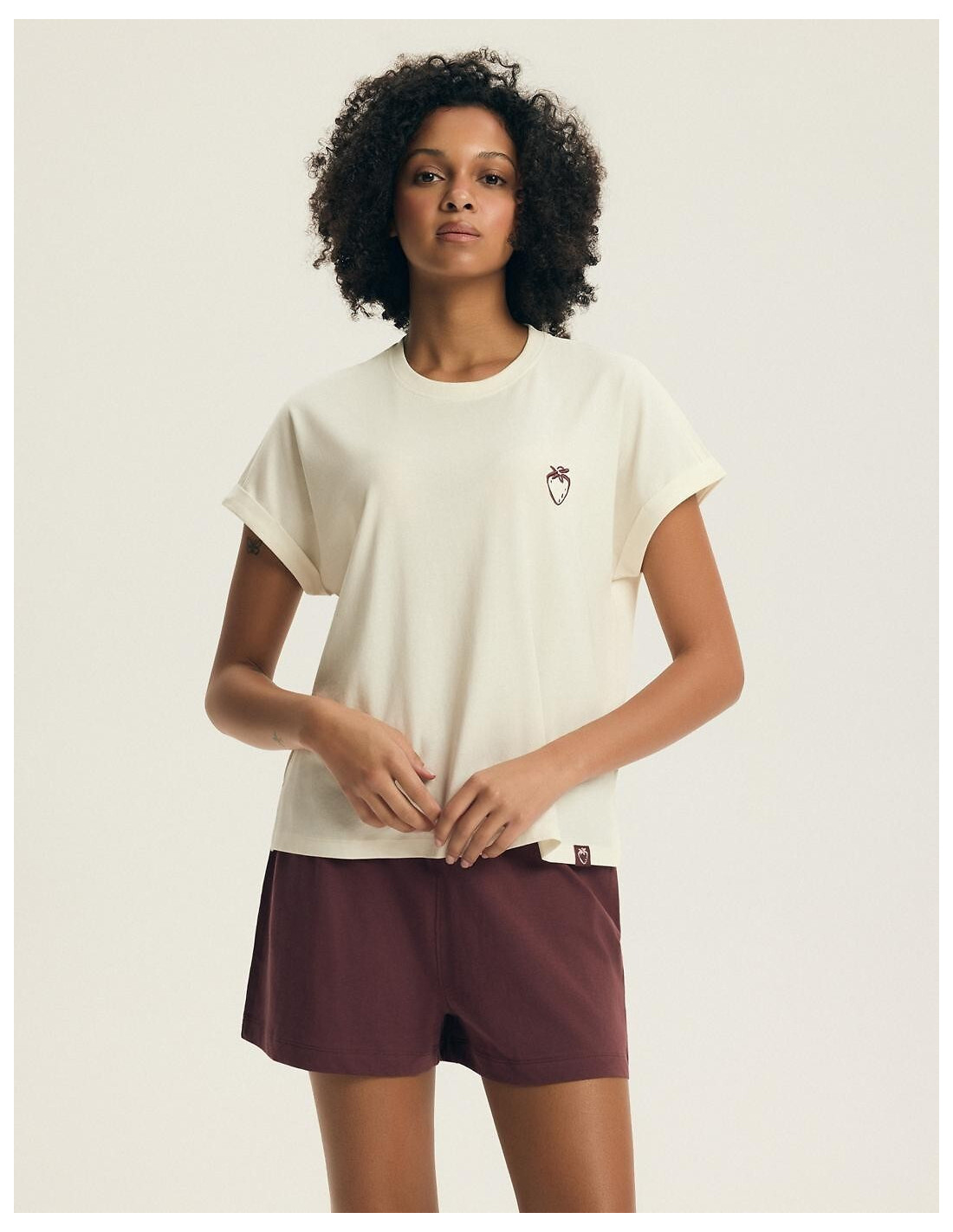 Letnia piżama damska - aukštos kokybės bawełna - koszulka z krótkim rękawem - z przodu delikatny owocowy haft - dekolt okrągły - w komplecie krótkie, jednolite spodenki - w pasie wygodna guma - pakowana w foliowy worek