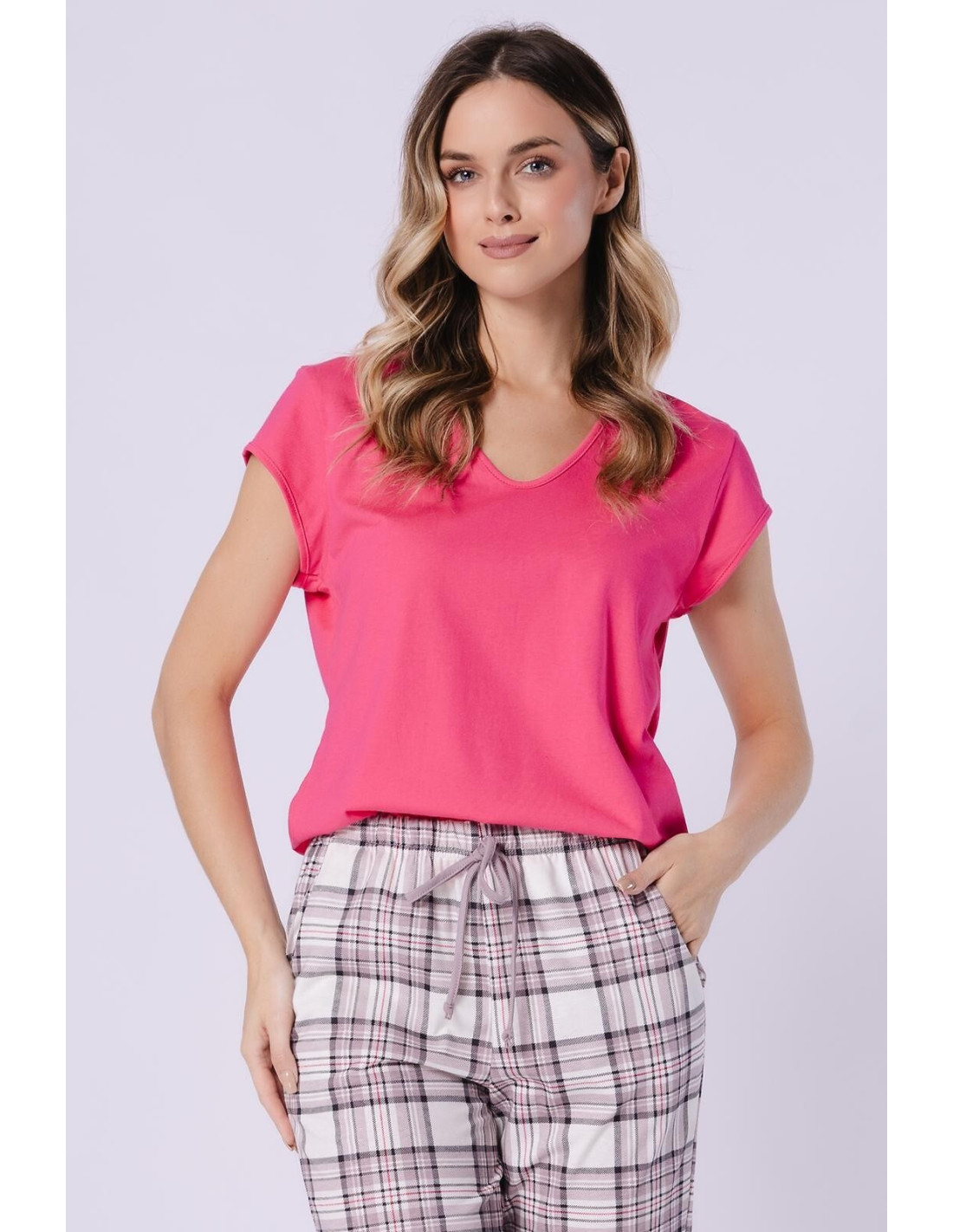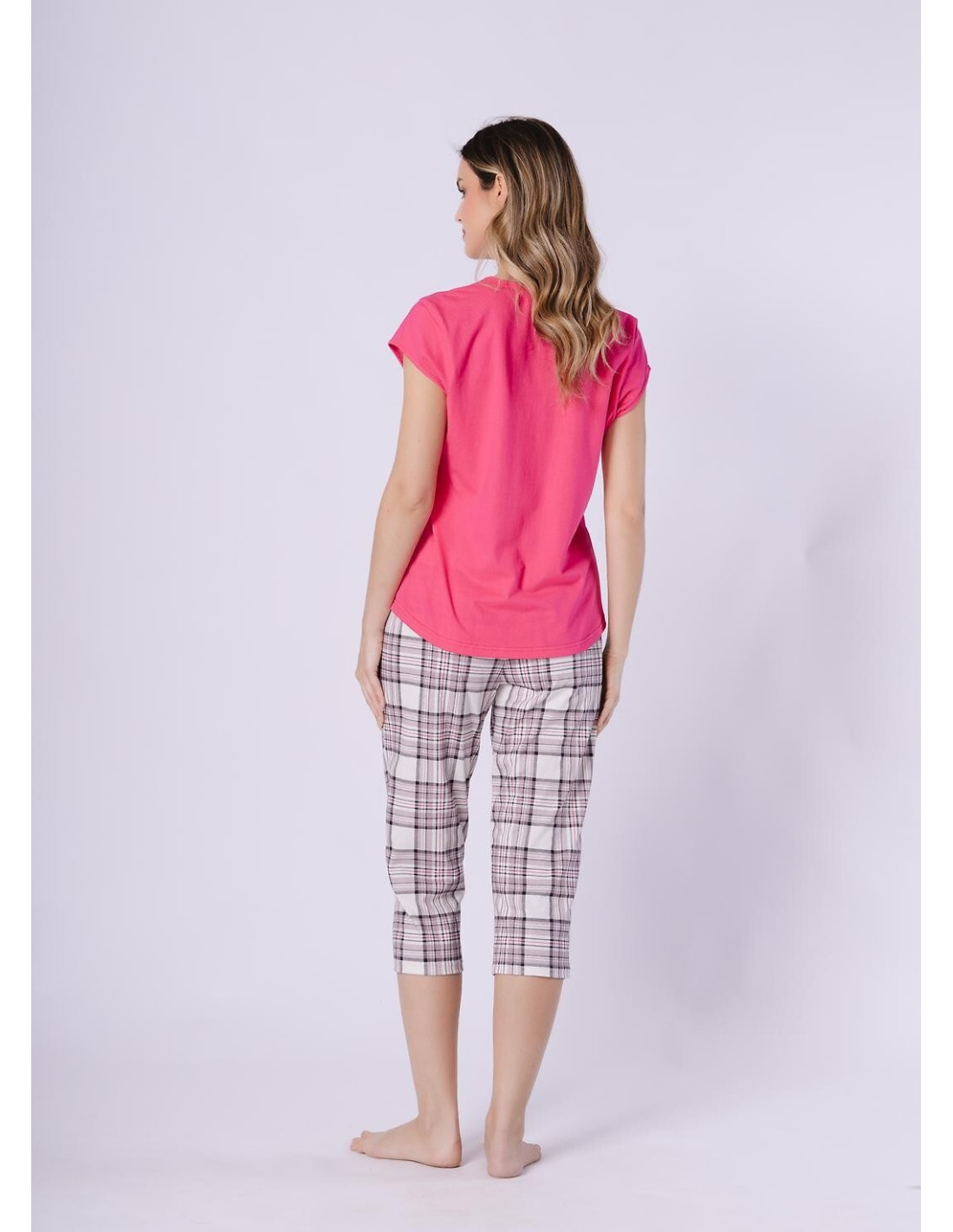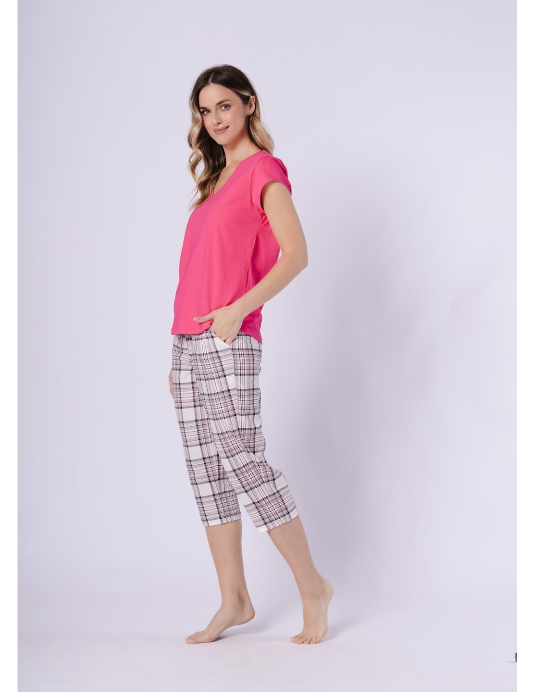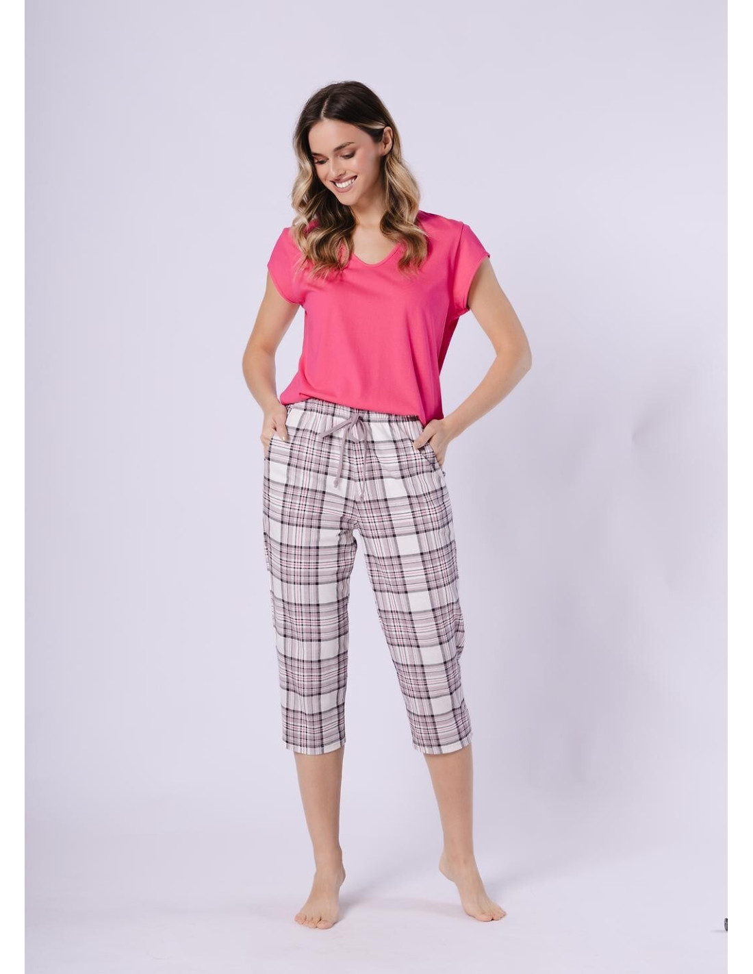 Bawełniana piżama damska - koszulka z krótkim rękawem - dekolt w szpic - wzorzyste apatnie o długości 3/4 - w pasie gumka obszyta bawełną - na wysokości bioder kieszenie
