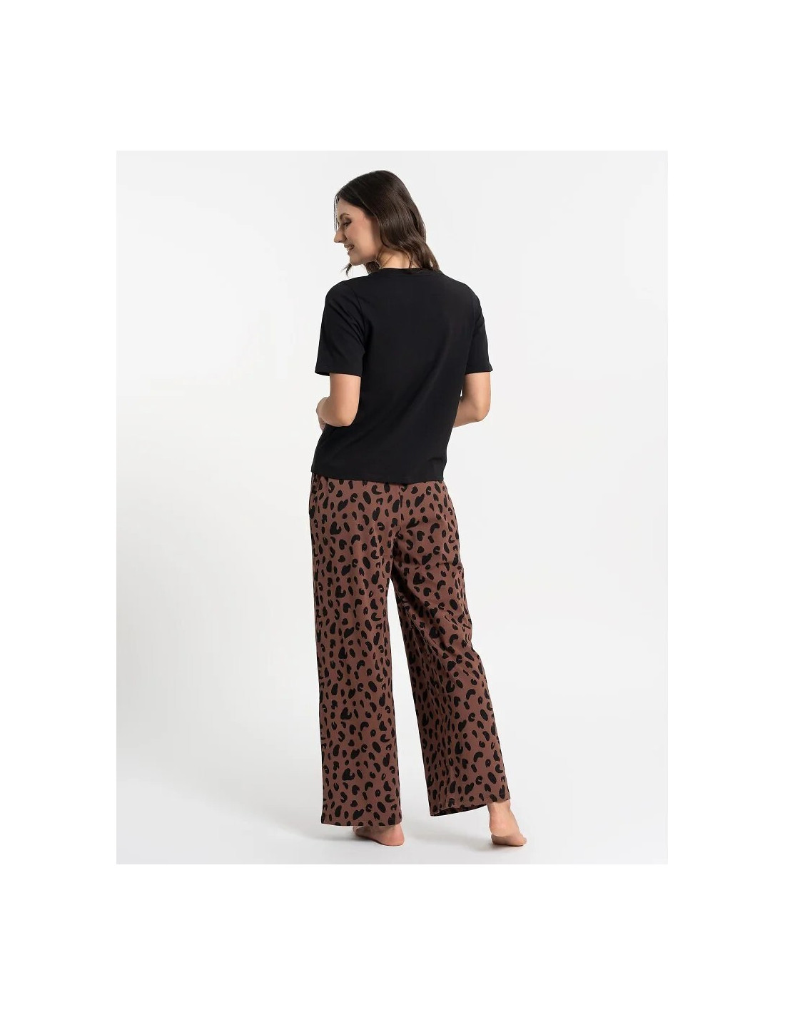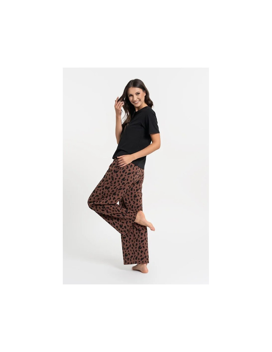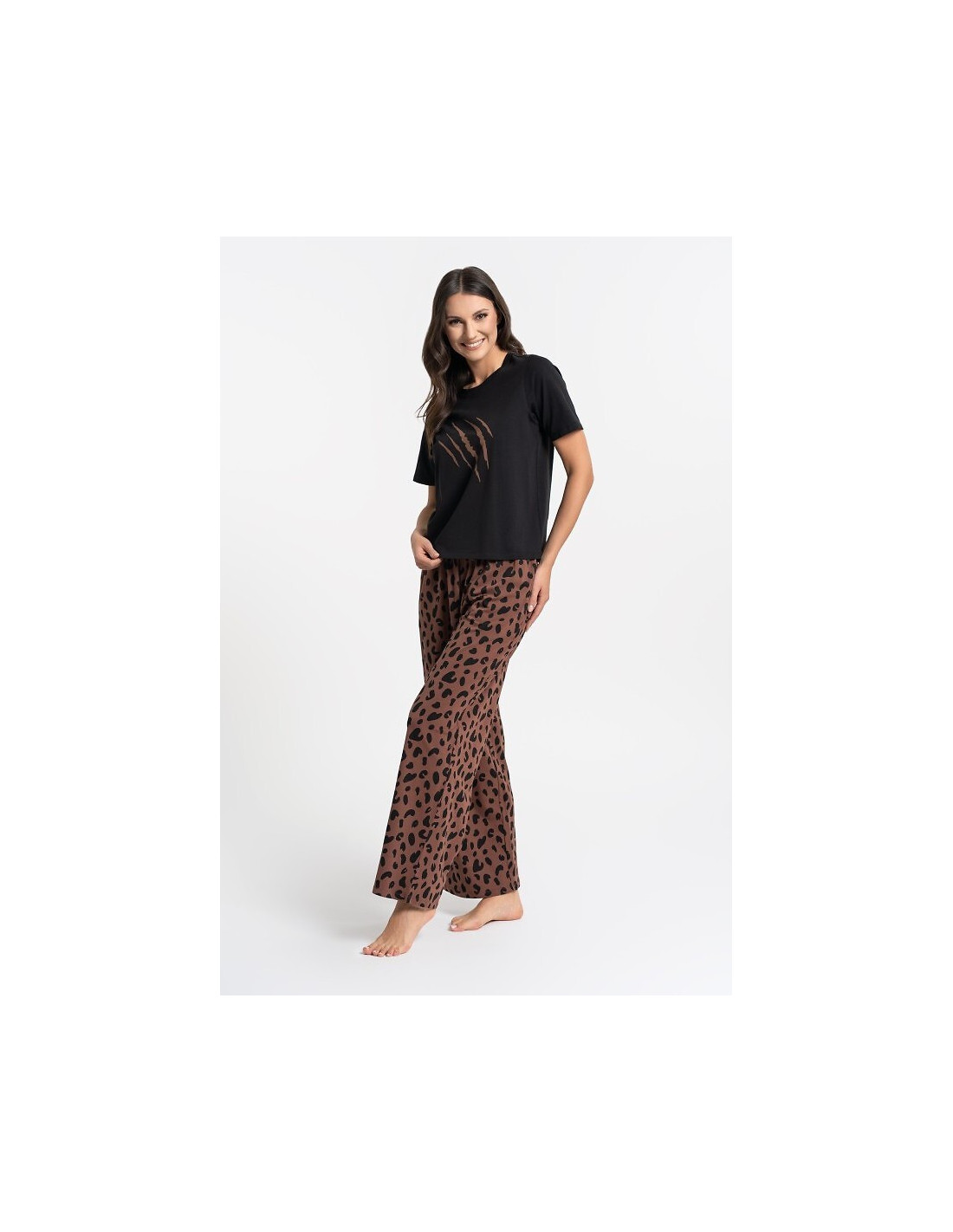 Piżama damska -koszulka z krótkim rękawem - klasyczny okrągły dekolt - długie spodnie z modnym zwierzęcym wzorem -elastyczna gumka w pasie z troczkami do regulacji obwodu - praktyczne kieszenie po bokach -wygodny fason zapewniający swobodę ruchów -ideal do spania i domowego wypoczynku