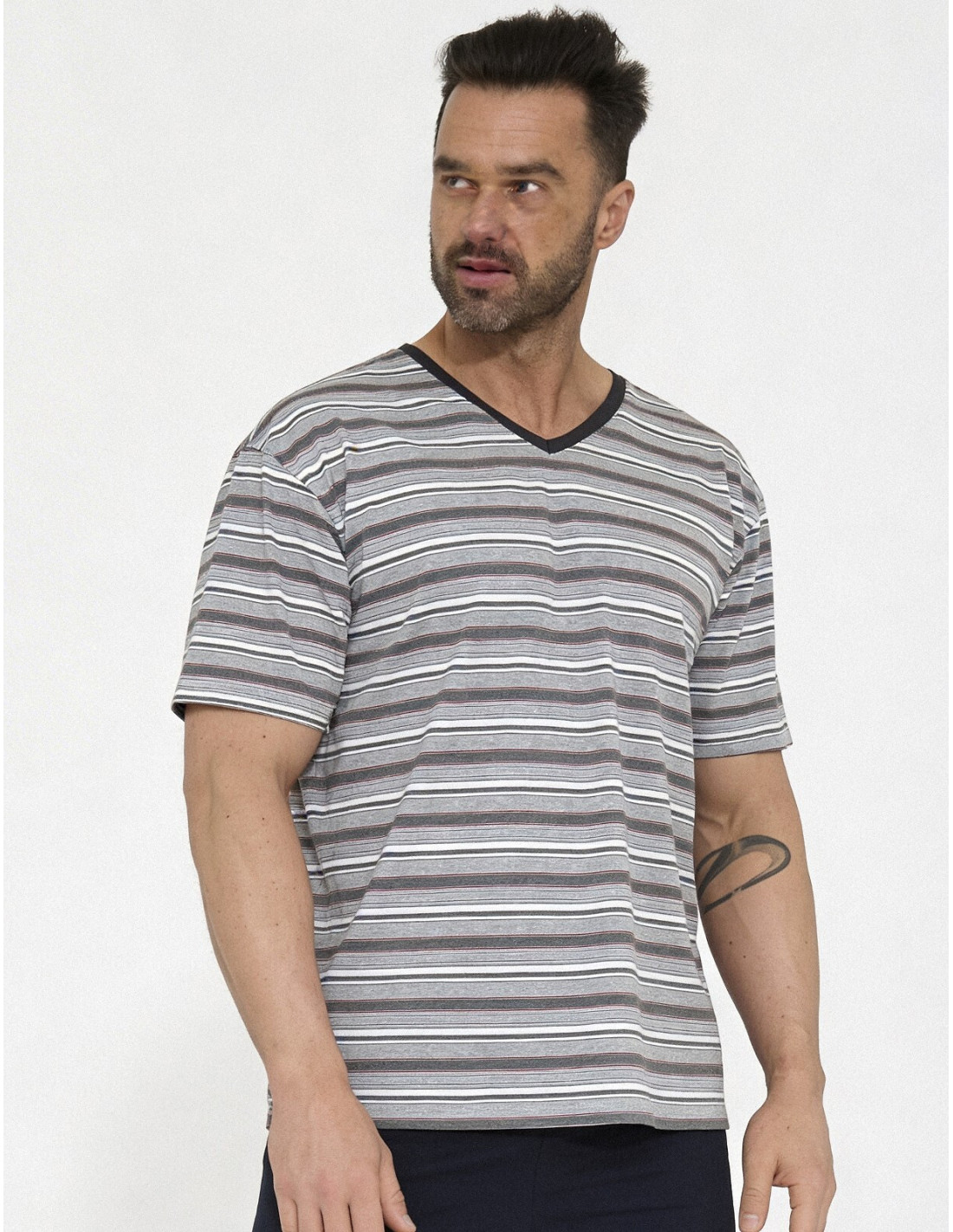 Bawełniana piżama męska - koszulka w paski, z krótkim rękawem - dekolt w szpic - spodenki krótkie, jednolite - w pasie gumka obszyta bawełną