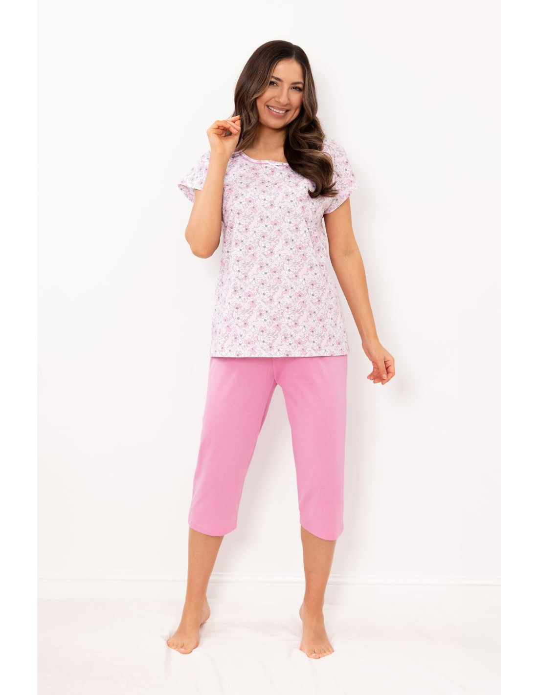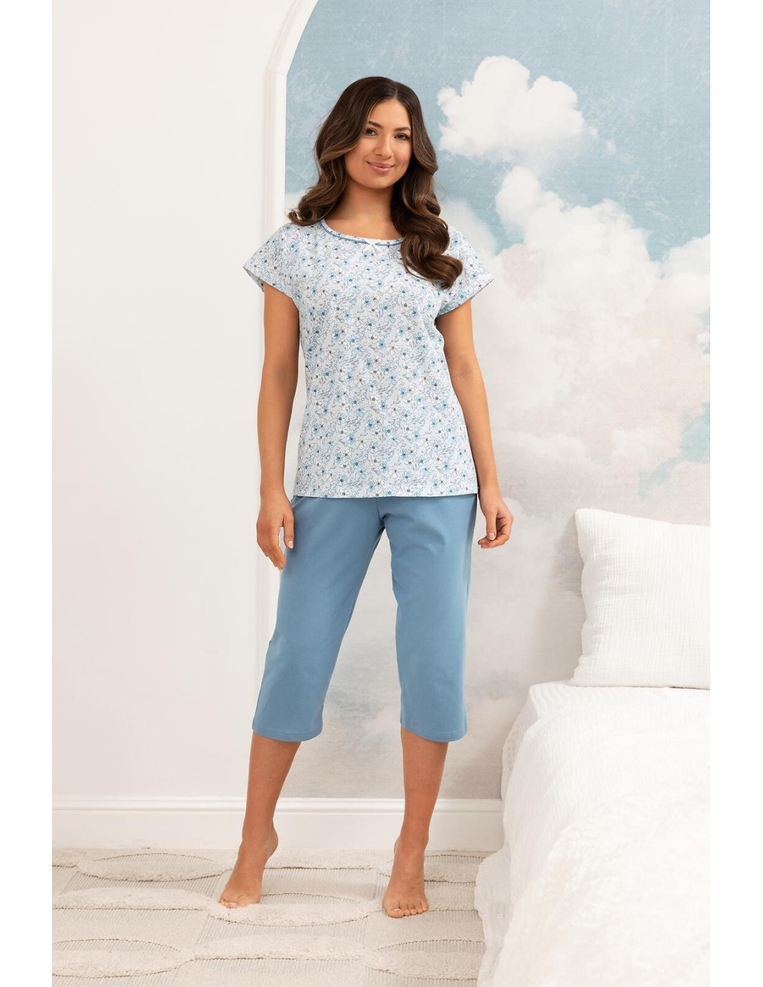 Bawełniana piżama damska - koszulka z krótkim rękawem - wzór w kwiatuszki - dekolt półokrągły - apatnie jednolite o długości 3/4 - w pasie gumka obszyta bawełną - pakowana w foliowy worek