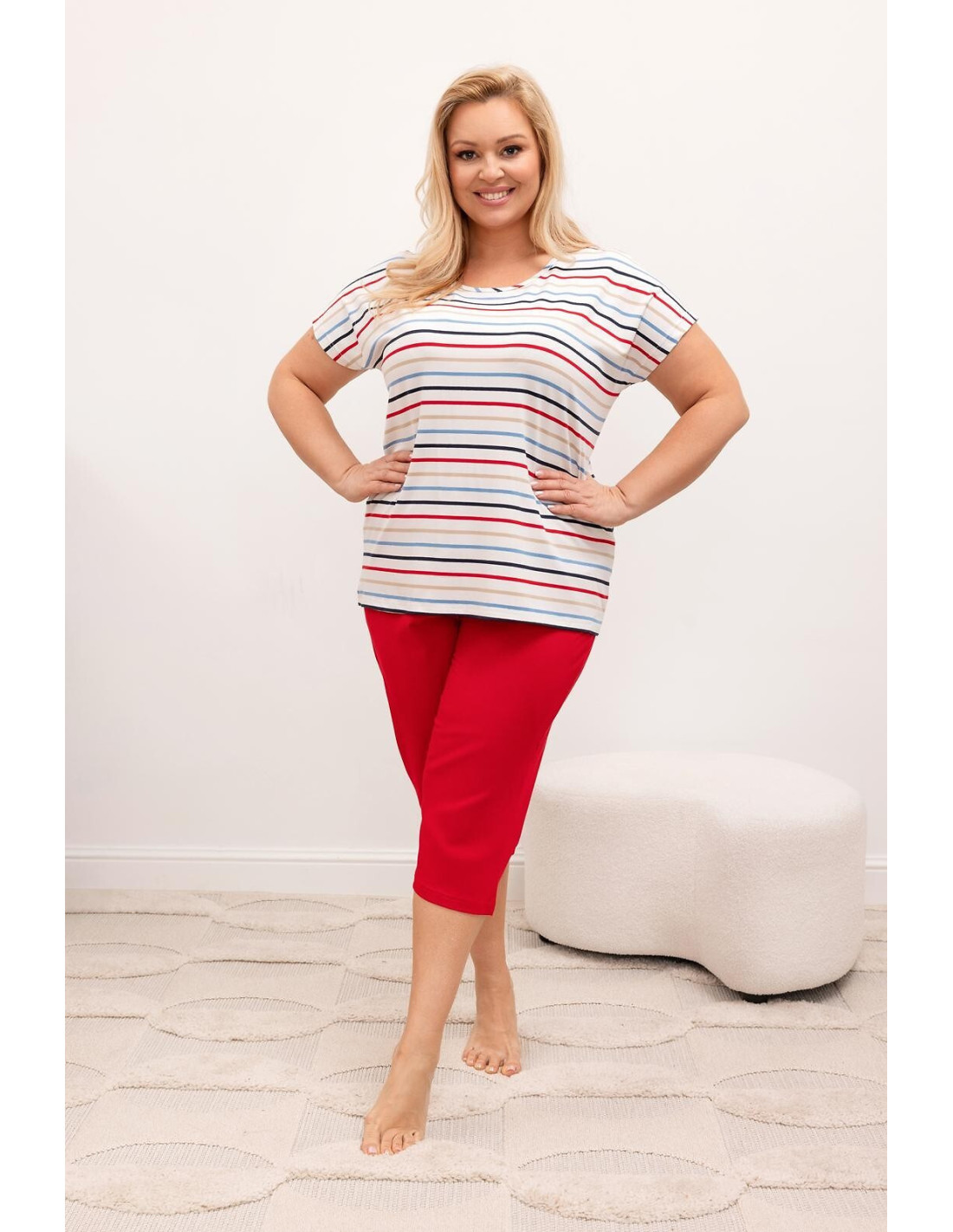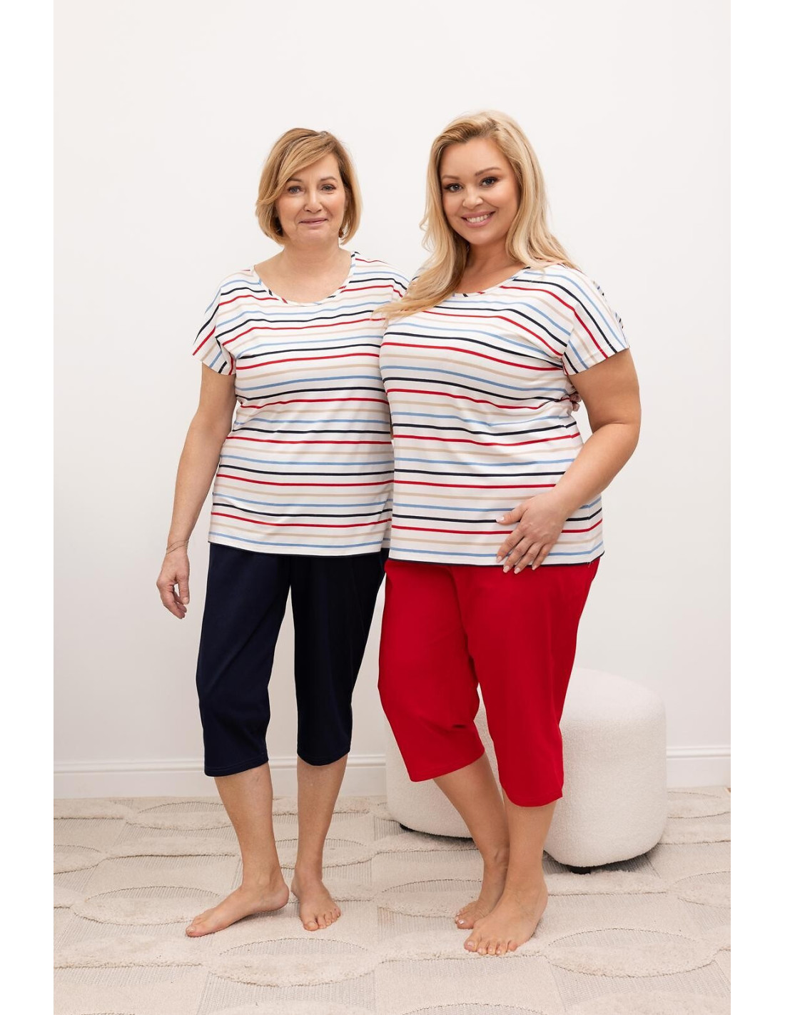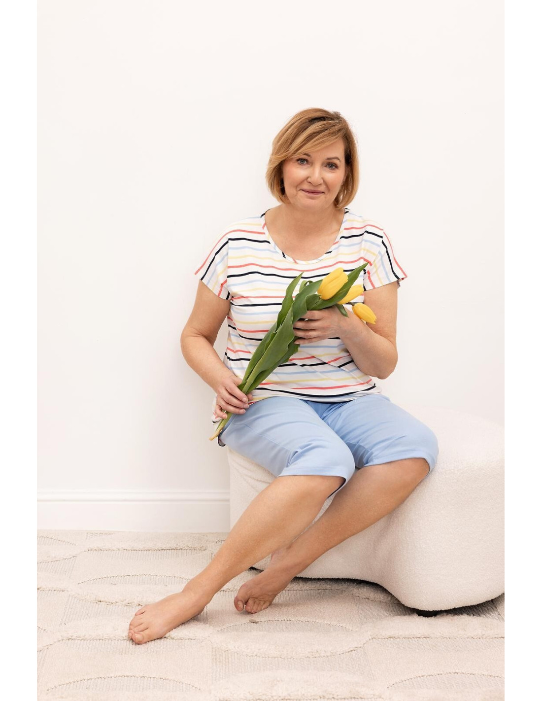 Piżama damska - aukštos kokybės dzianina - koszulka z krótkim rękawem w paski - dekolt półokrągły - apatnie jednolite o długości 3/4 - w pasie gumka obszyta bawełną - pakowana w foliowy worek