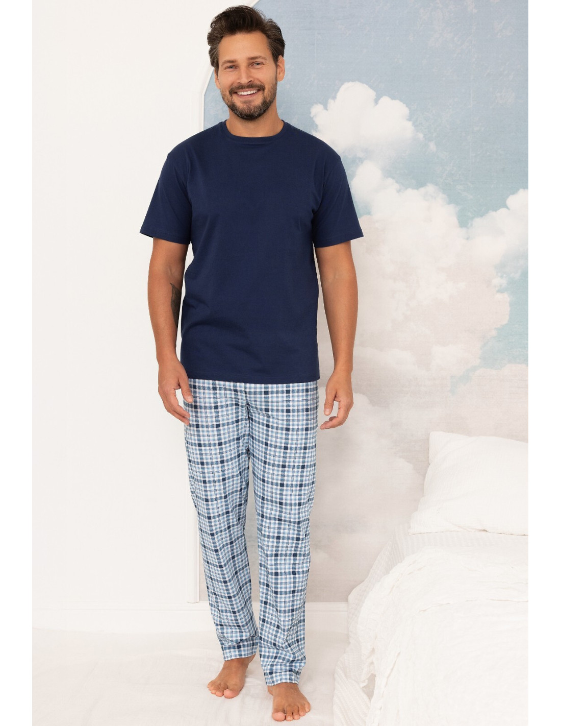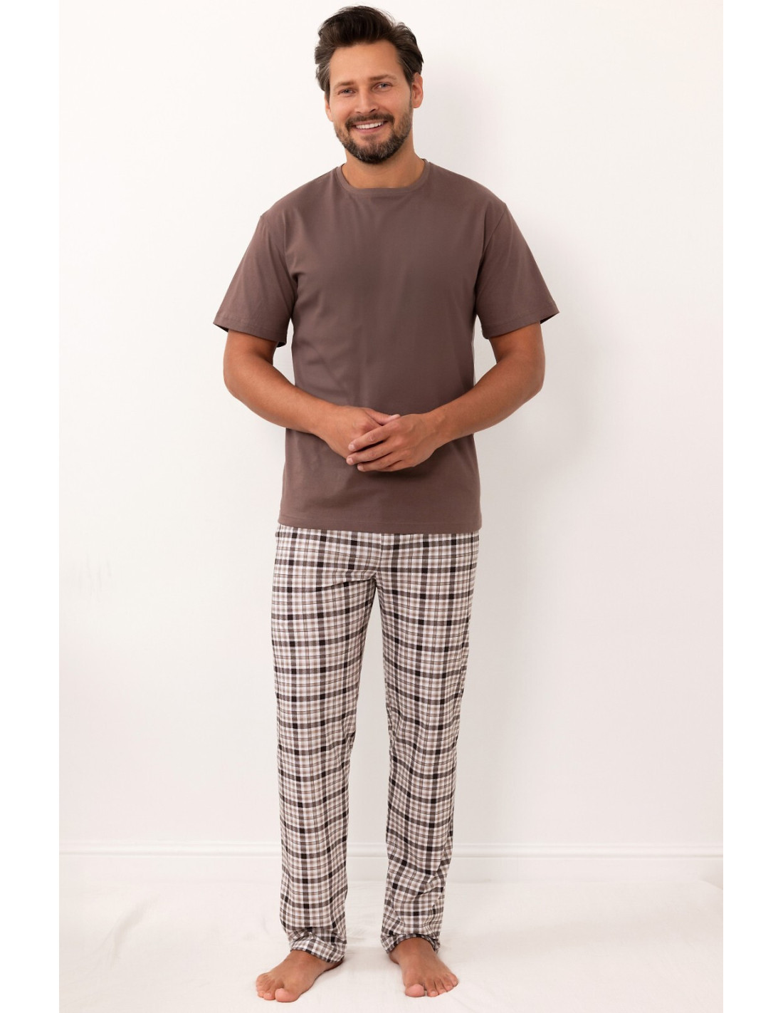 Bawełniana piżama męska - koszulka z krótkim rękawem - luźny, wygodny fason - półokrągły dekolt - długie spodnie w kratkę - w pasie wygodna gumka obszyta bawełną