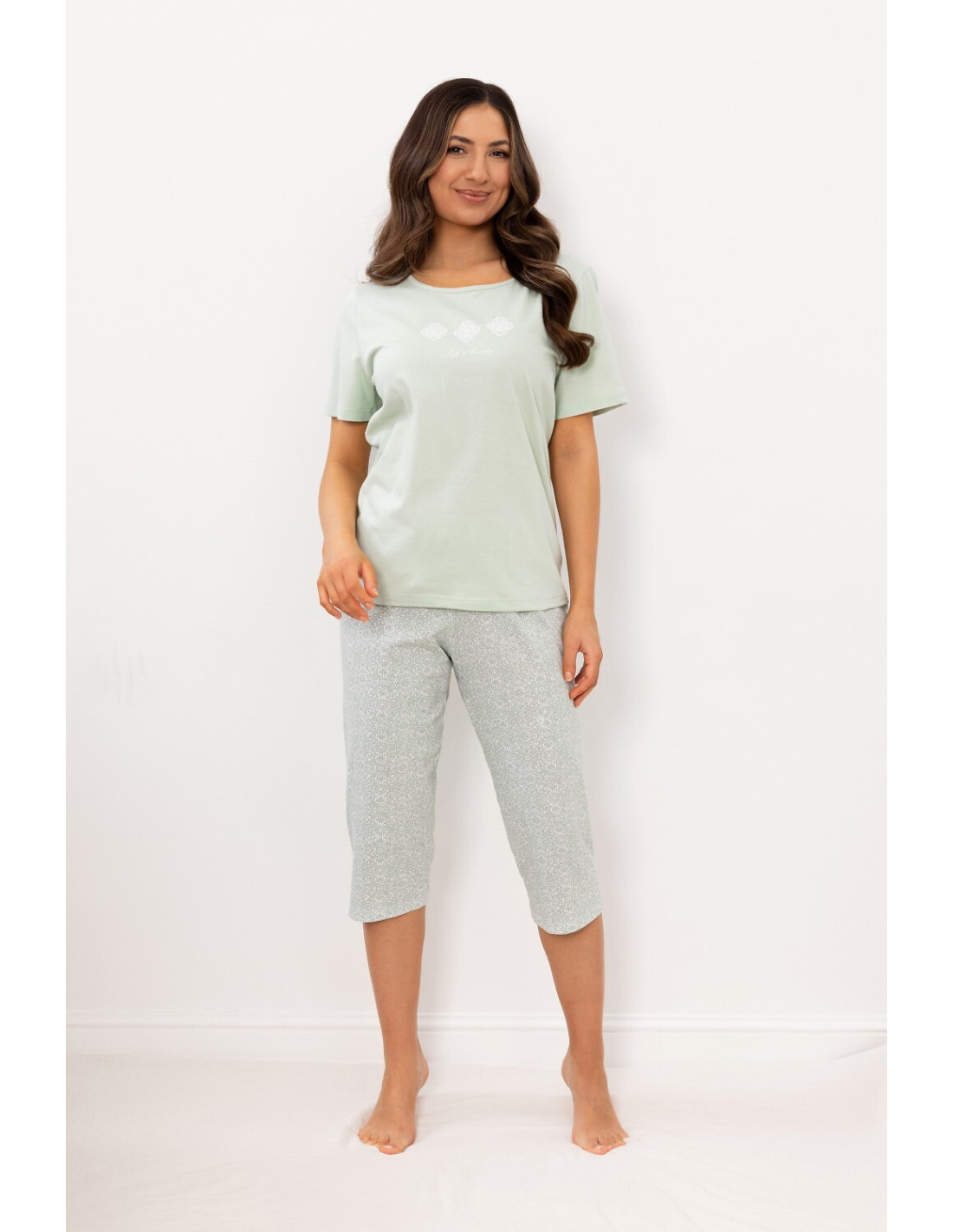 Piżama damska - koszulka z krótkim rękawem - zdobiona nadrukiem - apatnie wzorzyste, długość 3/4