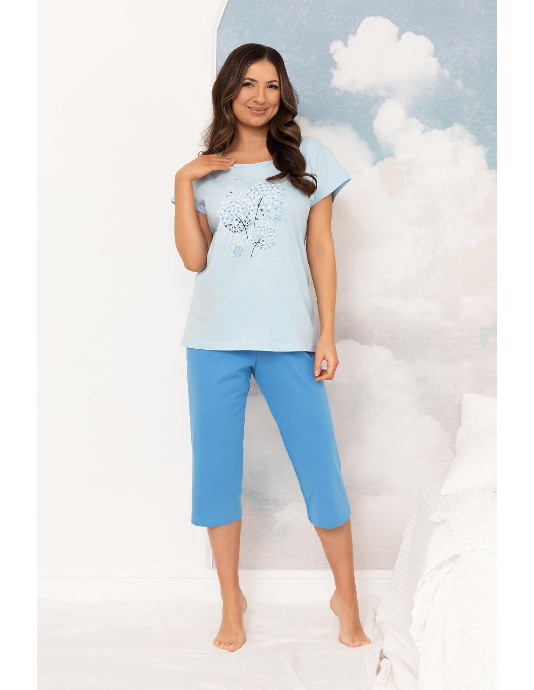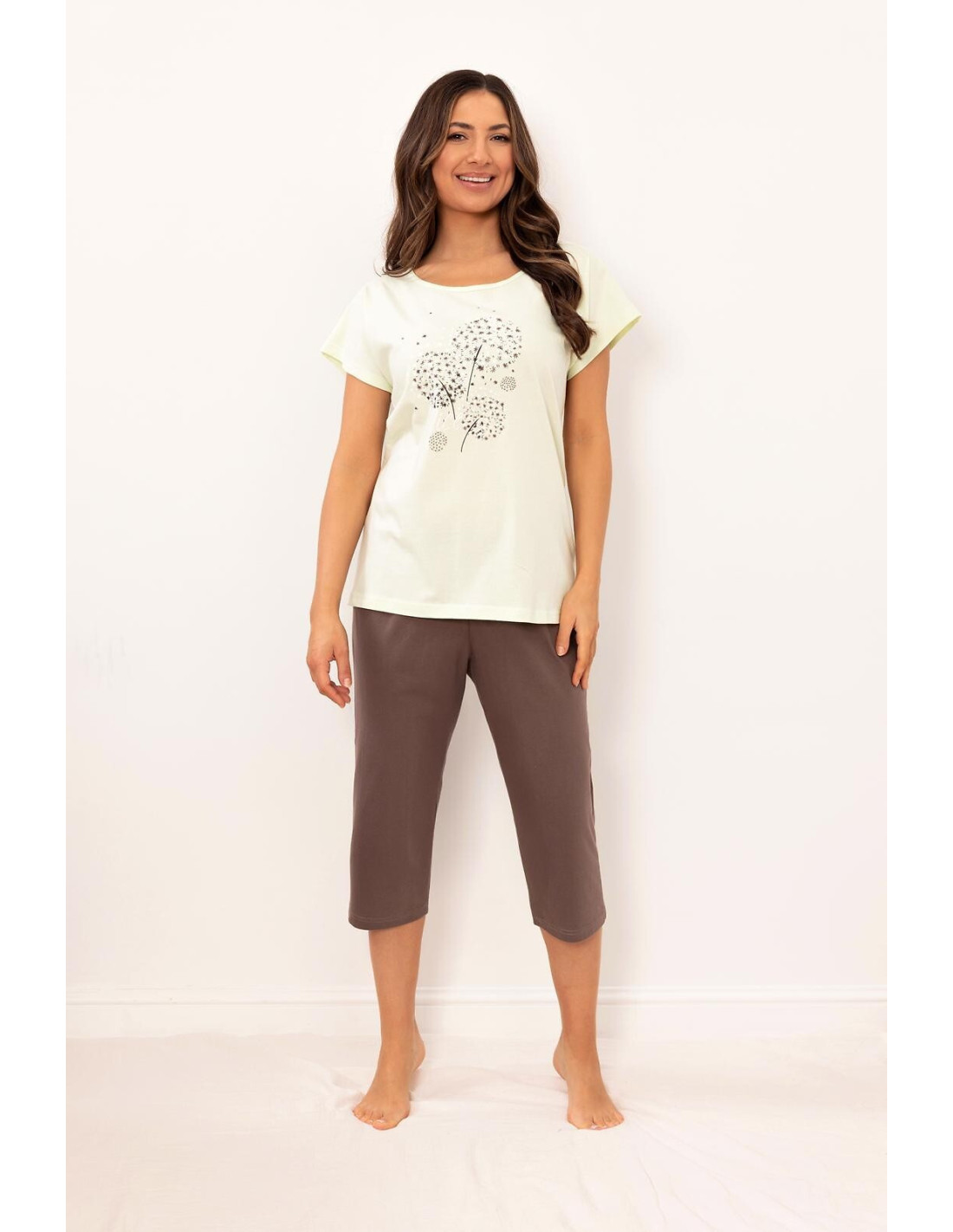 Bawełniana piżama damska - koszulka z krótkim rękawem - dekolt półokrągły - z przodu ozdobny roślinny print - jednolite apatnie o długości 7/8 - w pasie gumka obszyta bawełną
