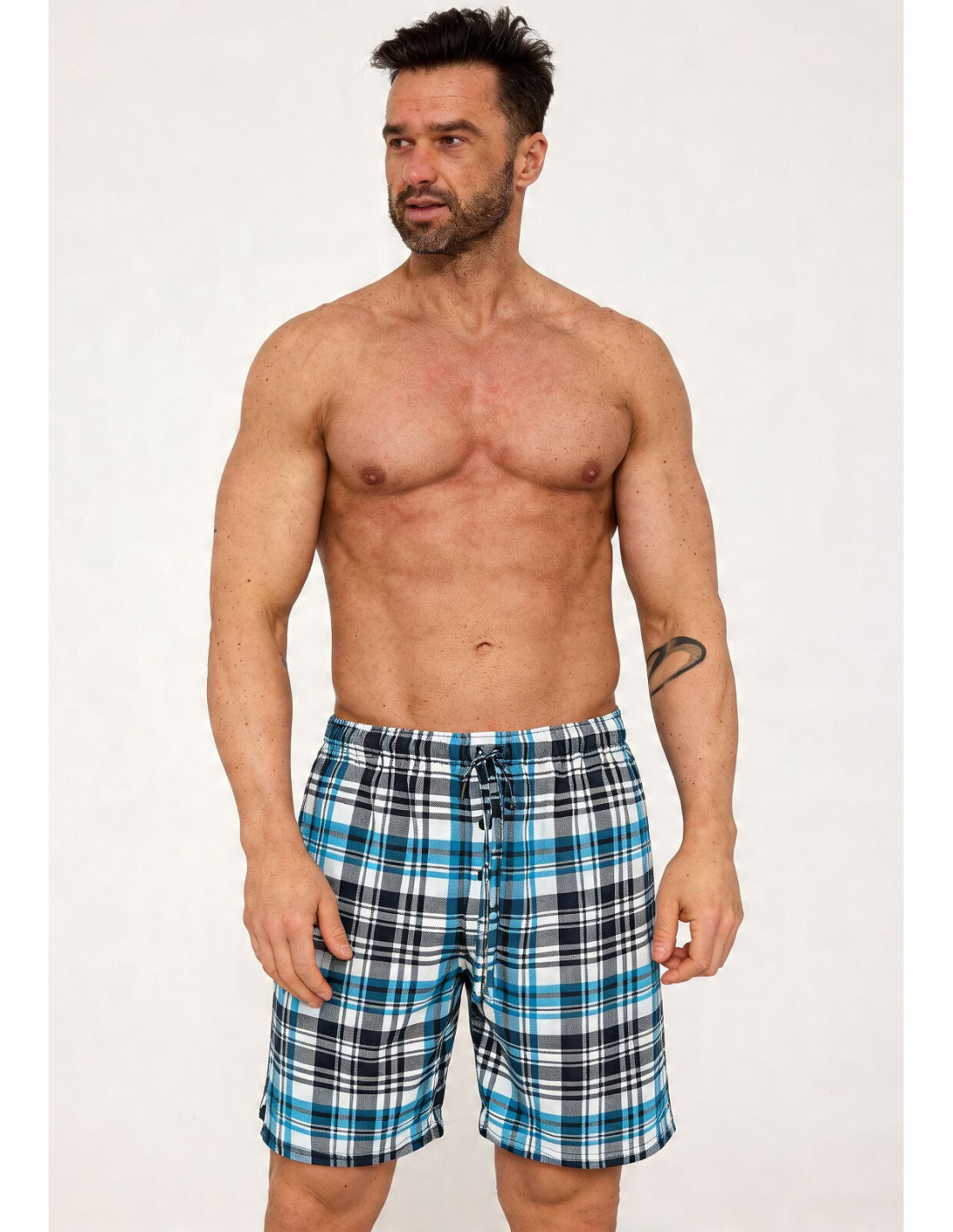 Krótkie spodenki męskie do spania - wysokiej kokybės bawełna - wzór w kratę - w pasie guma obszyta bawełną z troczkiem do regulacji obwodu - na biodrach wygodne kieszenie