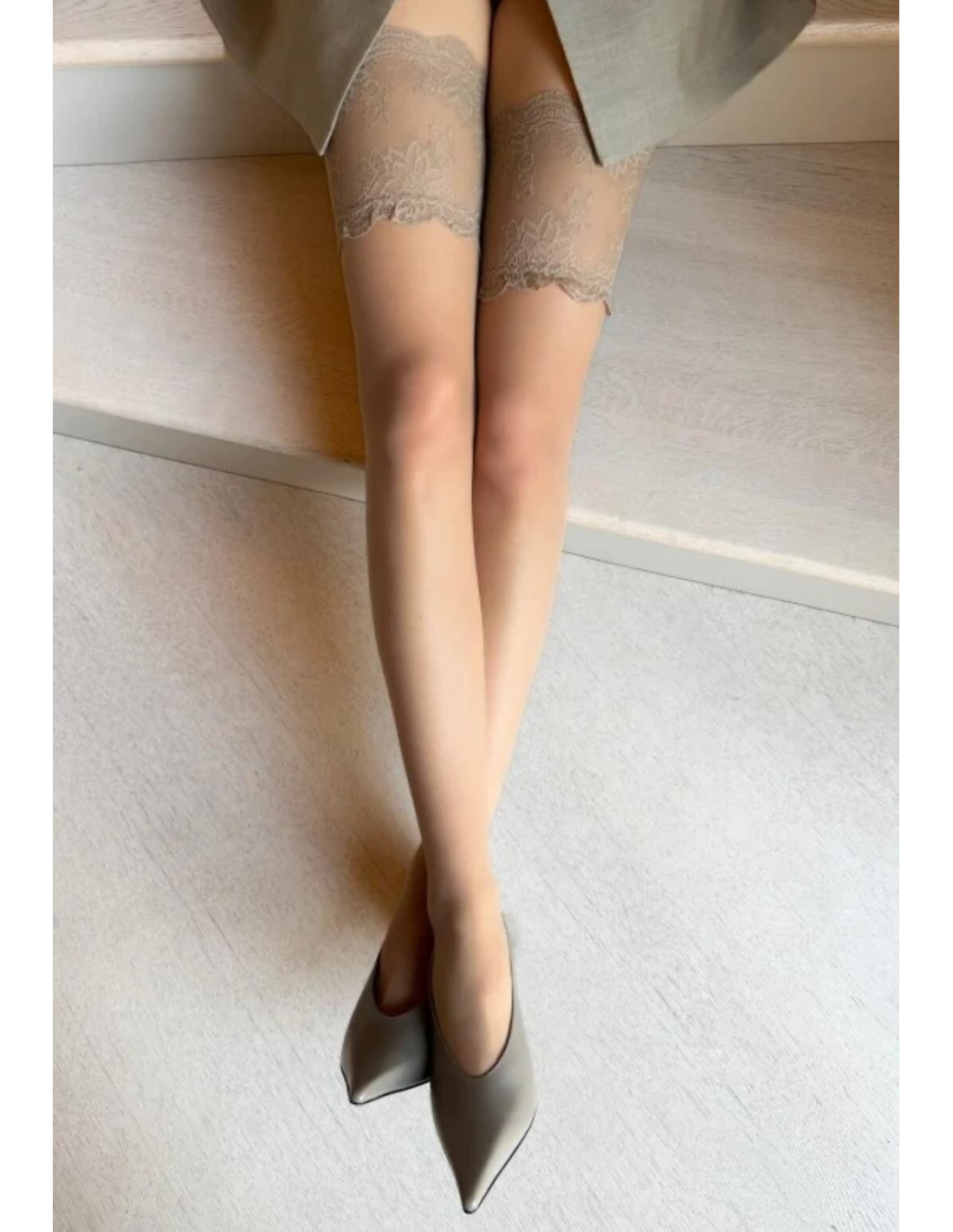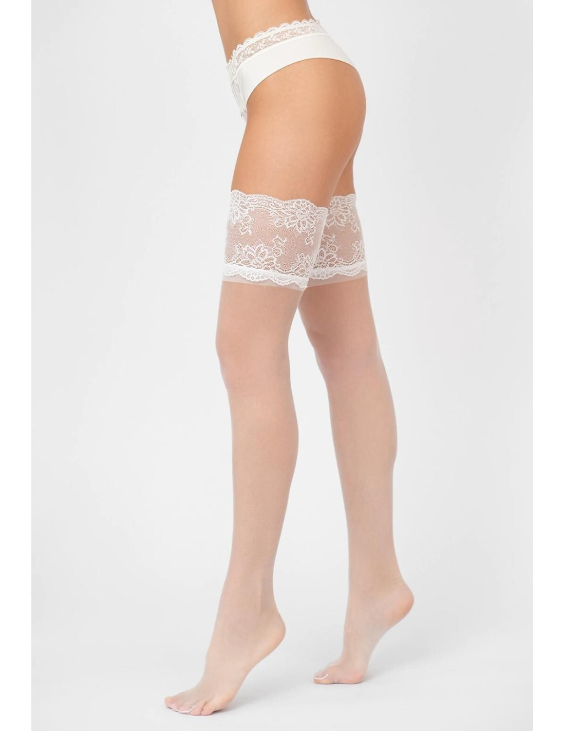 Moteriškos savadarbės kojinės - matinės, permatomos, 20 den storio - viršuje - platūs nėriniai (10 cm) su gėlių motyvais - vidinė pusė su dviguba silikonine juostele - be sutvirtinimų ant kojų pirštų