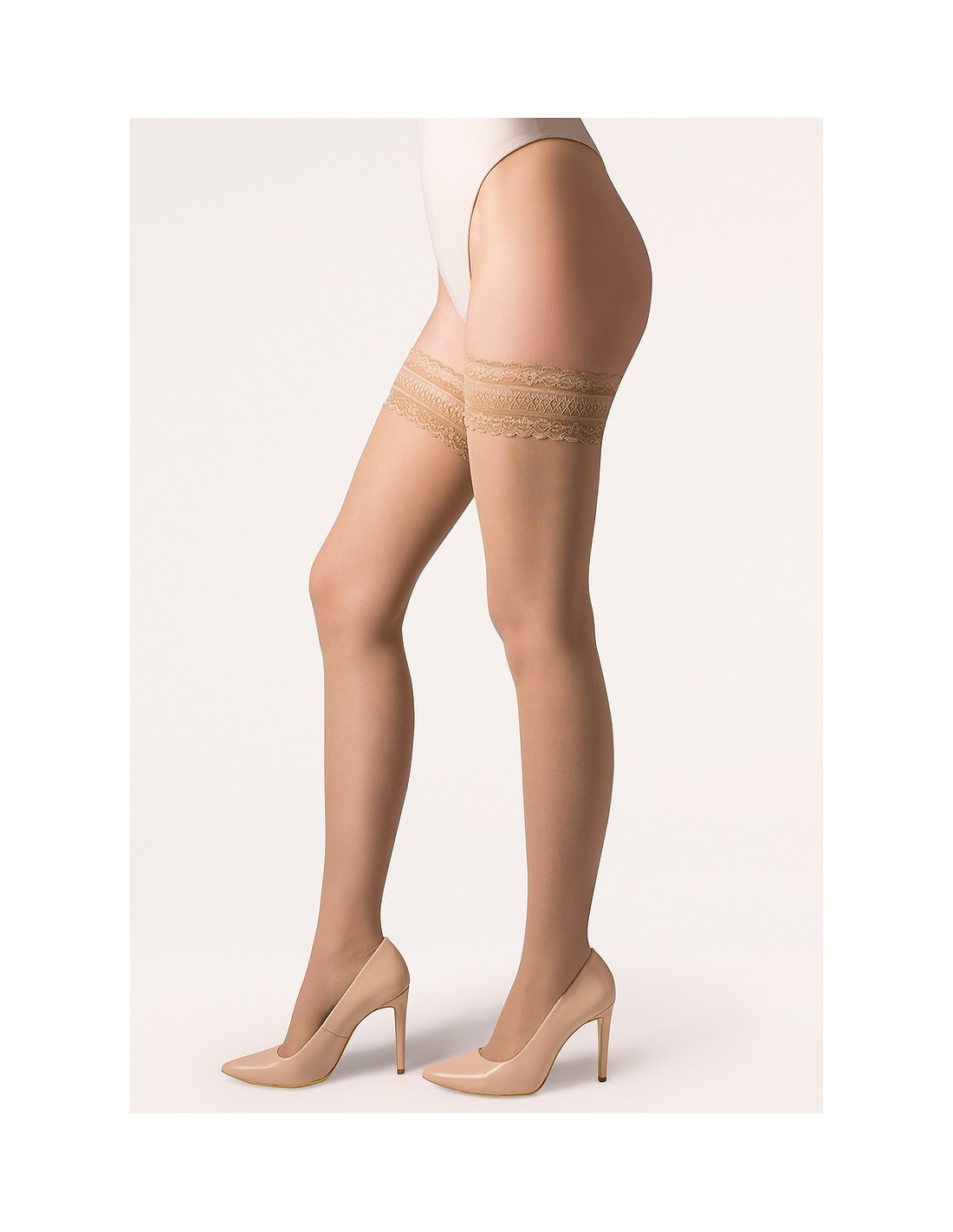 Plonos, subtilios permatomos kojinės - su pridėtiniu likros pluoštu - įspūdingi 9 cm pločio nėriniai su dviguba silikono juostele