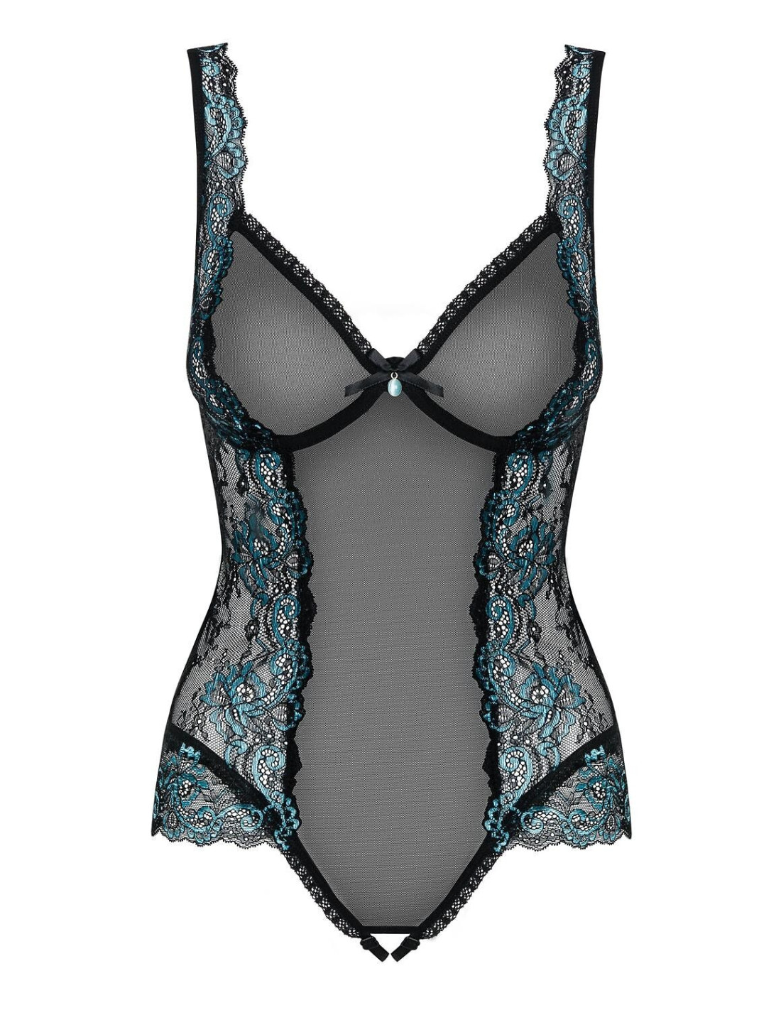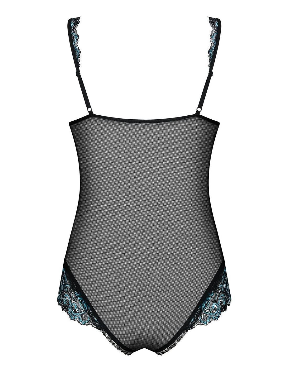 Seksualus bodis - pagamintas iš permatomo tinklelio ir nėrinių, dekoruotas turkio spalvos raštu - minkšti kaušeliai su pakietinimais - reguliuojamos petnešėlės - nugara iš tiulio tinklelio - atviras tarpkojis su reguliuojamomis petnešėlėmis