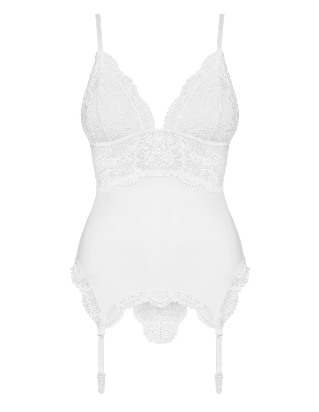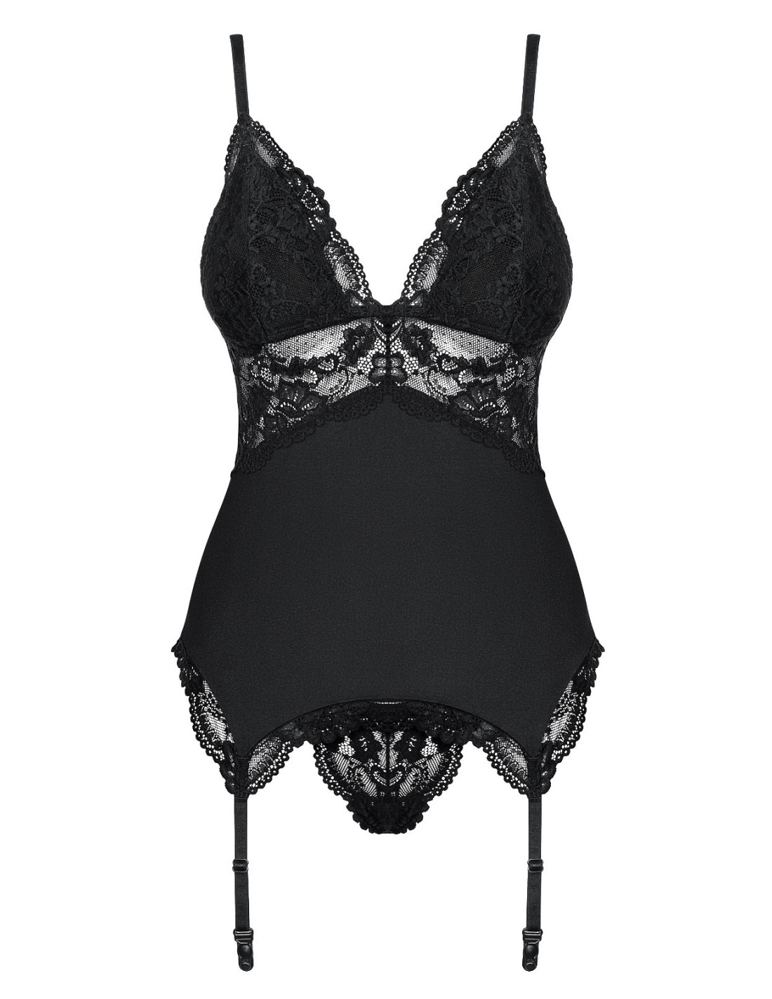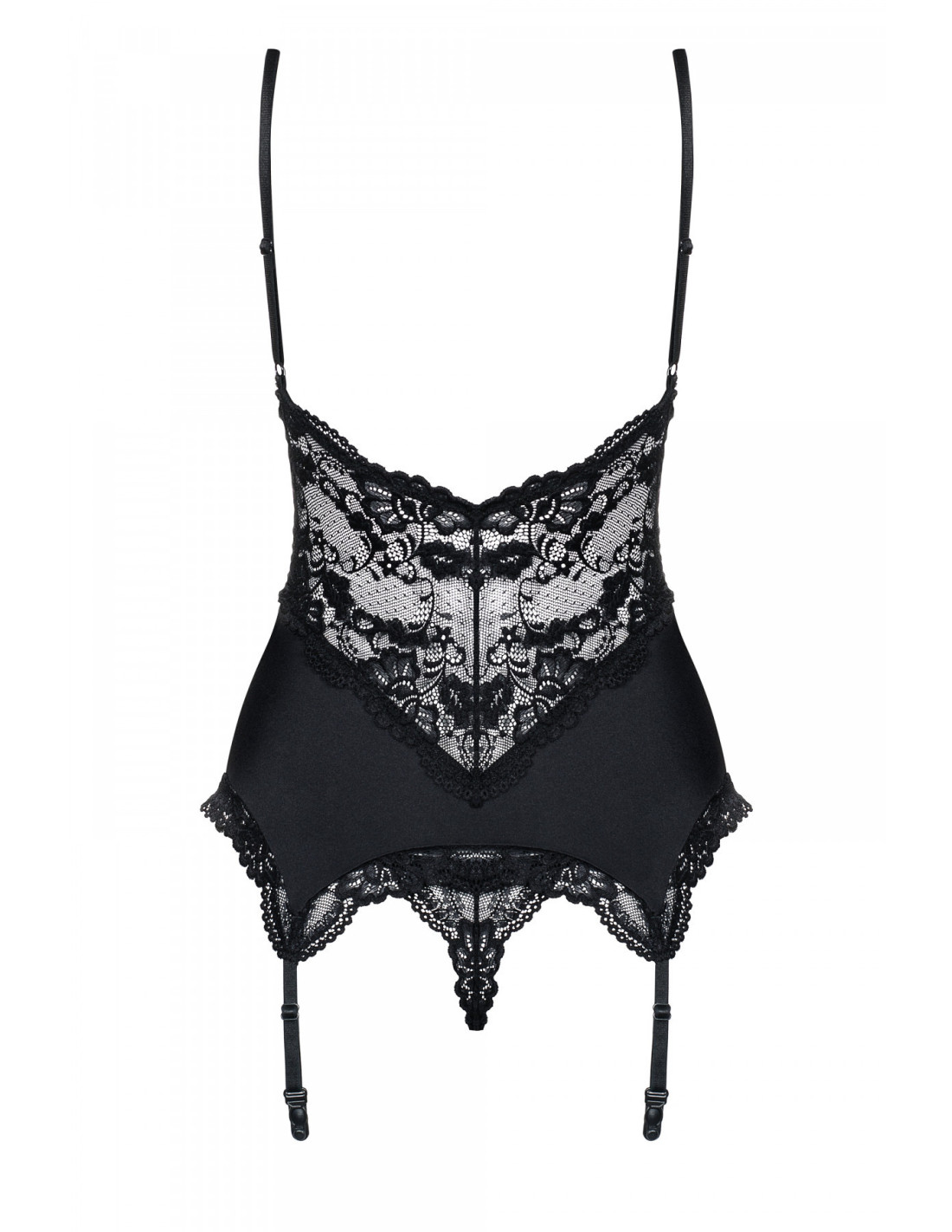 Gundantis korsetas - pagamintas iš gėlėtų nėrinių ir lygaus, malonaus liesti audinio - šiek tiek paminkštinti kaušeliai, siauros reguliuojamos petnešėlės - reguliuojami dirželiai su siauromis petnešėlėmis ir reguliuojamomis kojinėmis apačioje - pridedamos tamprės - puikus komplektas su "Obsessive 810" kojinėmis