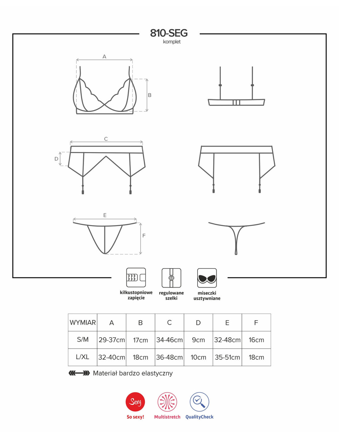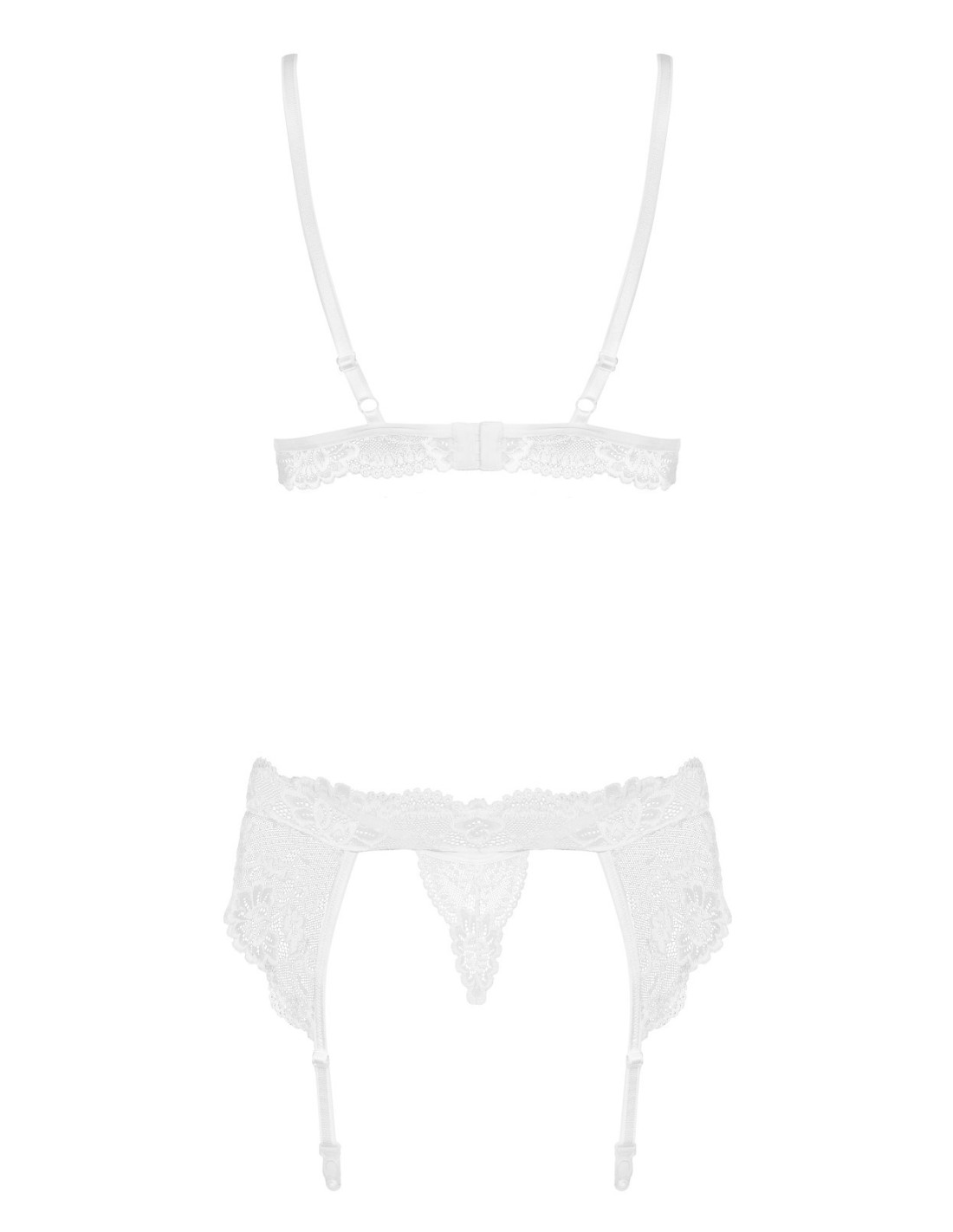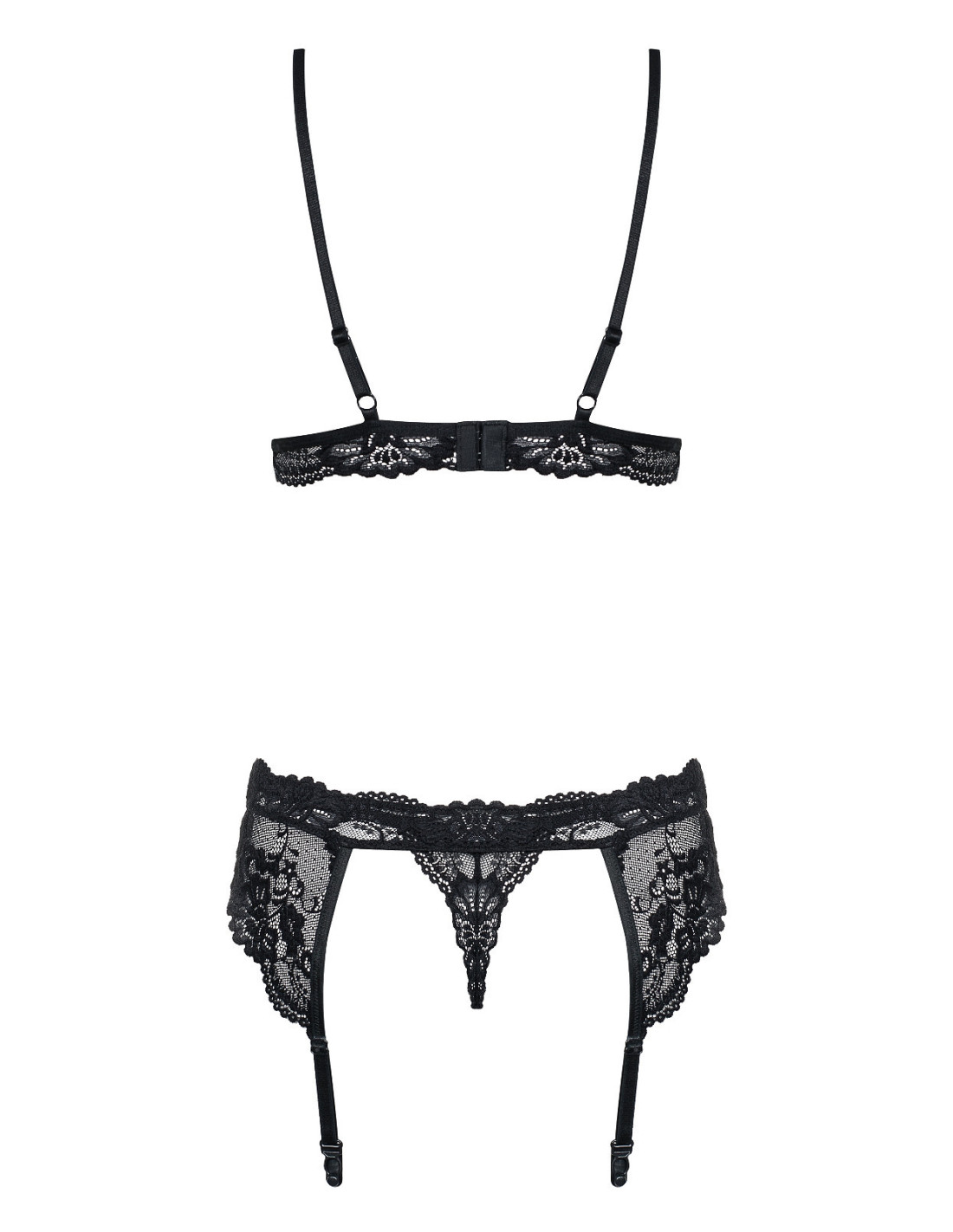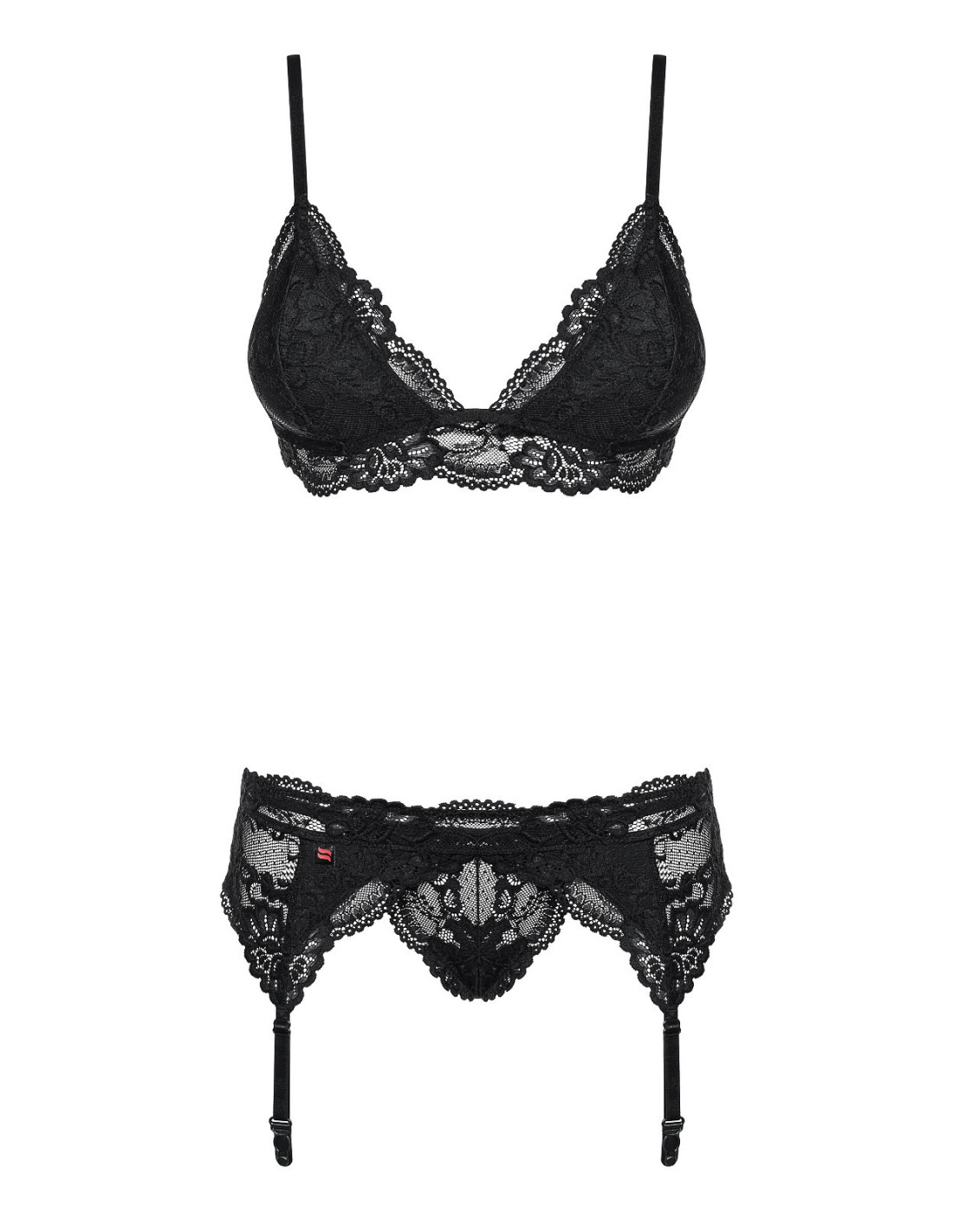 Gundantis nėrinių rinkinys su gėlių motyvais - liemenėlė su reguliuojamomis siauromis petnešėlėmis - kaušelių pamušalas iš audinio, šiek tiek paminkštintas - trijų pakopų dvigubas užsegimas kabliuku ir akimis - į komplektą įeina stringai ir diržas su reguliuojamomis petnešėlėmis - puikus komplektas su "Obsessive 810" kojinėmis