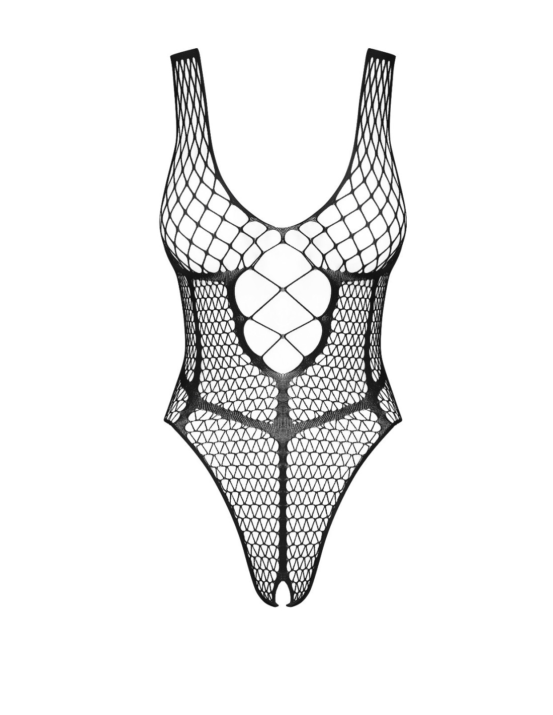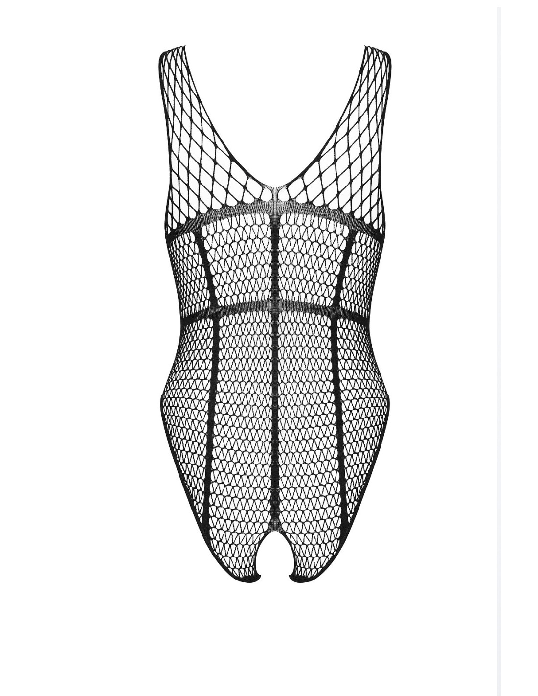 Viliojantis juodas bodis - pagamintas iš elastingo tinklelio su didelėmis angomis - dekoruotas vertikalių ir horizontalių dryžių raštu - su atviru tarpkoju