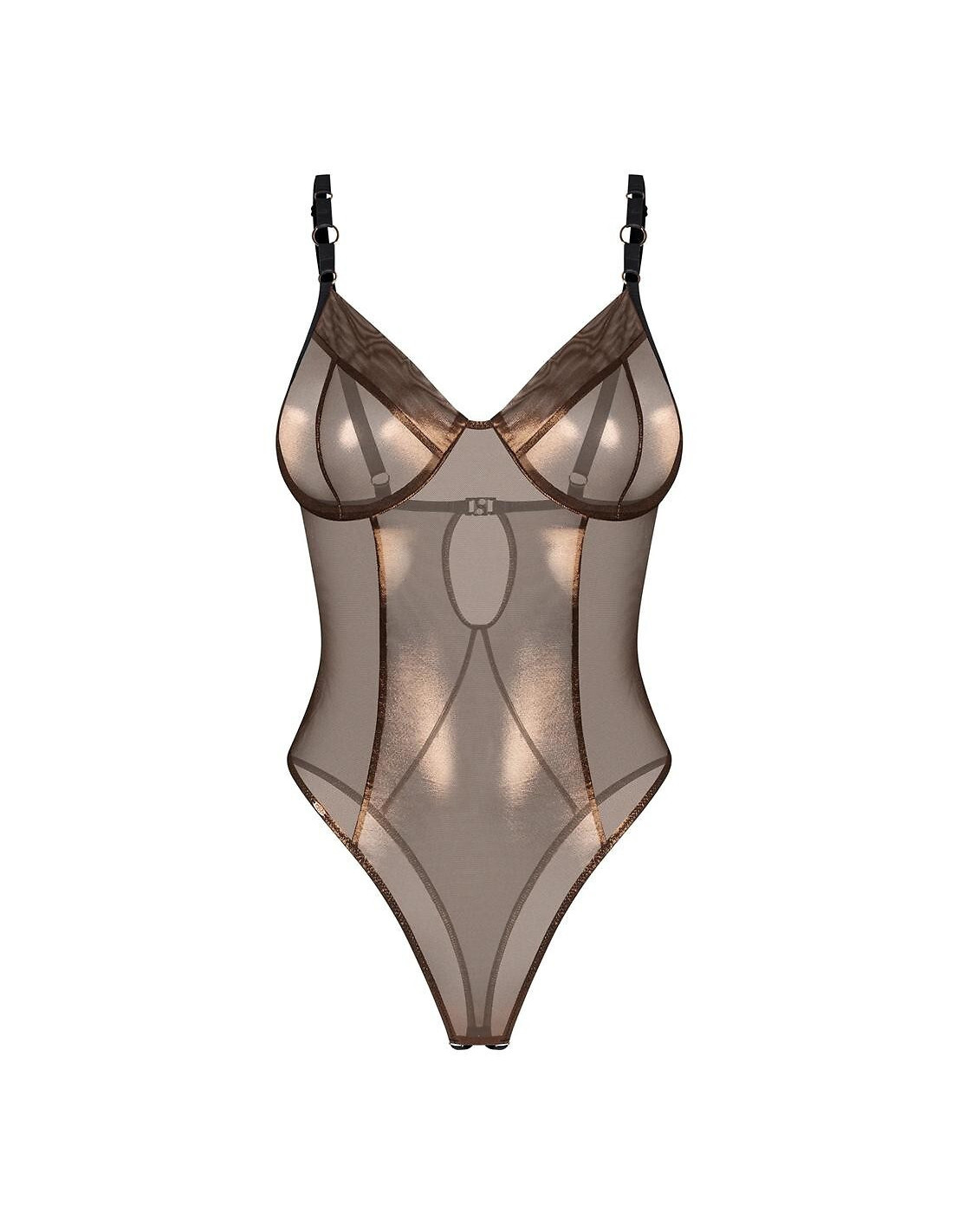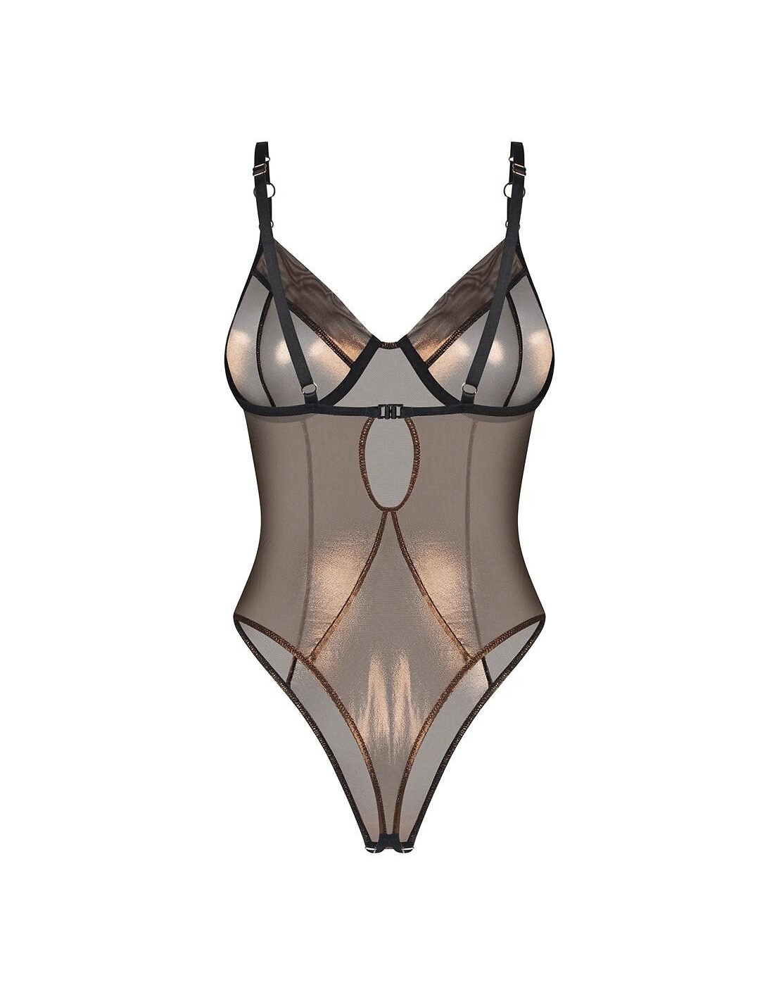 Drąsus, itin moteriškas bodis - subtilus tinklelis su auksiniu blizgesiu - seksualus, prigludęs kirpimas - minkšti kaušeliai su pakietinimais - reguliuojamos petnešėlės - patogus užsegimas nugaroje - atviras tarpkojis - elegantiškos aukso detalės (be nikelio)