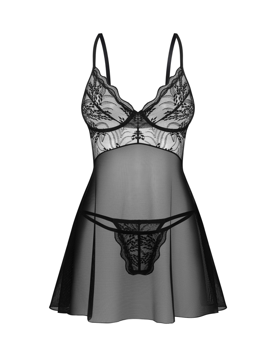 Koszulka babydoll i stringi w kolorze czerni- kilkustopniowe zapięcie bei regulowane ramiączka- fiszbiny w miseczkach- prześwitująca tkanina połączona z koronką - elastyczny materiał - zaprojektowano w UE- bez zawartości niklu- Stwórz idealną parę razem z szykownym kompletem bielizny z kolekcji Perisia! Czarna koszulka babydoll w zestawie z klasycznymi stringami w delikatny sposób rozbudzi kobiecą naturę i Doda Ci pewności siebie. Gustowne połączenie minimalistycznej koronki oraz transparentnego materiału z pewnością spełni Twoje oczekiwania.