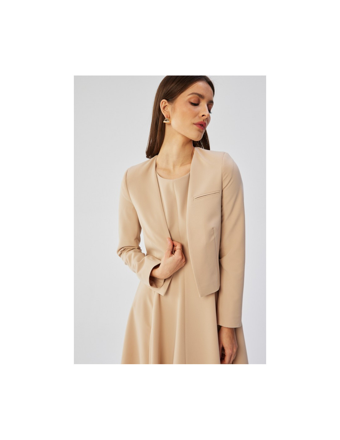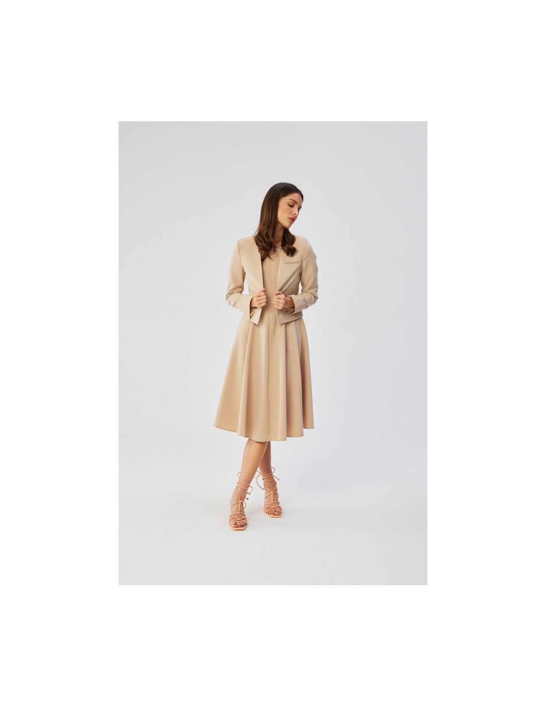 65% polyester 30% viscose 5% elastanase PRODUCT DETAILS:      woven fabric with print mid lenth dress with a ruffle V-shaped neckline short wide sleeves elasticated waistline unlined tie belt attached our model is 174 cm tall and wears size S designed and made in Poland