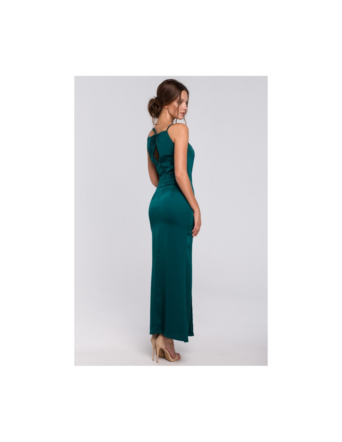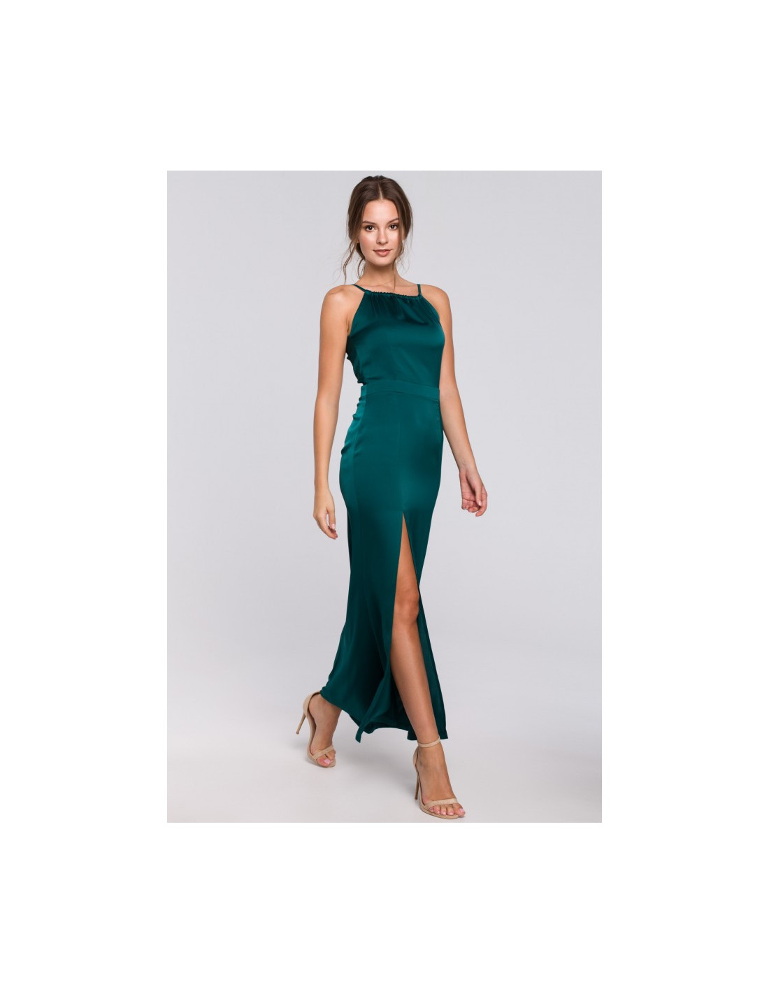 Ultra-feminine halter neck dress. With its longline silhouette and a high front split you will feel sexy and confident. Neckline is adjustable thanks to tie strings in the back.