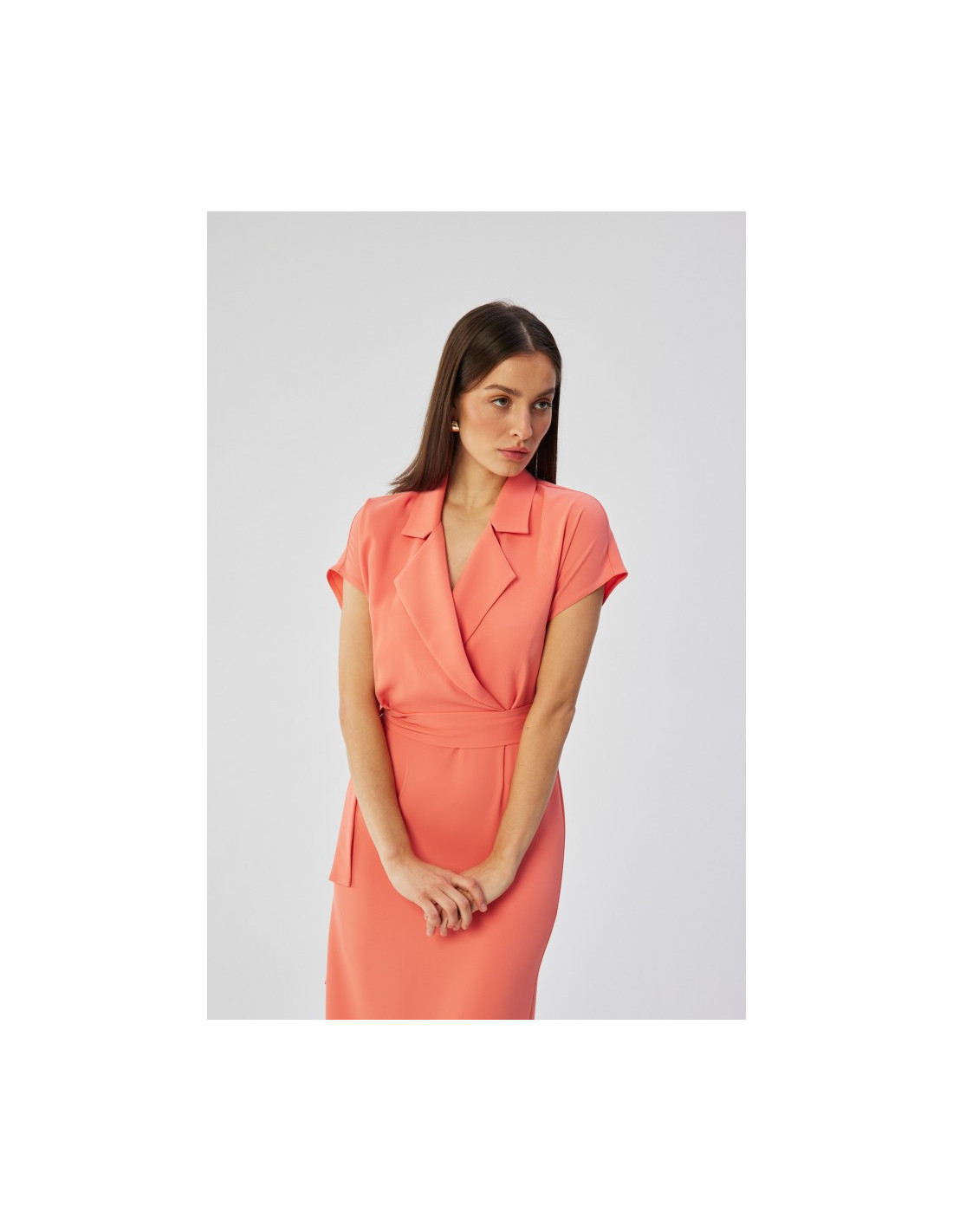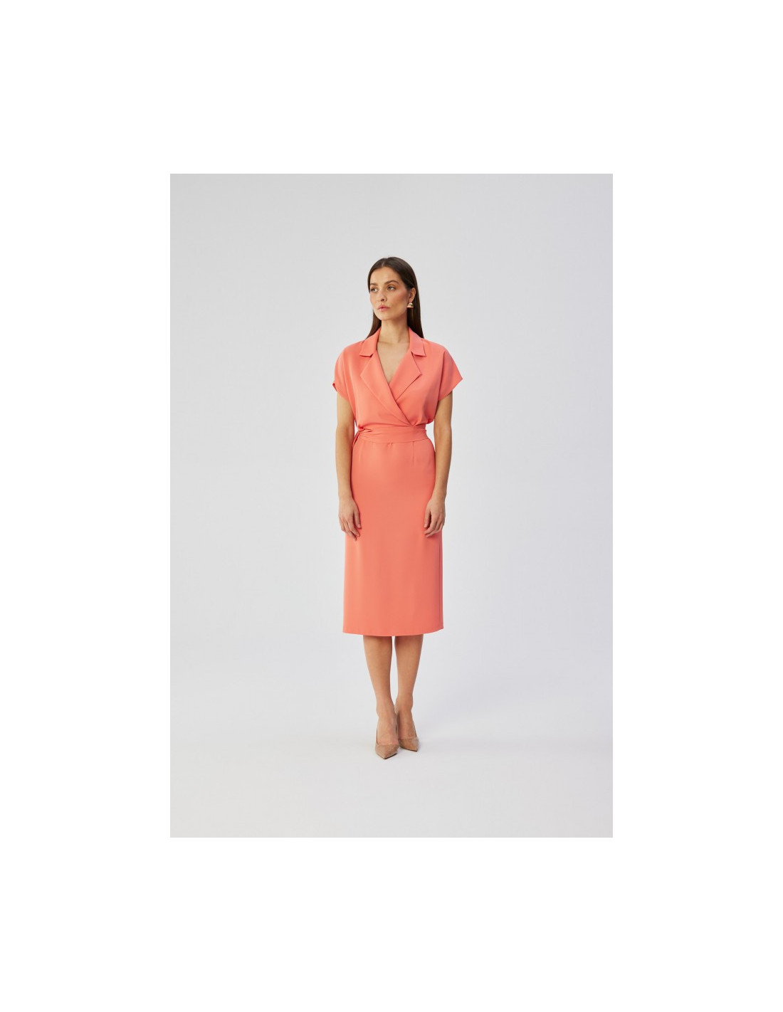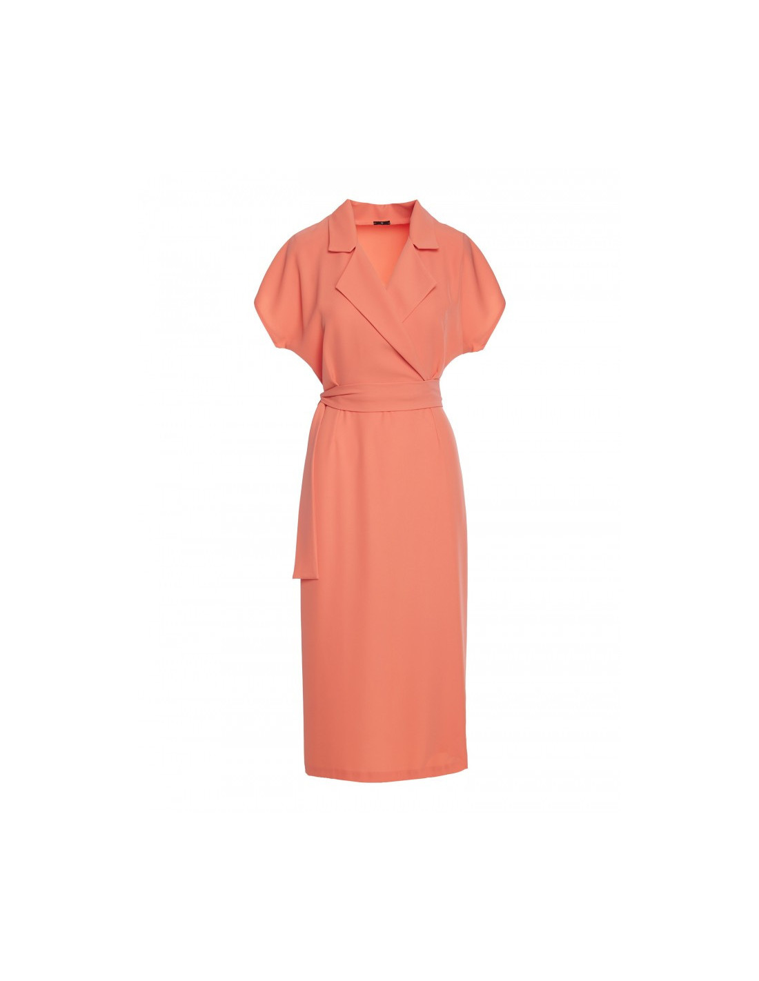 95% polyester 5% elastanase PRODUCT DETAILS:      woven fabric shirt dress with a collar wrap top with short batwing sleeves pencil mid length skirt partially elasticated waist below knee length kick split in the back unlined tie belt attached our model is 174 cm tall and wears size S designed and made in Poland