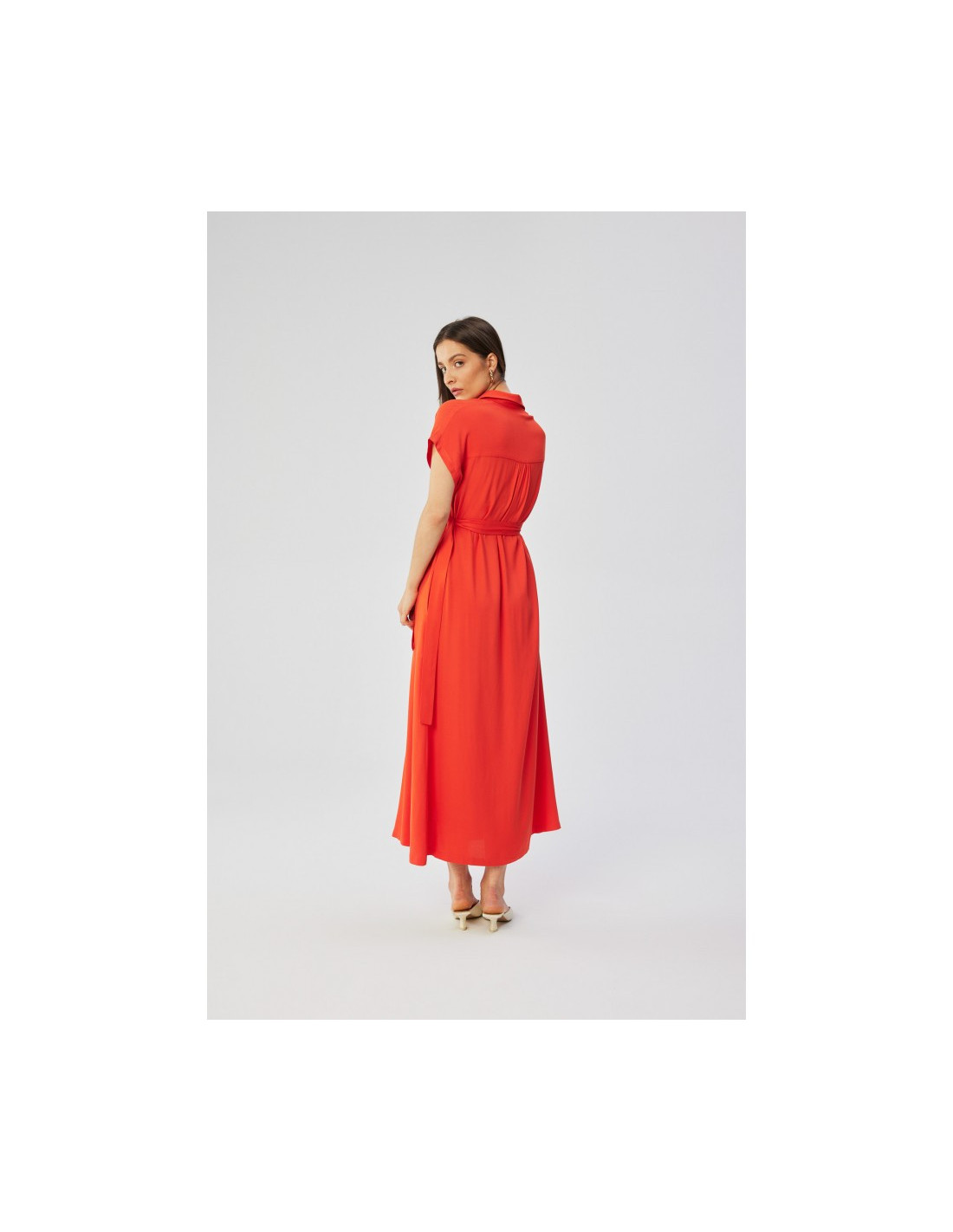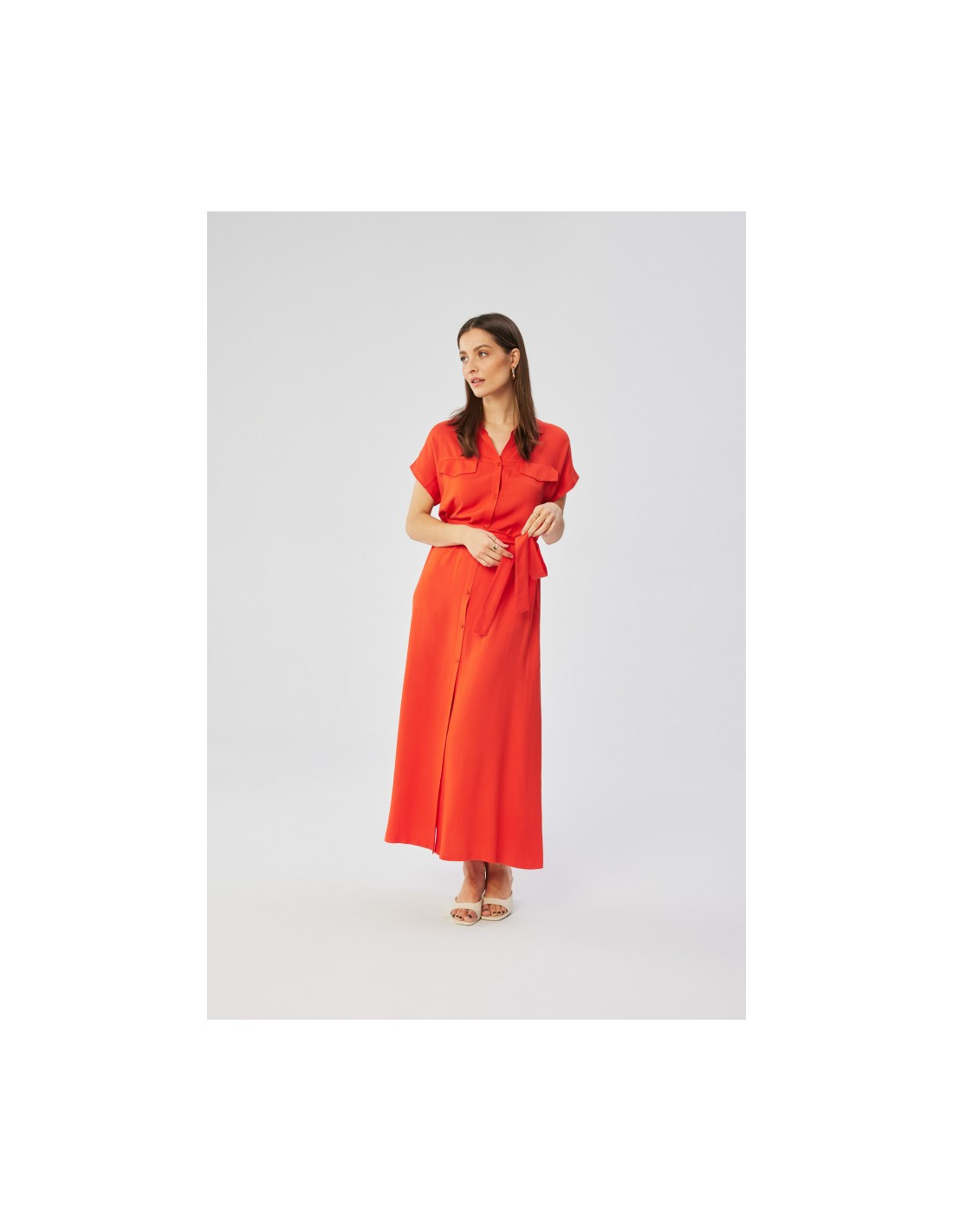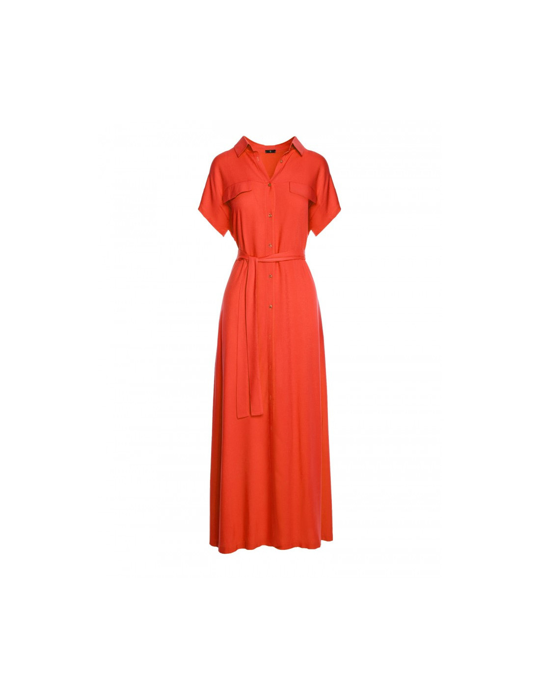 100% viscose PRODUCT DETAILS:      woven fabric 100% viscose button down dress with a collar  A-line design with flapped faux pockets in the front  tie belt  short sleeves maxi length unlined our model is 174 cm tall and wears size S designed and made in Poland