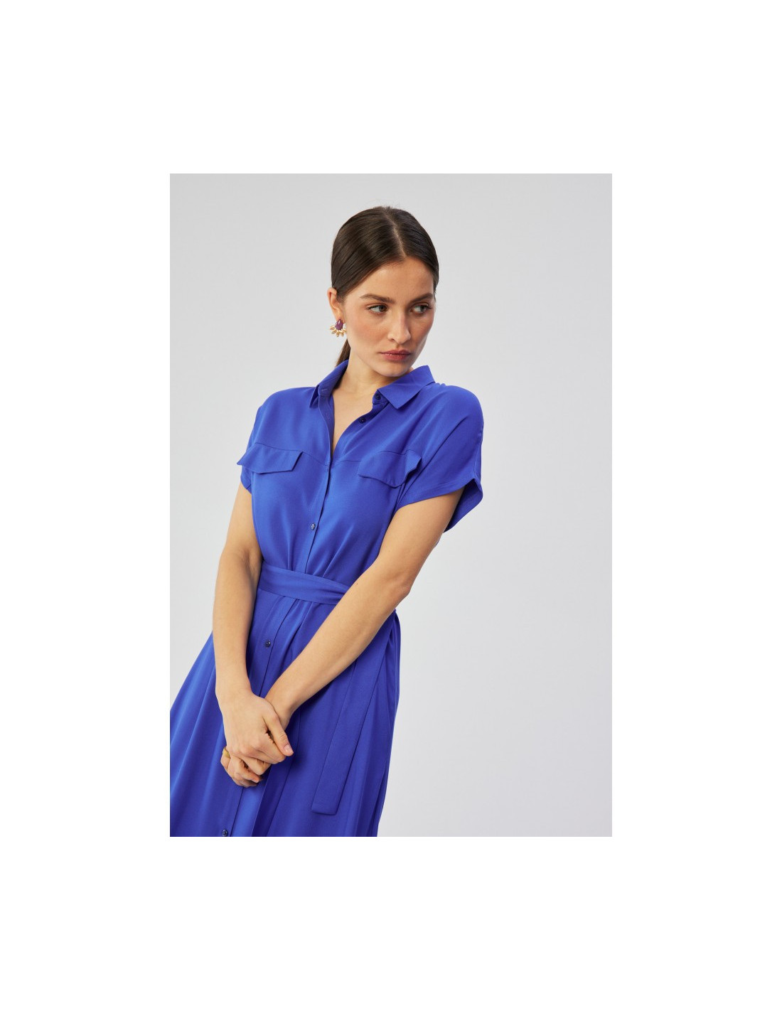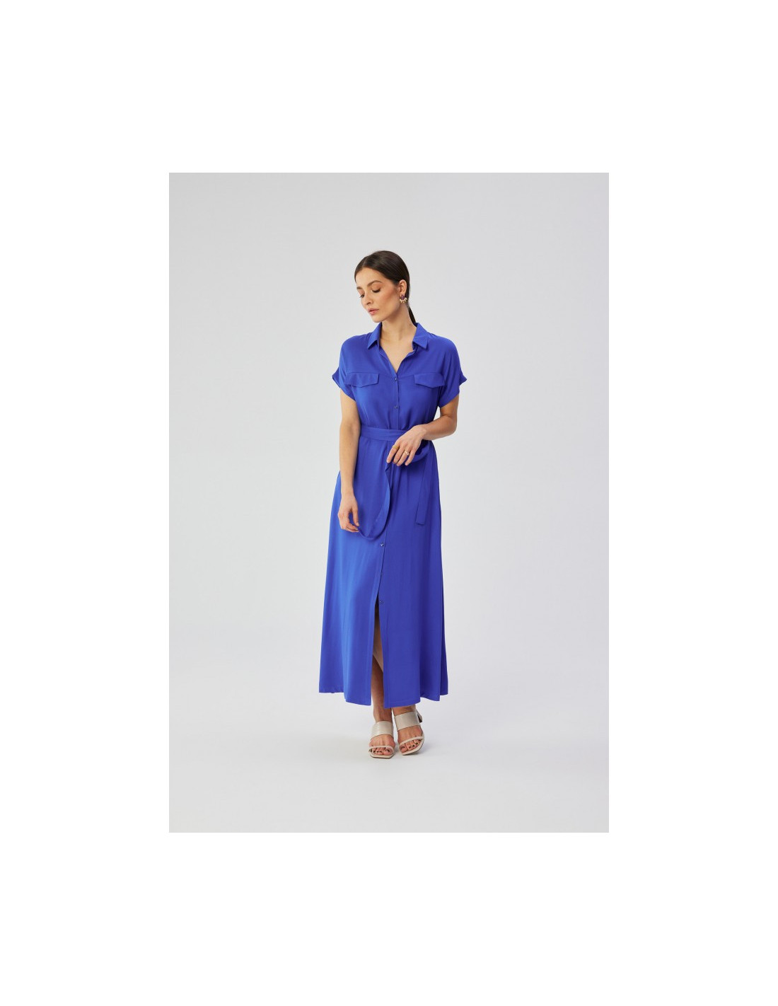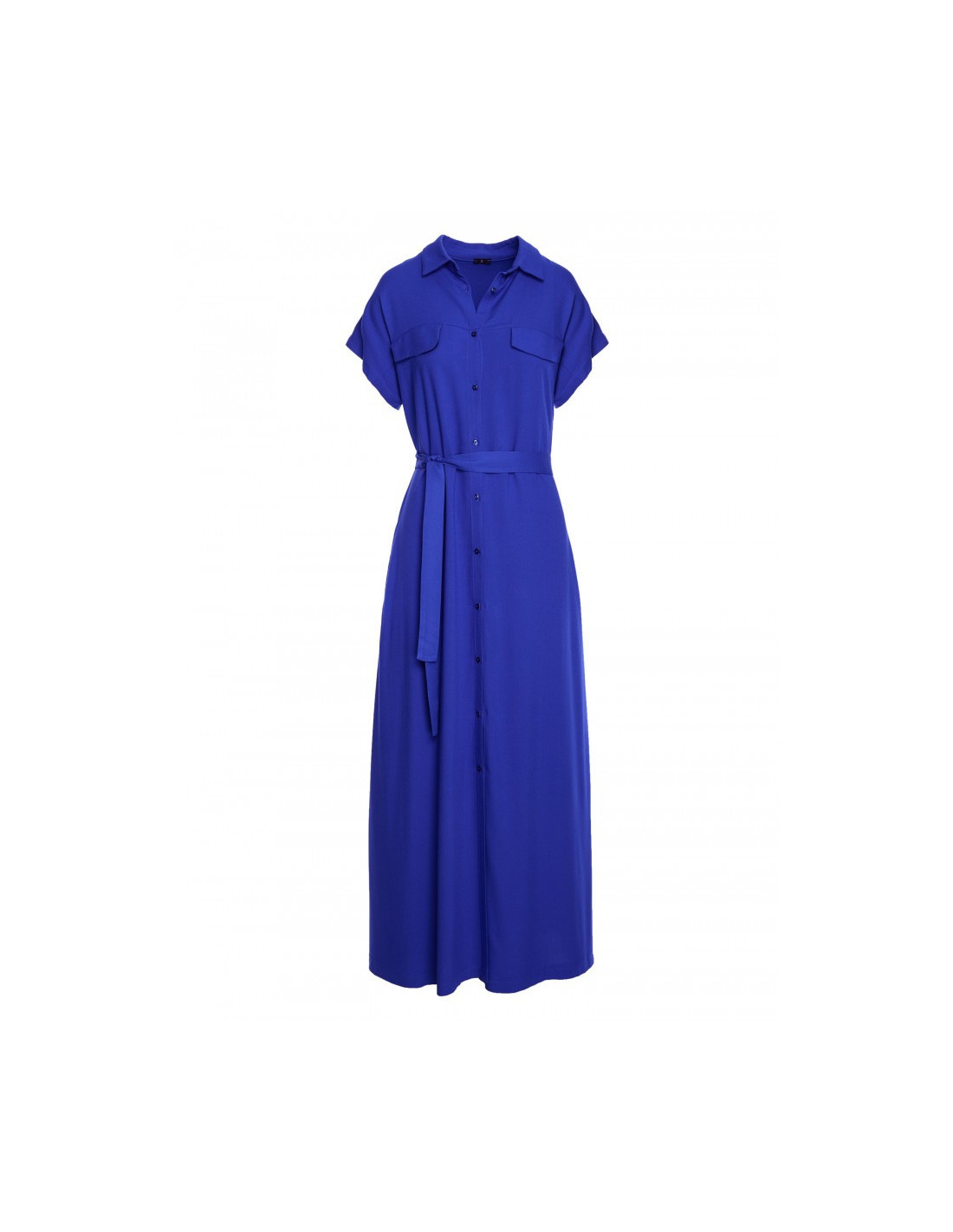 100% viscose PRODUCT DETAILS:      woven fabric 100% viscose button down dress with a collar  A-line design with flapped faux pockets in the front  tie belt  short sleeves maxi length unlined our model is 174 cm tall and wears size S designed and made in Poland