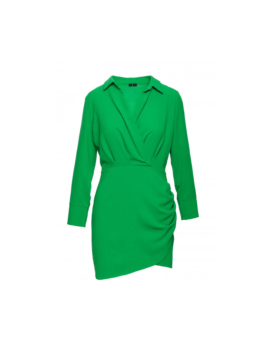 95% polyester 5% elastanase PRODUCT INFORMATION: woven crepe fabric mini length shirt dress wrap top with a V-neck and a collar long sleeves with buttoned cuffs  wrap fitted skirt with ruched side hidden side zip unlined our model is 171 cm tall and wears size S designed and made in Poland