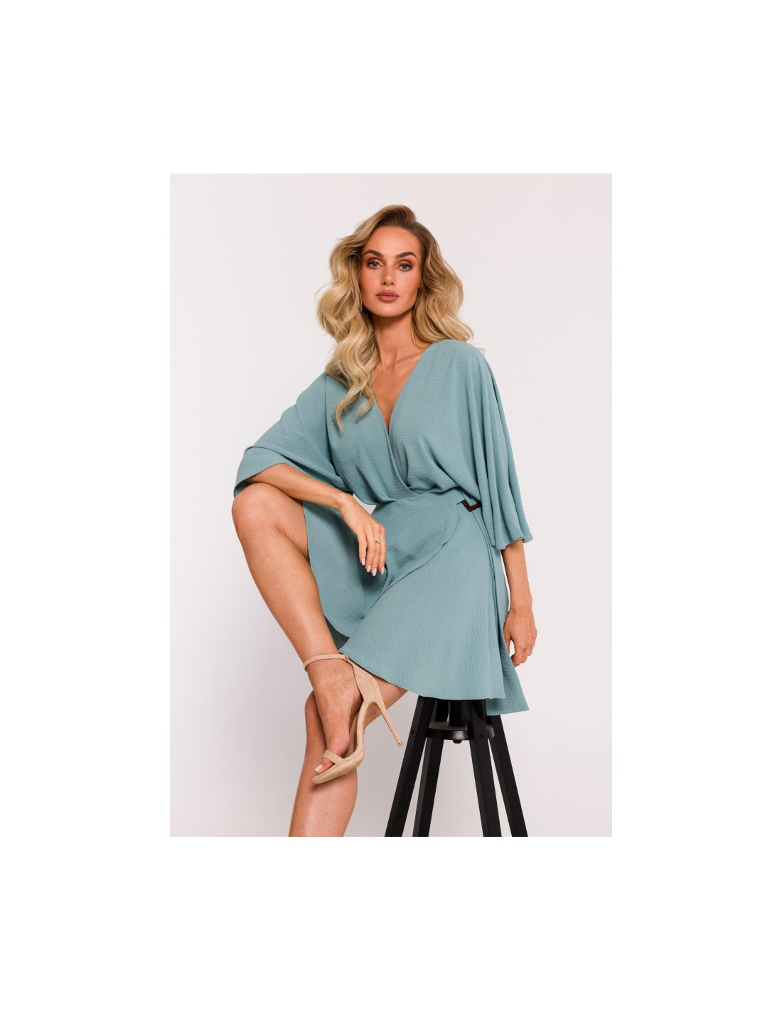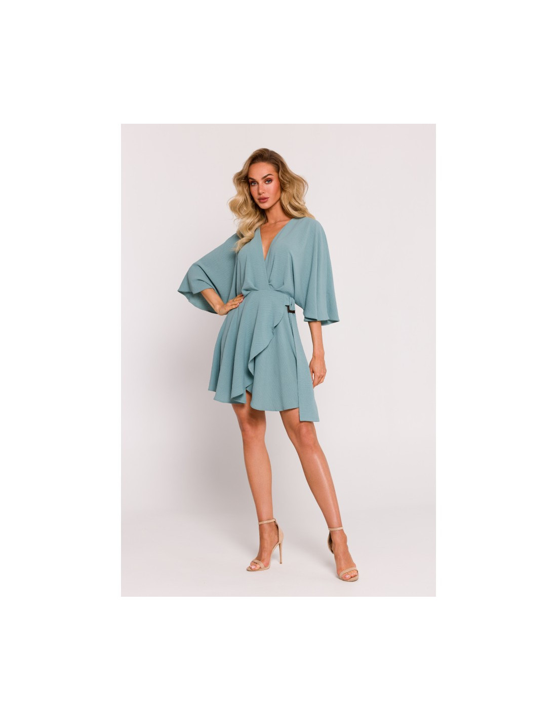 95% polyester 5% elastanase PRODUCT INFORMATION: woven crepe fabric mini length dress with a tie detail in the  neckline ruched front finished with a ruffle short elasticated sleeves hidden back zip unlined our model is 171 cm tall and wears size S designed and made in Poland