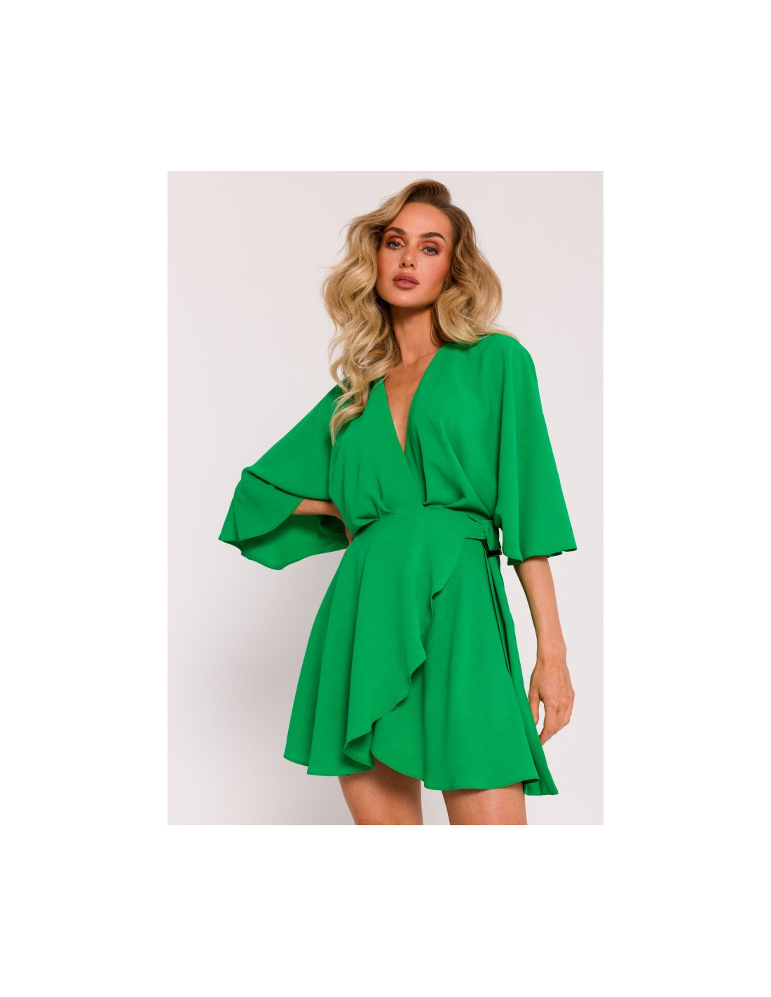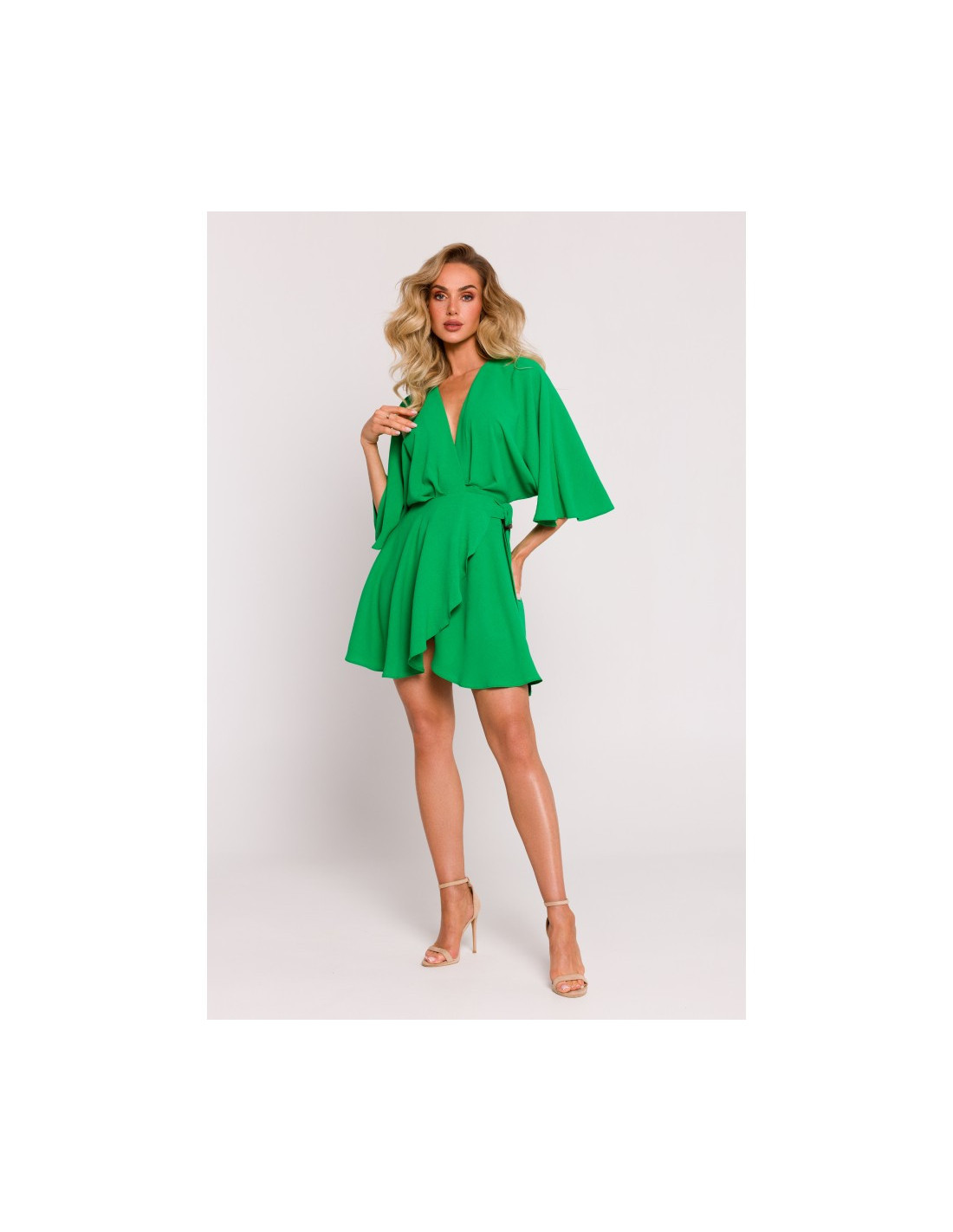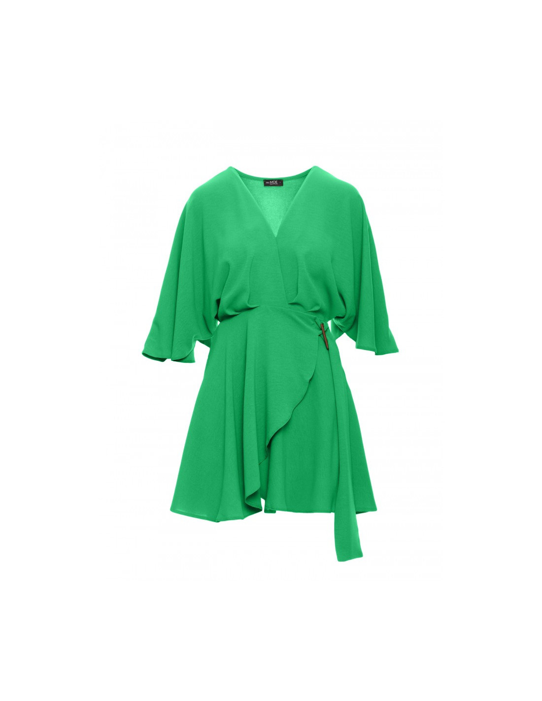 95% polyester 5% elastanase PRODUCT INFORMATION: woven crepe fabric mini length dress with a tie detail in the  neckline ruched front finished with a ruffle short elasticated sleeves hidden back zip unlined our model is 171 cm tall and wears size S designed and made in Poland