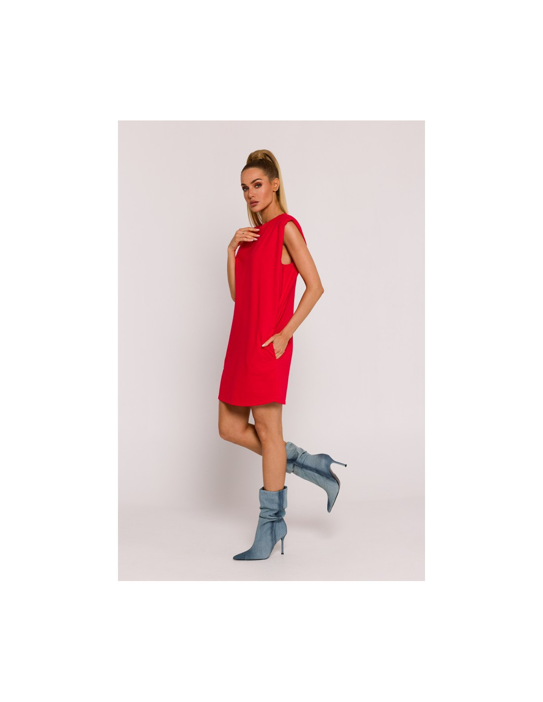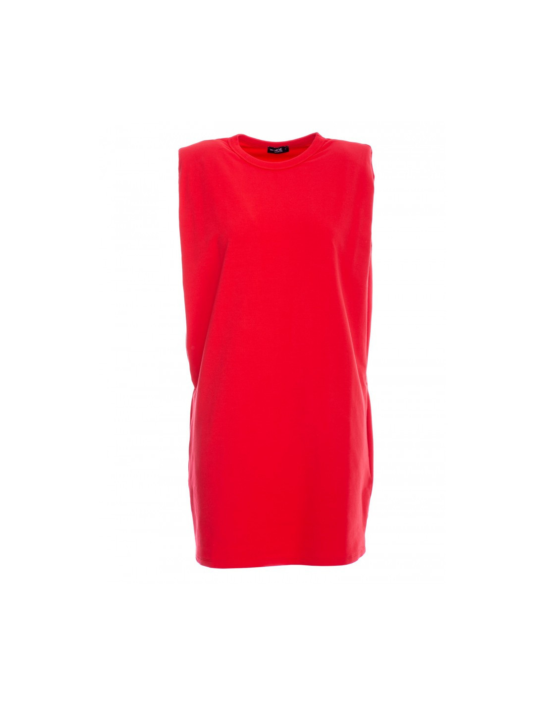 92% cotton 8% elastanase PRODUCT INFORMATION: knit fabric oversized mini dress pulled over the head sleeveless design with padded shoulders in-seam side pocktes decorative logo badge in the back unlined our model is 171 cm tall and wears size S designed and made in Poland