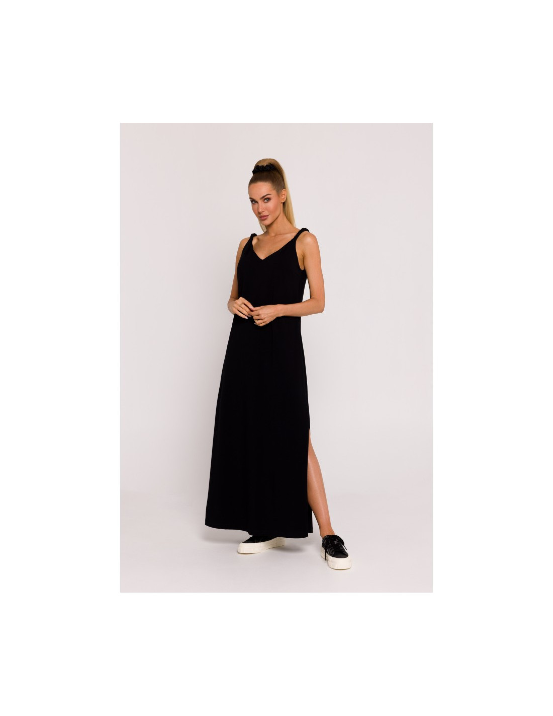 92% cotton 8% elastanase PRODUCT INFORMATION: knit fabric oversized A-line maxi dress pulled over the head twisted shoulder straps V-shaped neckline in the front and a plunging V neckline in the back decorative logo badge in the back unlined our model is 171 cm tall and wears size S designed and made in Poland