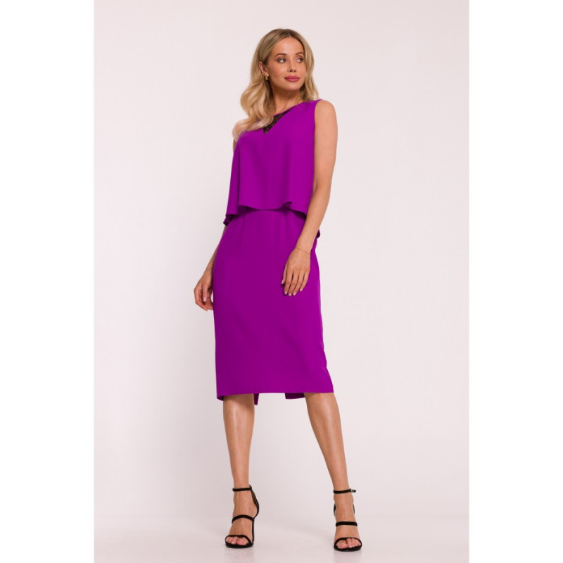 Suknelės S360 Sheath dress with wrap neckline - violet MOE MO_13272 65% polyester 30% viscose 5% elastanase PRODUCT DETAILS: woven fabric pencil sleeveless dress wrap neckline with rounded hems above knee length kick split in the back unlined hidden back zip our model is 176 cm tall and wears size S designed and made in Poland Į krepšelį