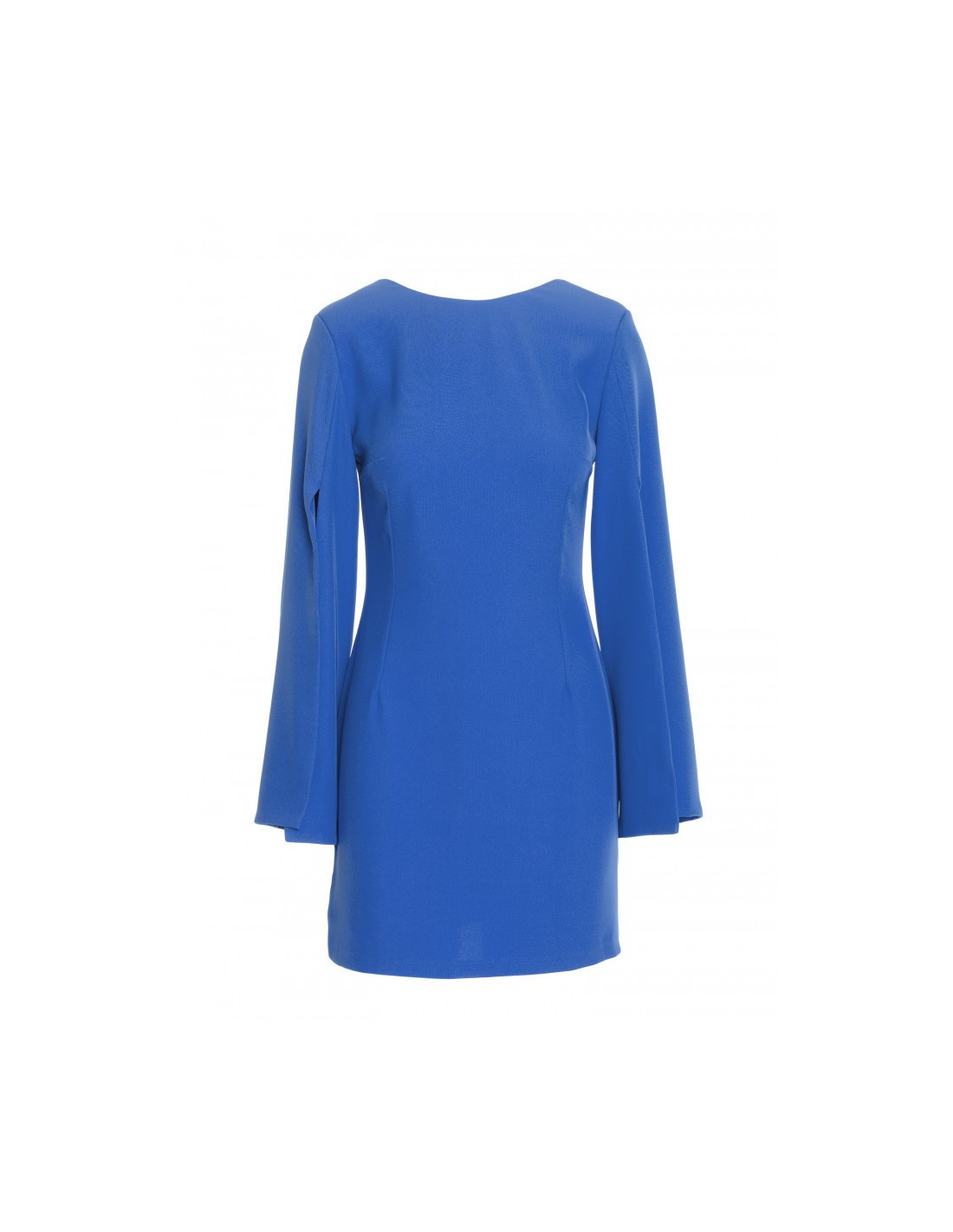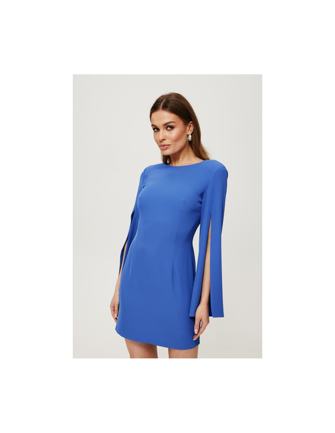 95% polyester 5% elastanase PRODUCT DETAILS:      woven fabric mini dress with subtle cutout on the side in the bottom hem rounded neck in the front V-neck in the back hidden back zip wide sleeves with high splits unlined our model is 174 cm tall and wears size S designed and made in Poland