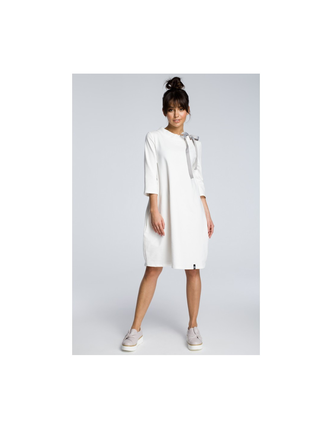 B070 Marškininė suknelė su kaklo raišteliu - ecru spalvos