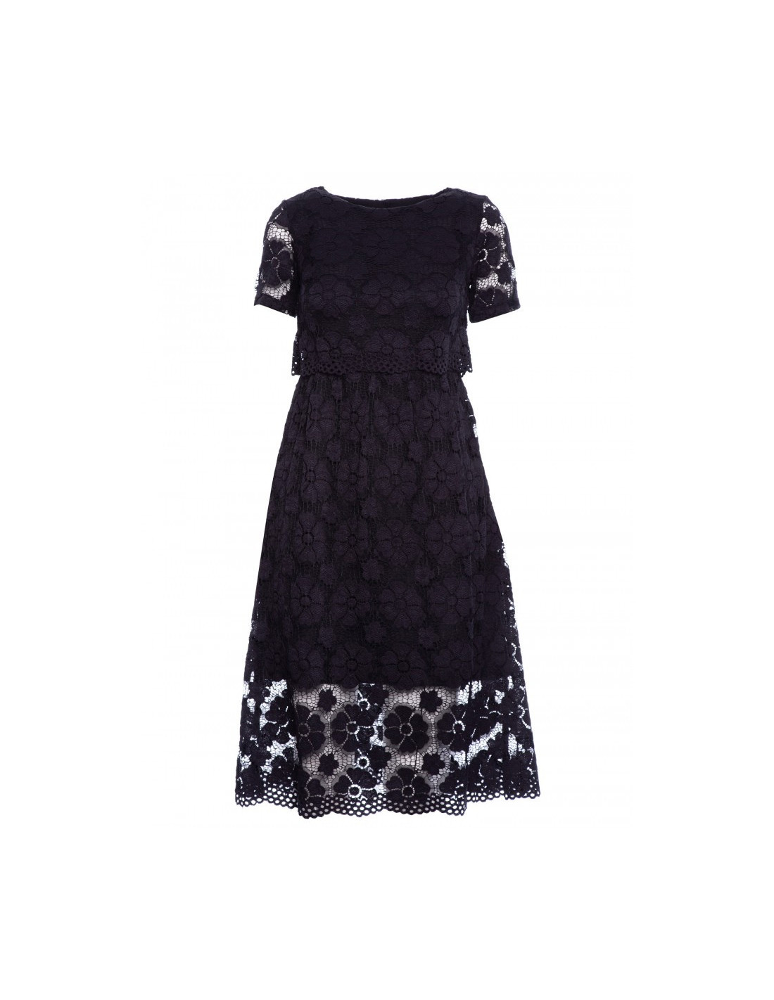 Žavėsite aplinkinius vilkėdama šią unikalią, romantišką suknelę su nėriniuota trumpa viršutine dalimi ir mini ilgio sijonu. Elegantiškas gėlių nėrinių raštas yra pamušalas iš tos pačios spalvos audinio.