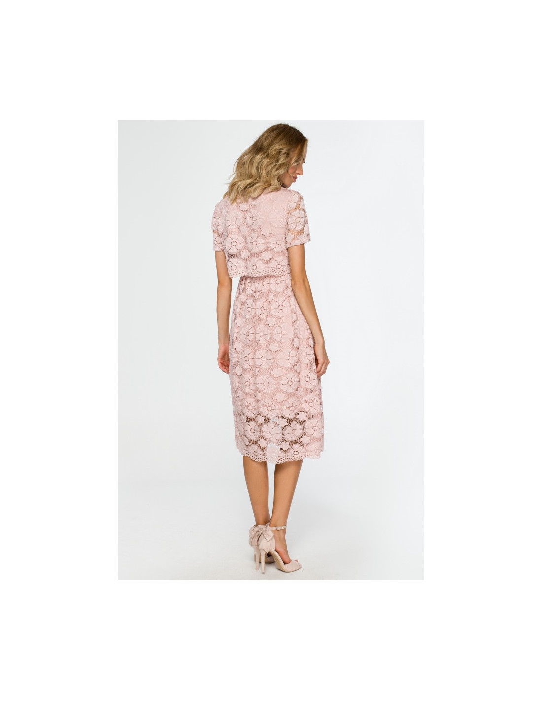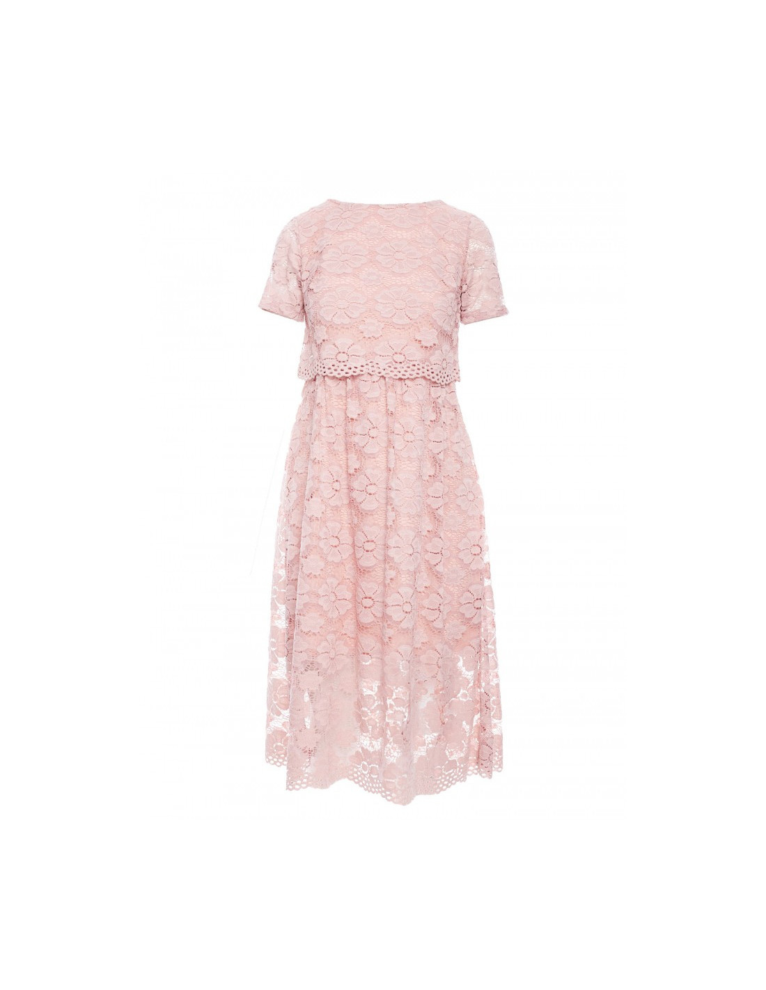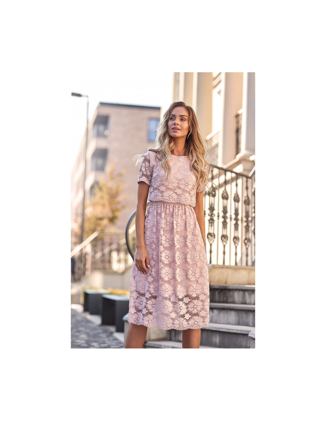 Žavėsite aplinkinius vilkėdama šią unikalią, romantišką suknelę su nėriniuota trumpa viršutine dalimi ir mini ilgio sijonu. Elegantiškas gėlių nėrinių raštas yra pamušalas iš tos pačios spalvos audinio.