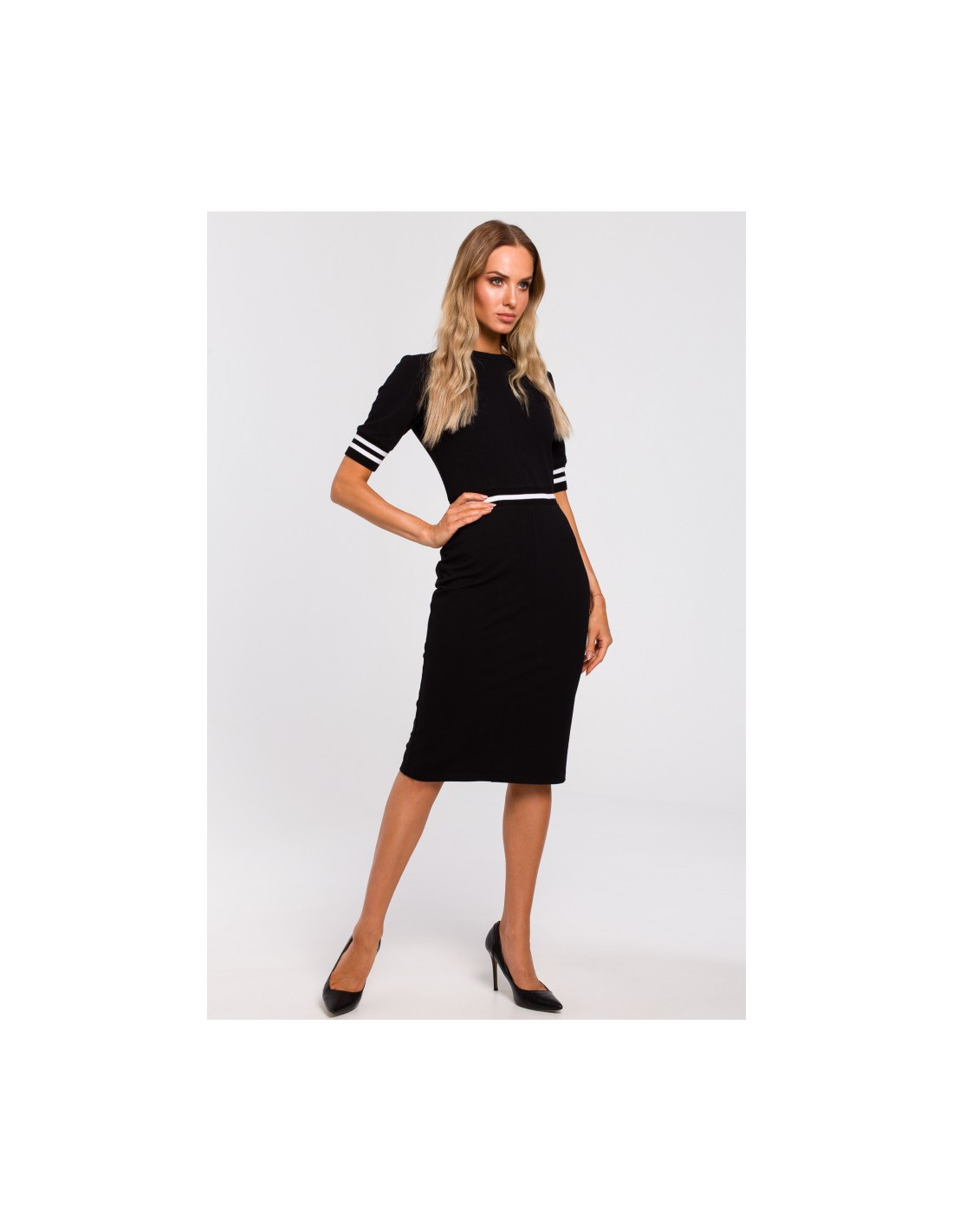 Elegancija su moderniu prieskoniu - paprasta suknelė su dviejų atspalvių raišteliais ties liemeniu ir briaunuotu kraštu rankovių apačioje, skirta išradingoms ir madingoms moterims.