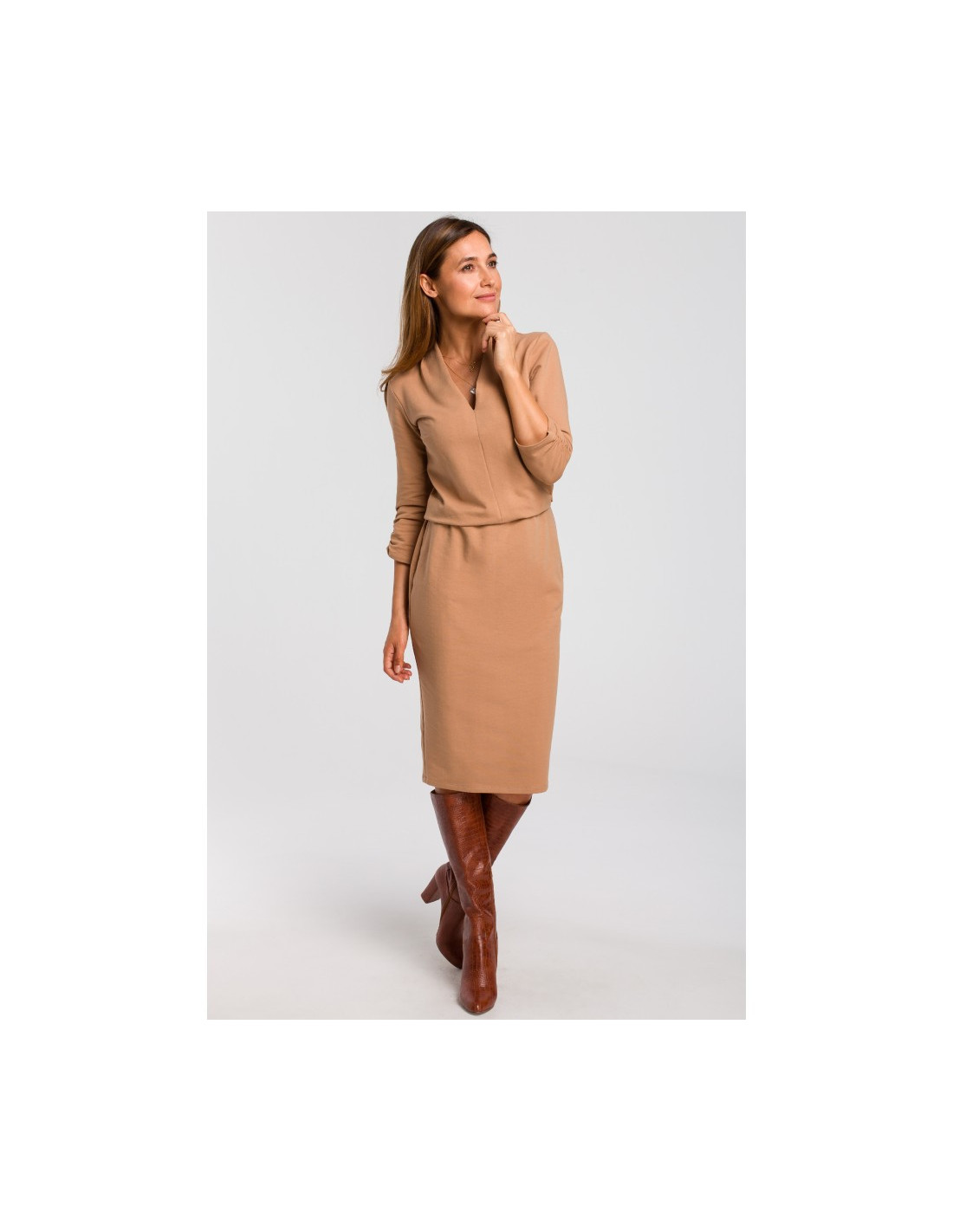 Ši unikali klasikinio kirpimo suknelė su iškirpte ir elastiniu liemeniu pasiūta iš medvilninio trikotažo, todėl ja jausitės laisvai ir patogiai net po ilgos darbo dienos.