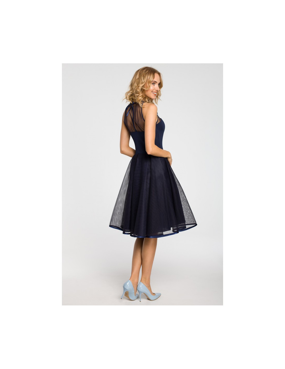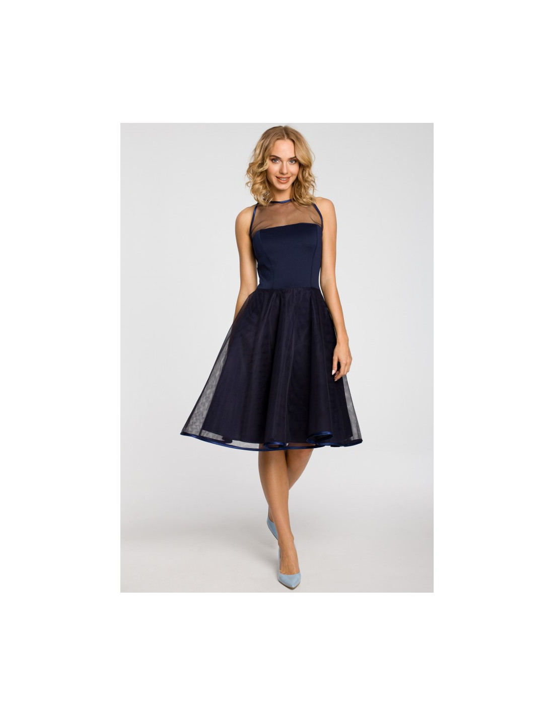 Vakarinė suknelė, nukirpta ties liemeniu. Prigludusi viršutinė dalis su tiulio iškirpte, nugaroje surišta aksominiu kaspinėliu. Platėjanti, sluoksniuota apačia su viršutiniu tiulio sluoksniu, užbaigtu atlaso apvadu.