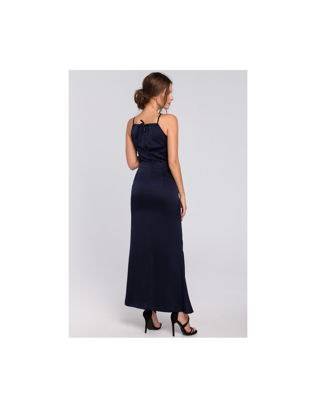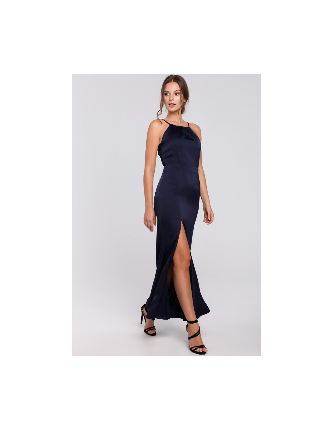 K042 Ilga suknelė su šlaunis siekiančia iškirpte - tamsiai mėlyna
