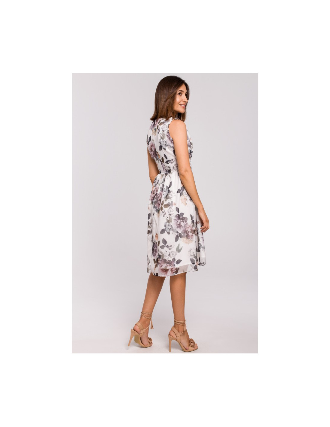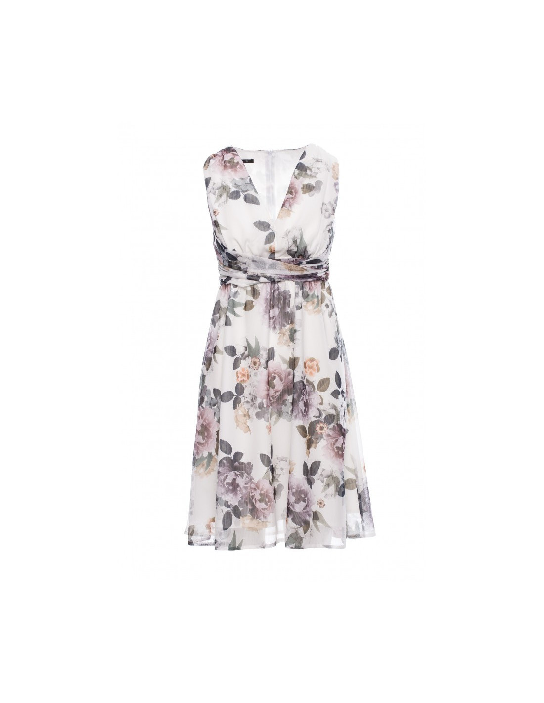 Elegantiška suknelė iš briaunoto šifono su gėlių raštu. Dėl gilios iškirptės ir dekoratyvaus lopo diržo ja sužavėsite įvairiomis progomis.