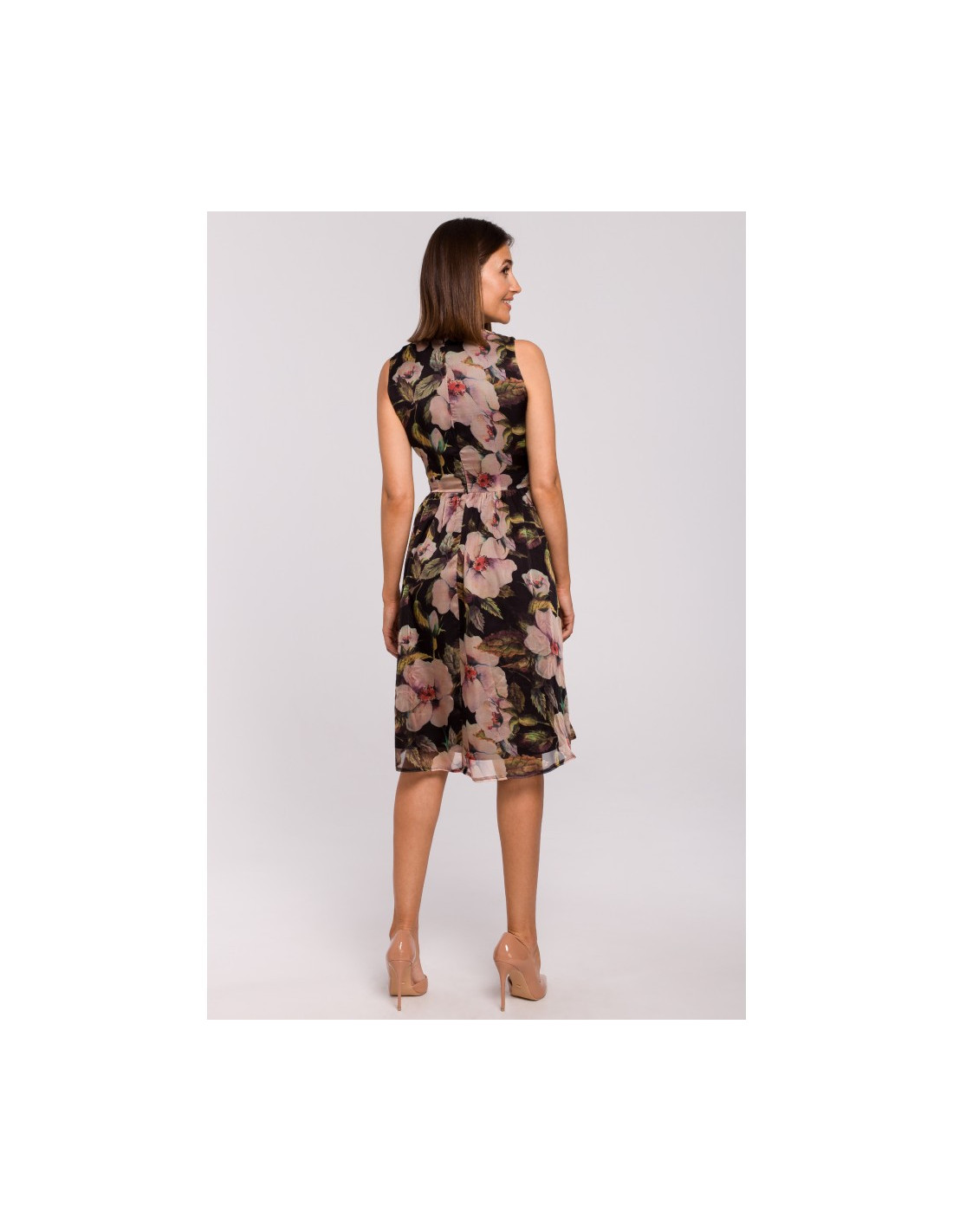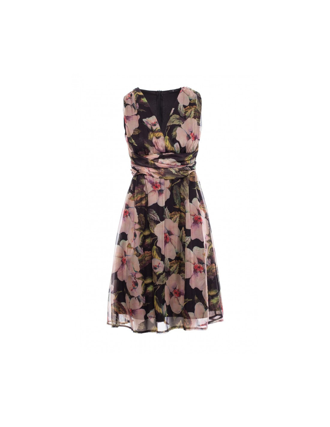 Elegantiška suknelė iš briaunoto šifono su gėlių raštu. Dėl gilios iškirptės ir dekoratyvaus lopo diržo ja sužavėsite įvairiomis progomis.