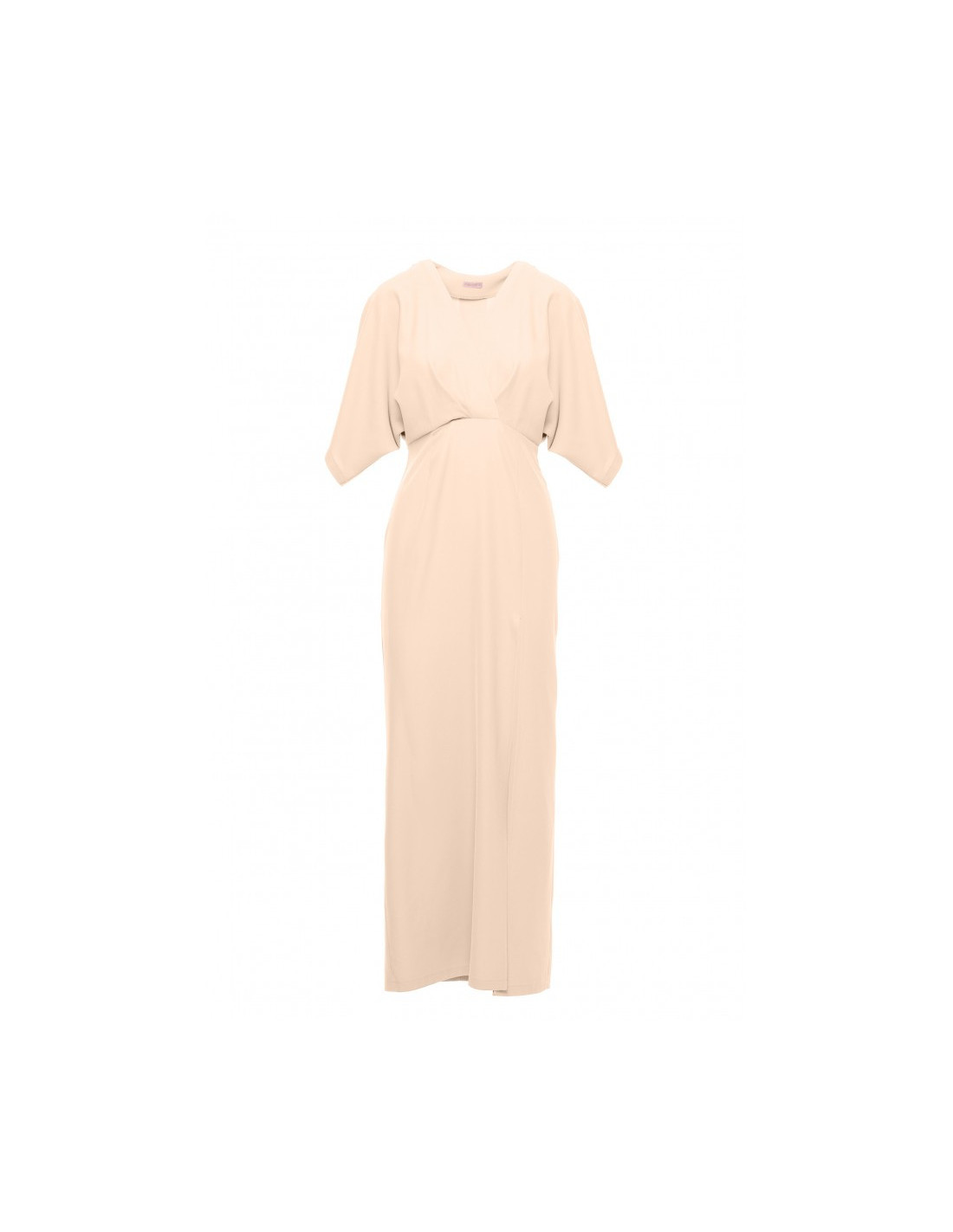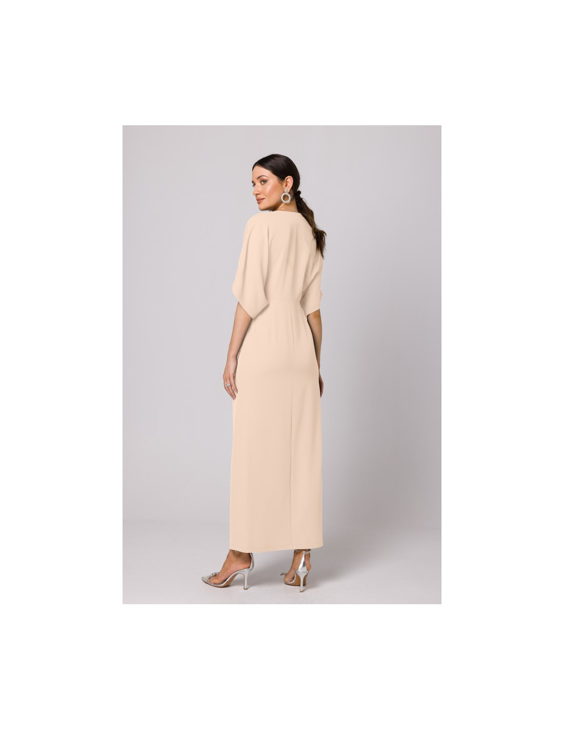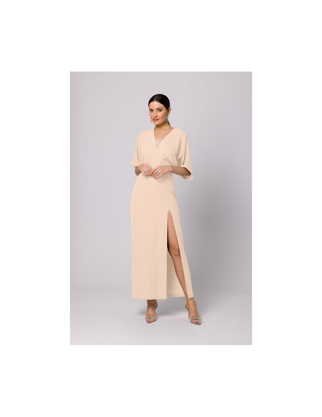 Ši suknelė yra vakarinis drabužis - ilga, su aukšta kojų iškirpte, kimono rankovėmis ir gilia V formos iškirpte.