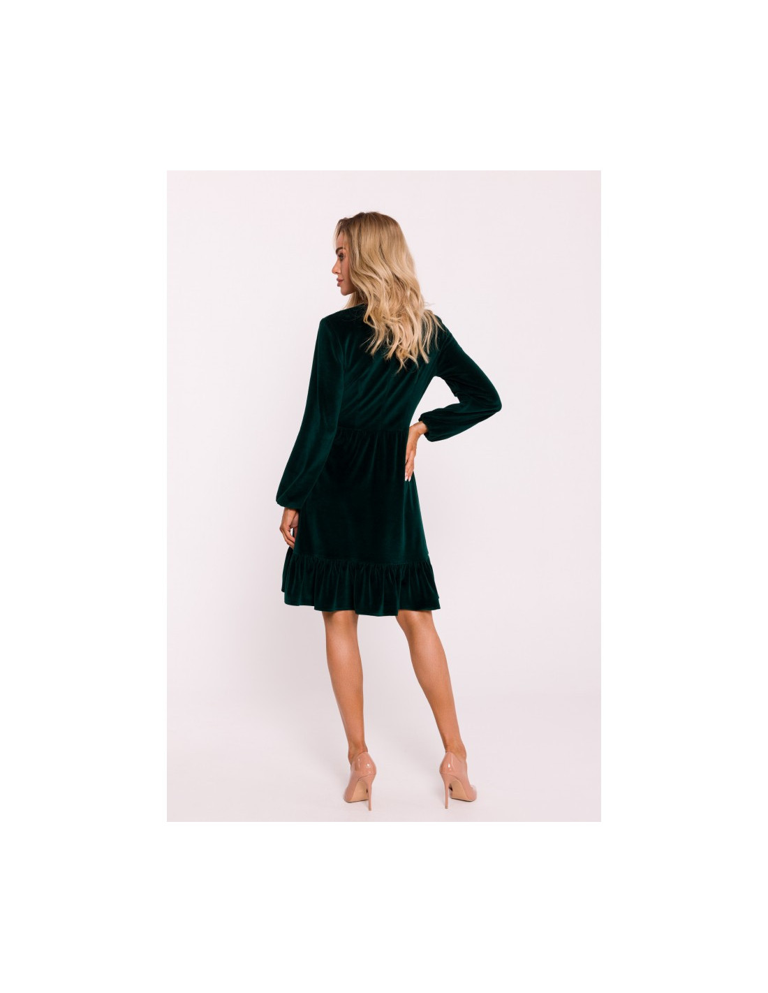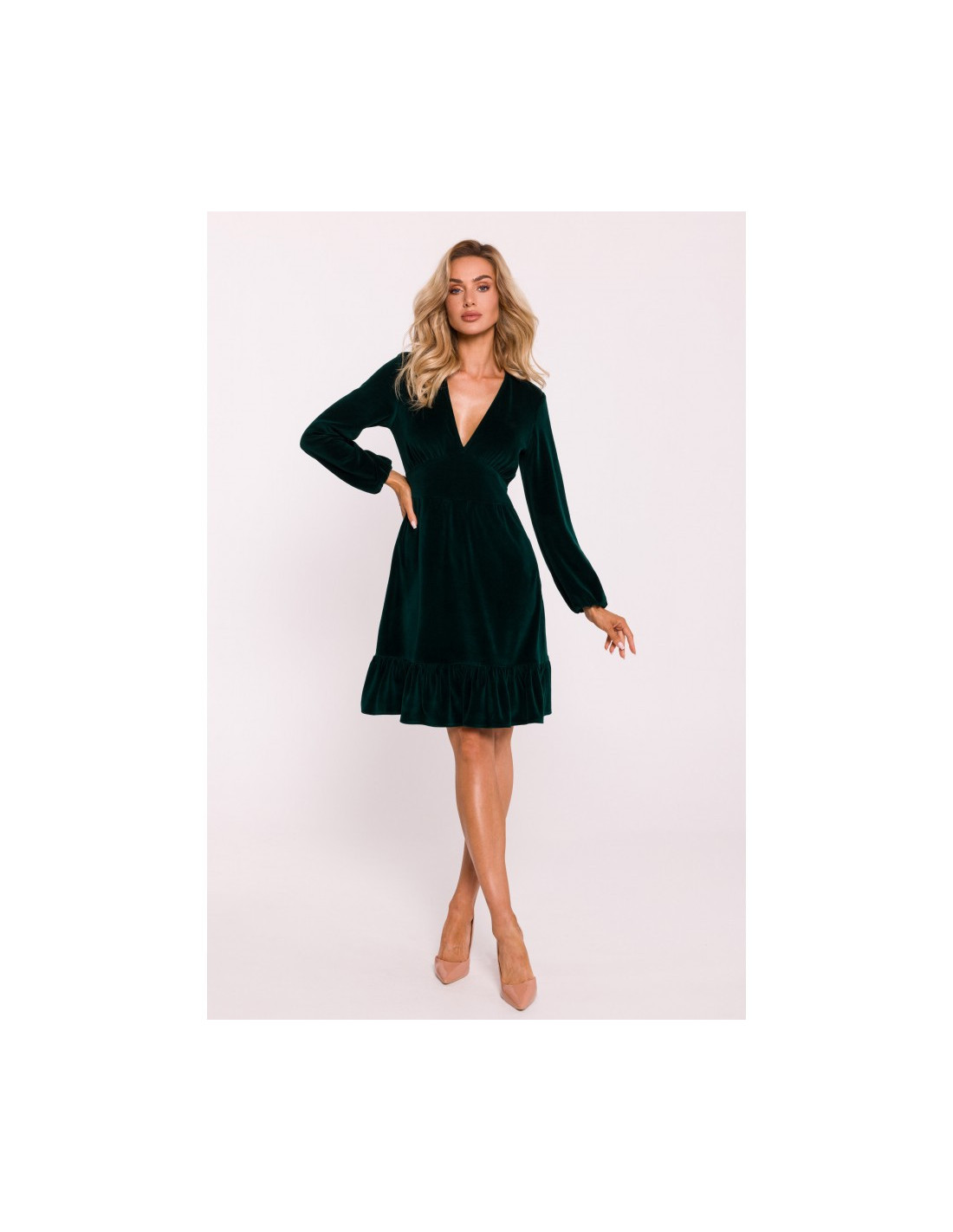 80 % medvilnės 20 % poliesterio INFORMACIJA APIE GAMINĮ: velūro trikotažas suknelė su pabrėžtu liemeniu gili V formos iškirptė ilgos bufetinės rankovės, užbaigtos elastine juosta šiek tiek platėjantis sijonas, užsibaigiantis raukiniais ilgis iki kelių užsegamas užtrauktukas šone be pamušalo mūsų modelis yra 171 cm ūgio ir dėvi S dydį sukurta ir siūta Lenkijoje
