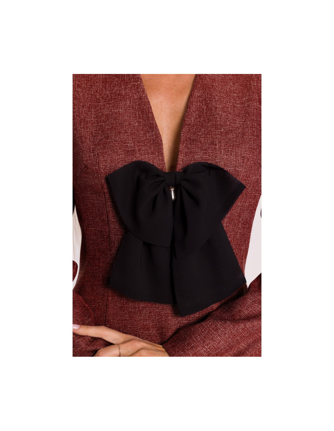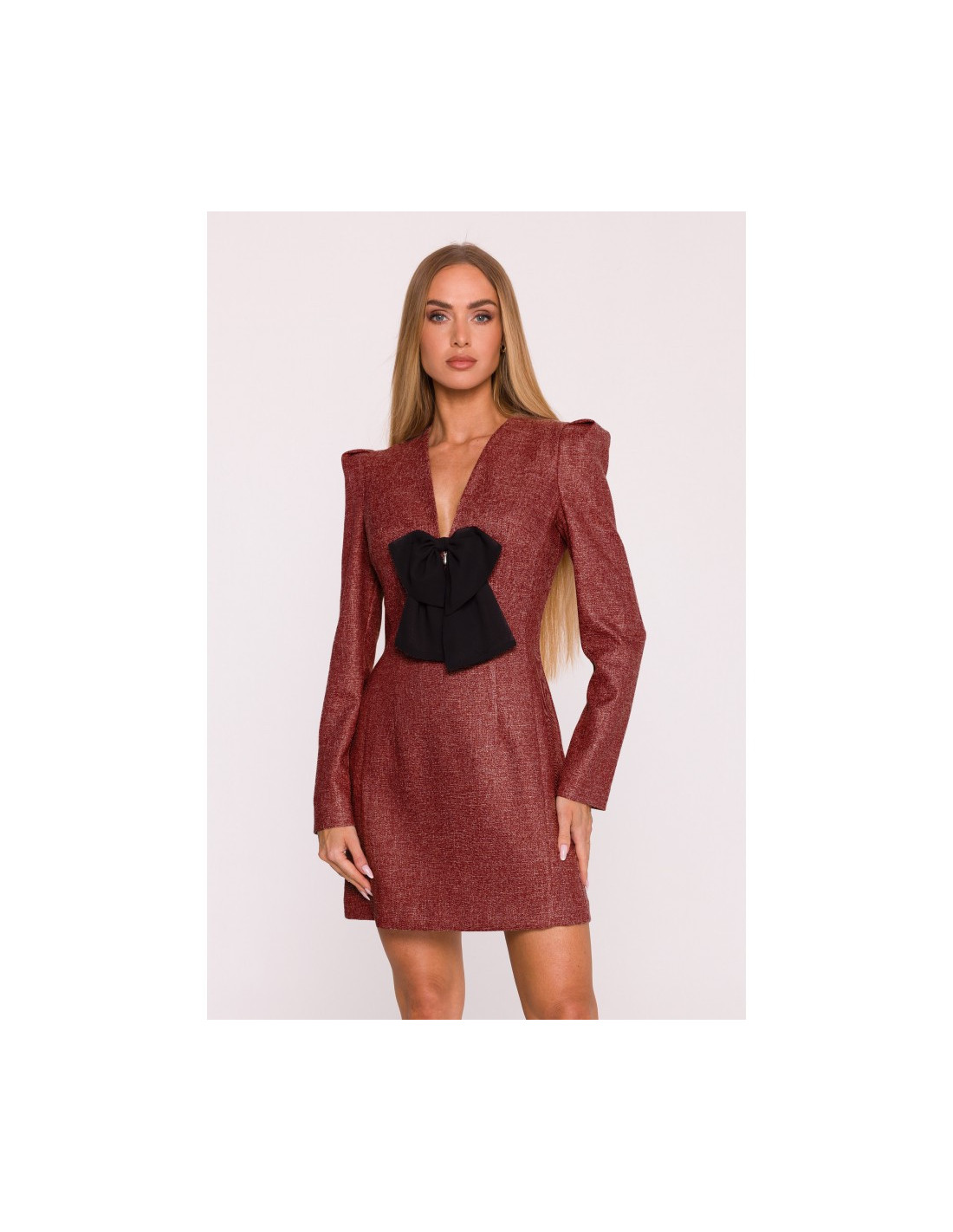 PAGRINDO AUDINYS: 70 % poliesteris 27% viskozės 3% elastano SUKURTAS: 95% poliesteris 5% elastanas MATERIALAS: Medžiaga: tvido audinys INFORMACIJA APIE GAMINĮ: Iškirptė: gili, V formos Rankovės: ilgos Užsegimas: paslėptas užtrauktukas nugaroje Kišenės: nėra Pamušalas: taip Modelis: melanžas Priedai: dekoratyvinis šifono lankelis su papuošalu pakabuku Modelis: M869 Sukurta ir siūta Lenkijoje Nuotraukoje pavaizduotas modelis yra 171 cm ūgio, dėvi S dydžio drabužius MADA IR KIRPIMAS: Kirpimas: šiek tiek prigludęs Forma: pabrėžiamas liemuo, šiek tiek praplatinti pečiai su bufetais Ilgis: mini
